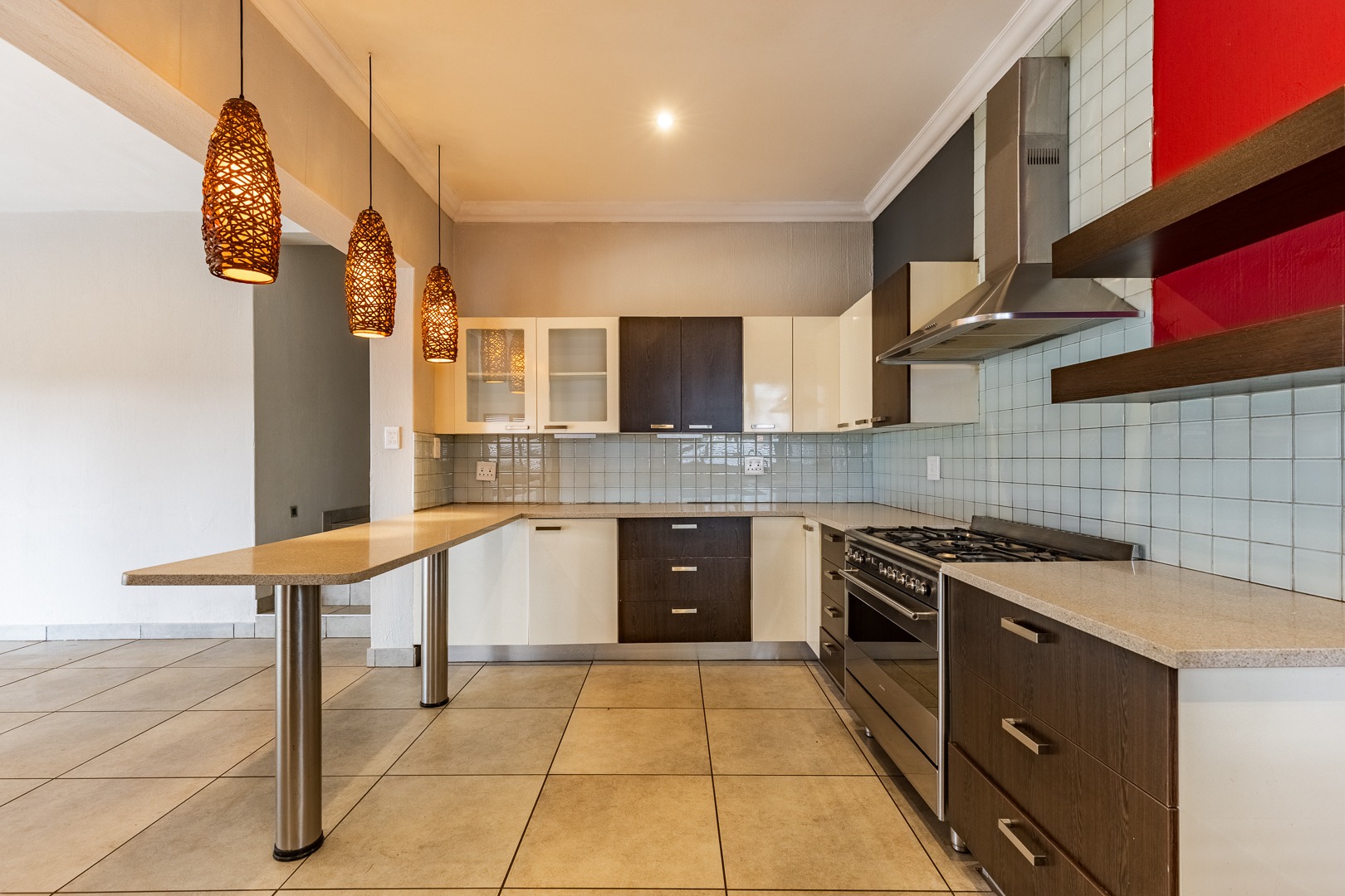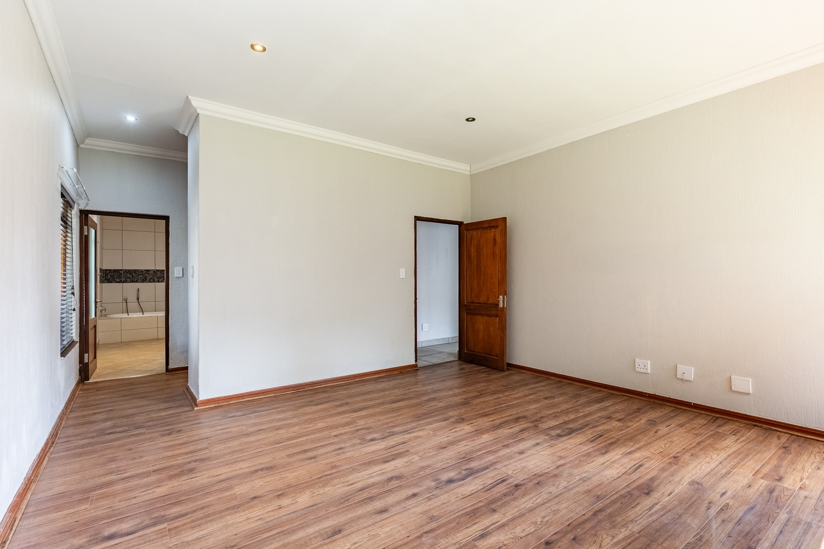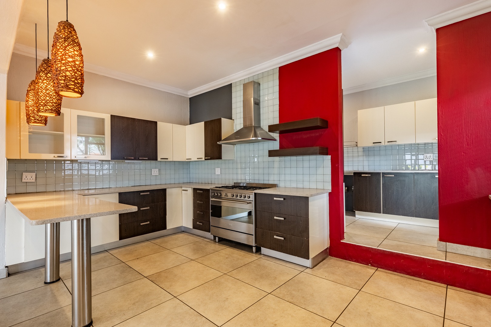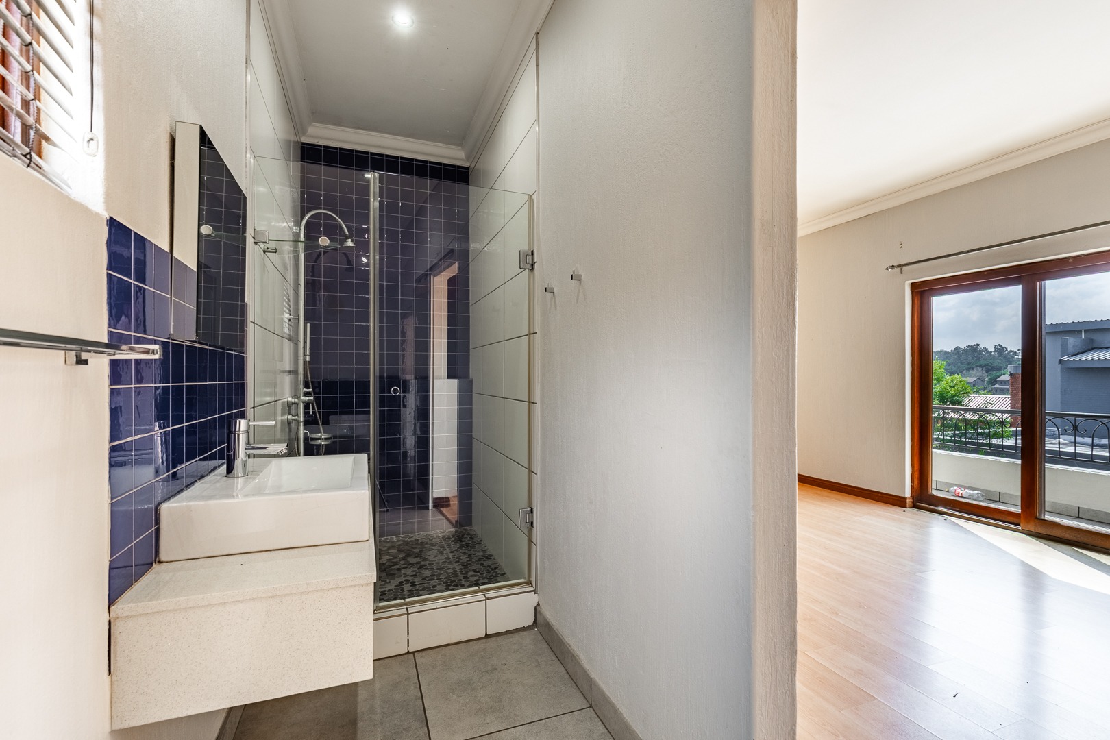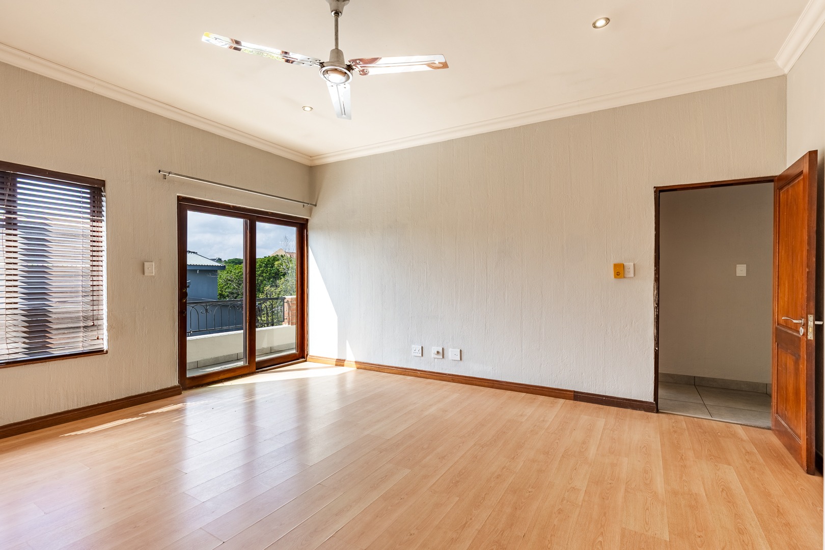 As you enter the home, you are welcomed into a light-filled open-plan lounge and dining area, seamlessly connected to a modern kitchen that overlooks the living space. The lounge and dining area open out through stacker doors to a well-maintained garden, creating an effortless indoor-outdoor flow. The outdoor space features a covered patio, ideal for entertaining, overlooking a sparkling swimming pool. The kitchen is stylish and functional, offering ample cupboard space and a separate scullery for added convenience. Downstairs, the home offers two well-sized bedrooms, a guest bathroom, and a separate toilet—ideal for family living or accommodating visitors. The spacious main bedroom is a true retreat, complete with a walk-in cupboard and a large full en-suite bathroom. Upstairs, you will find two additional generously sized bedrooms, both opening onto a balcony. One of these bedrooms includes its own en-suite bathroom with a shower.