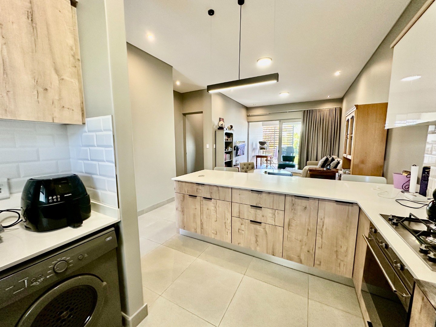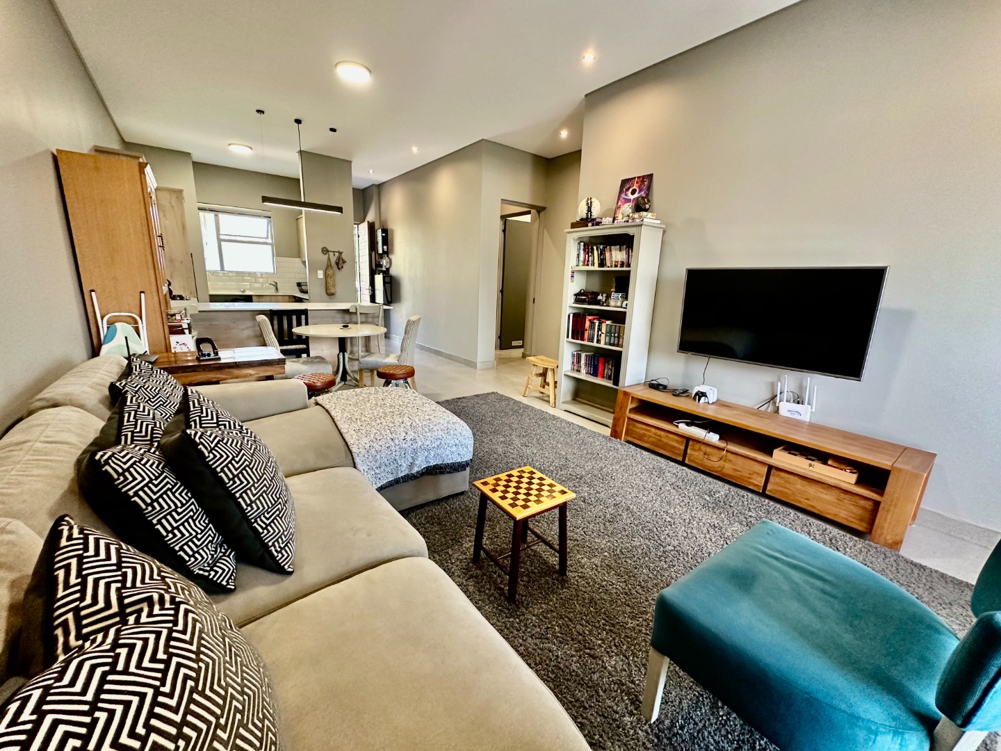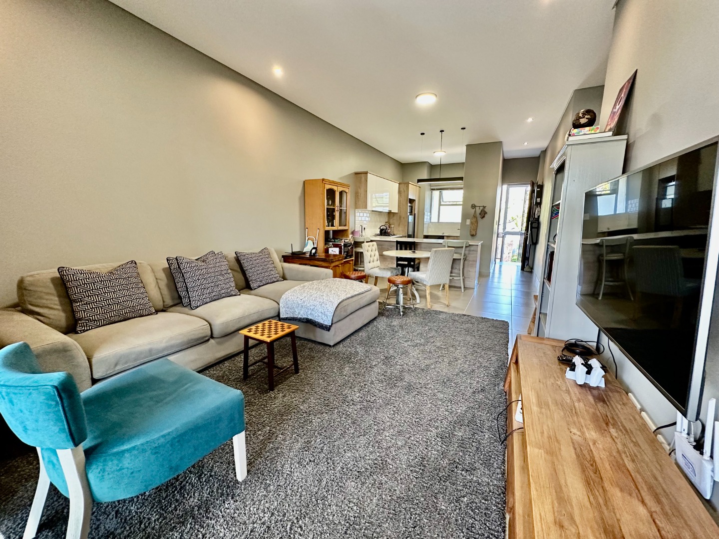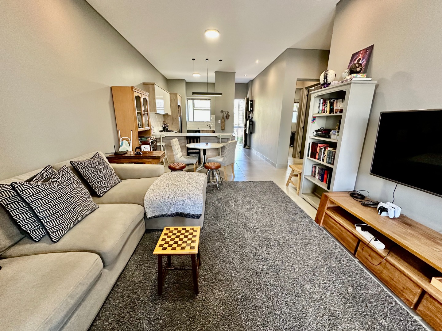 The open-plan kitchen is fitted with ample cupboard space and a gas hob, flowing seamlessly into the dining area and TV lounge, which opens onto a covered patio with a built-in braai — perfect for entertaining all year round.