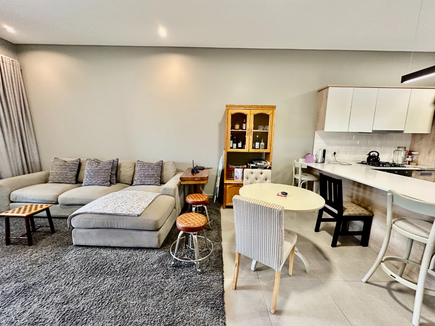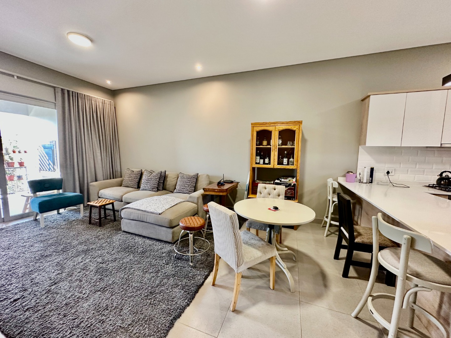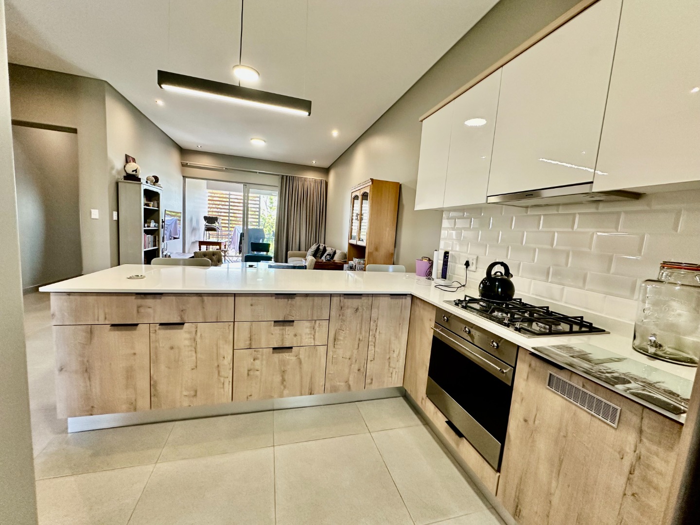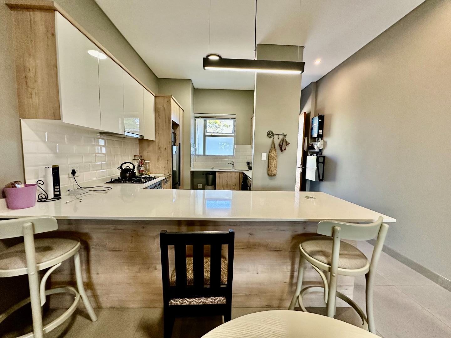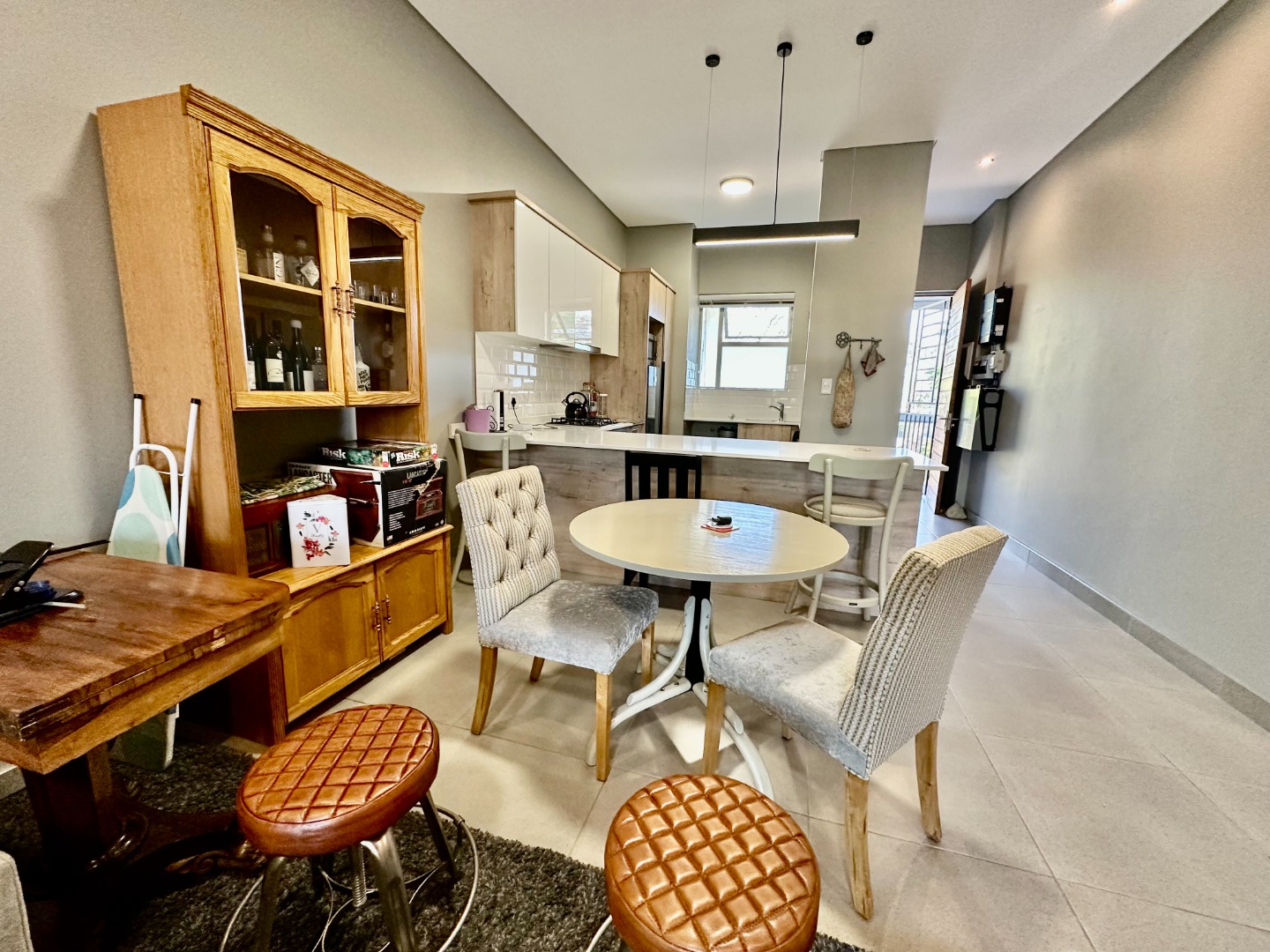 The open-plan kitchen is fitted with ample cupboard space and a gas hob, flowing seamlessly into the dining area and TV lounge, which opens onto a covered patio with a built-in braai — perfect for entertaining all year round.