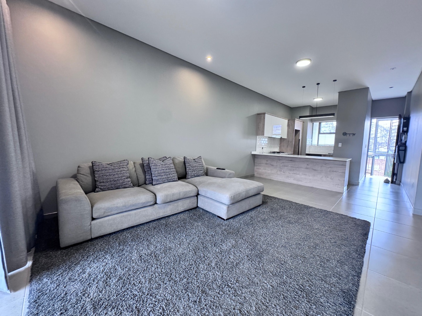 The open-plan kitchen is fitted with ample cupboard space and a gas hob, flowing seamlessly into the dining area and TV lounge, which opens onto a covered patio with a built-in braai — perfect for entertaining all year round.