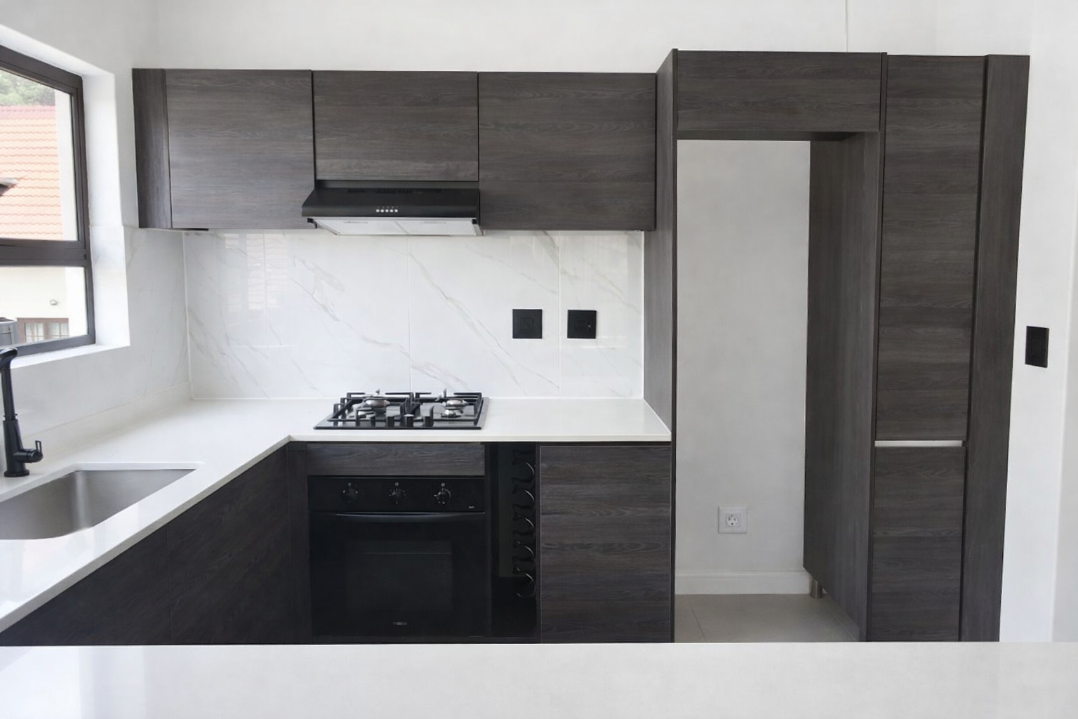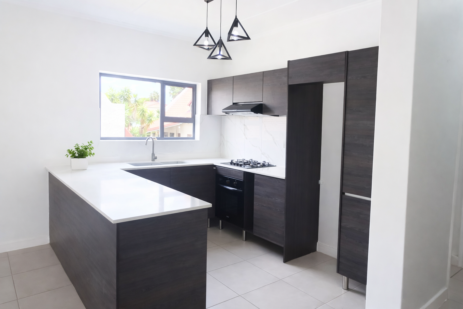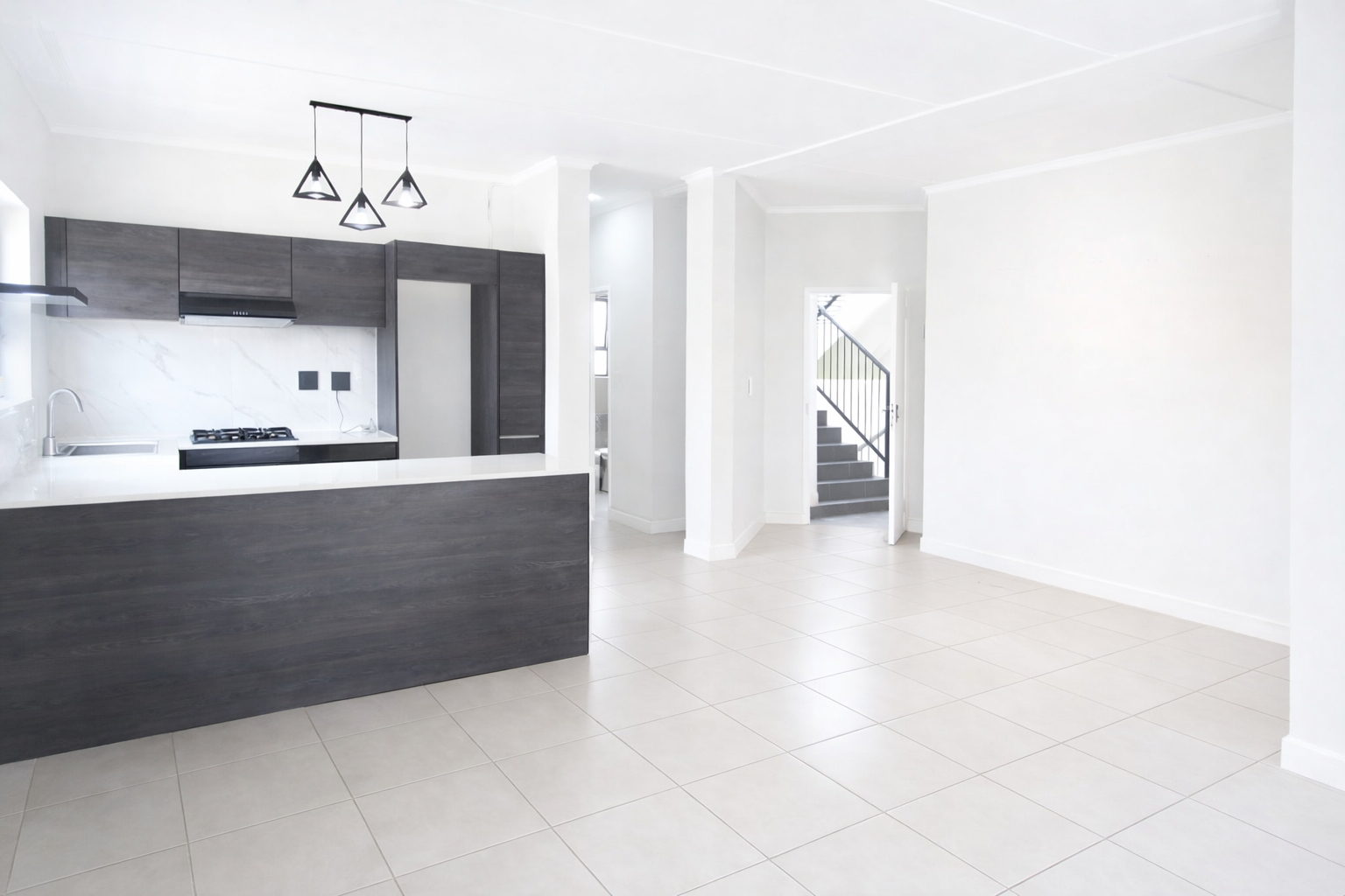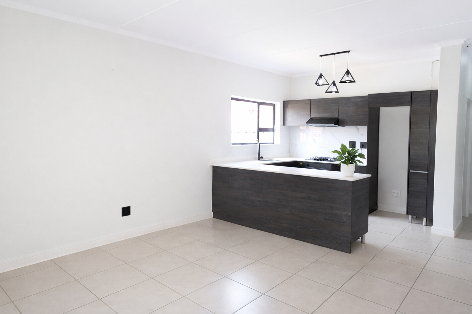 Discover modern living in this inviting 101 sqm rental property, ideally situated within a well-maintained complex in Equestria, Pretoria. This contemporary unit features an open-plan layout, seamlessly connecting the lounge, dining area, and a stylish kitchen. The kitchen boasts dark wood-grain cabinetry, white quartz countertops, a gas hob, built-in oven, extractor fan, and dedicated space for a refrigerator, complemented by a chic marble-look tile backsplash and integrated wine rack. Light-colored tiled flooring and neutral walls create a bright, airy atmosphere throughout, with large windows ensuring ample natural light.