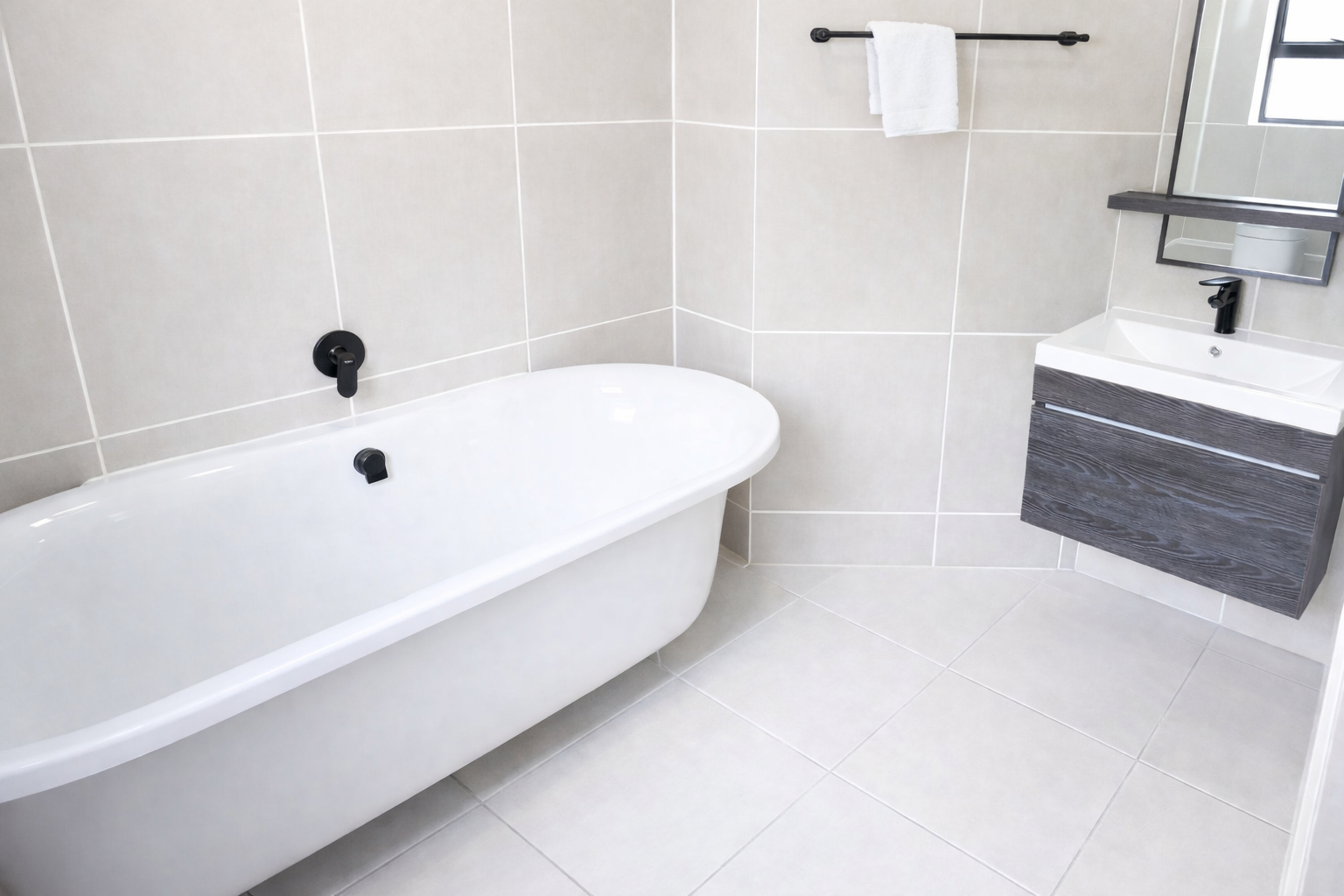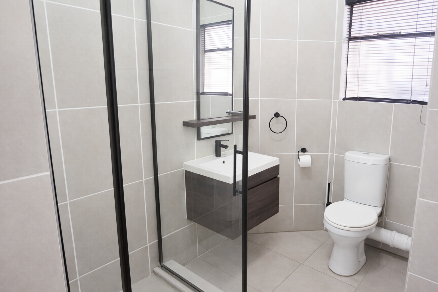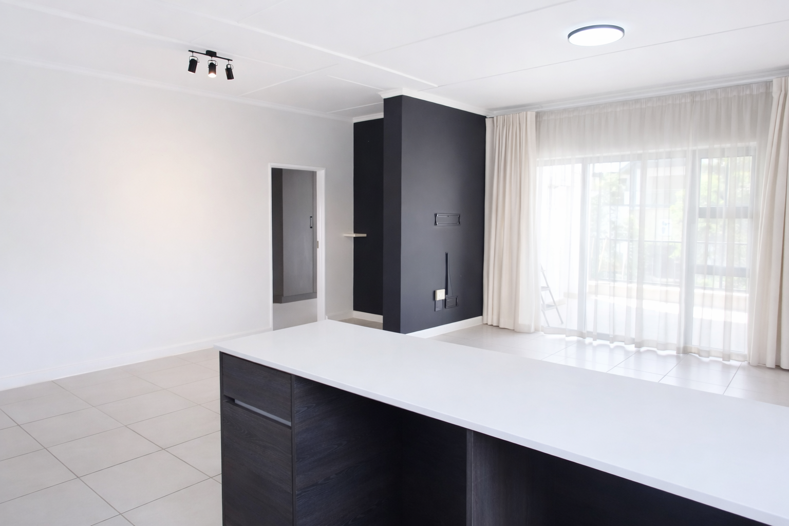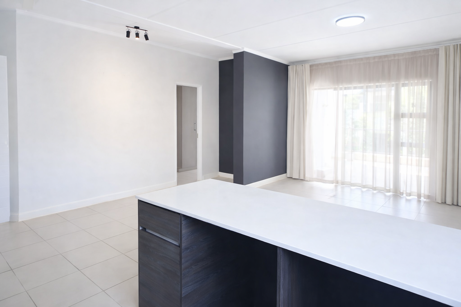 Discover modern living in this inviting 101 sqm rental property, ideally situated within a well-maintained complex in Equestria, Pretoria. This contemporary unit features an open-plan layout, seamlessly connecting the lounge, dining area, and a stylish kitchen. The kitchen boasts dark wood-grain cabinetry, white quartz countertops, a gas hob, built-in oven, extractor fan, and dedicated space for a refrigerator, complemented by a chic marble-look tile backsplash and integrated wine rack. Light-colored tiled flooring and neutral walls create a bright, airy atmosphere throughout, with large windows ensuring ample natural light.