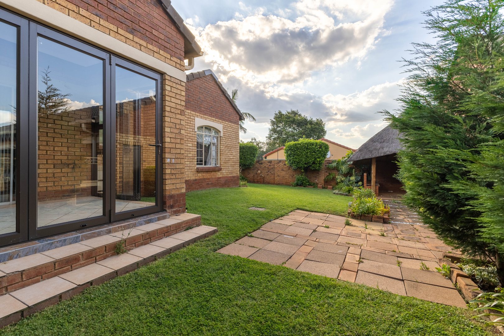 The home features a spacious open-plan sitting and dining area that flows effortlessly into the kitchen, creating a warm and inviting living space. Large aluminium stack sliding doors open from the sitting room onto a garden veranda, ideal for entertaining or relaxing while overlooking the garden.