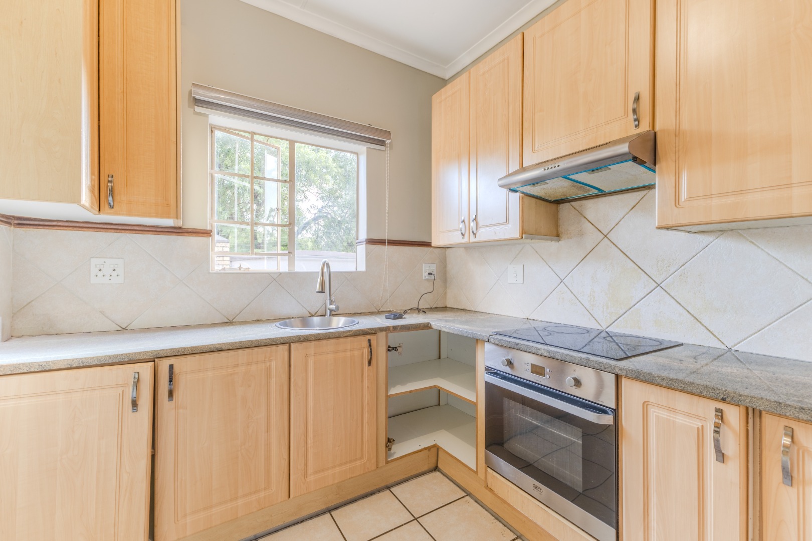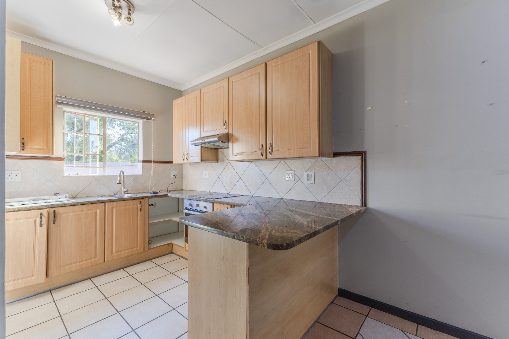 The kitchen is finished with granite countertops, fitted with a stove and cooker hood, and offers ample cupboard space, making it both stylish and practical for everyday use.