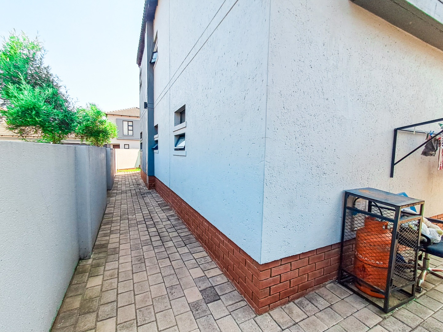 The property provides a dedicated utility area ensuring convenience. Enjoy outdoor living with a covered ground-floor patio featuring a built-in braai, ideal for entertaining, and a second-floor balcony offering additional private outdoor space. The low-maintenance paved outdoor area and pet-friendly policy add to the appeal for those seeking a hassle-free lifestyle. Parking is ample with a double garage and three dedicated parking spaces.