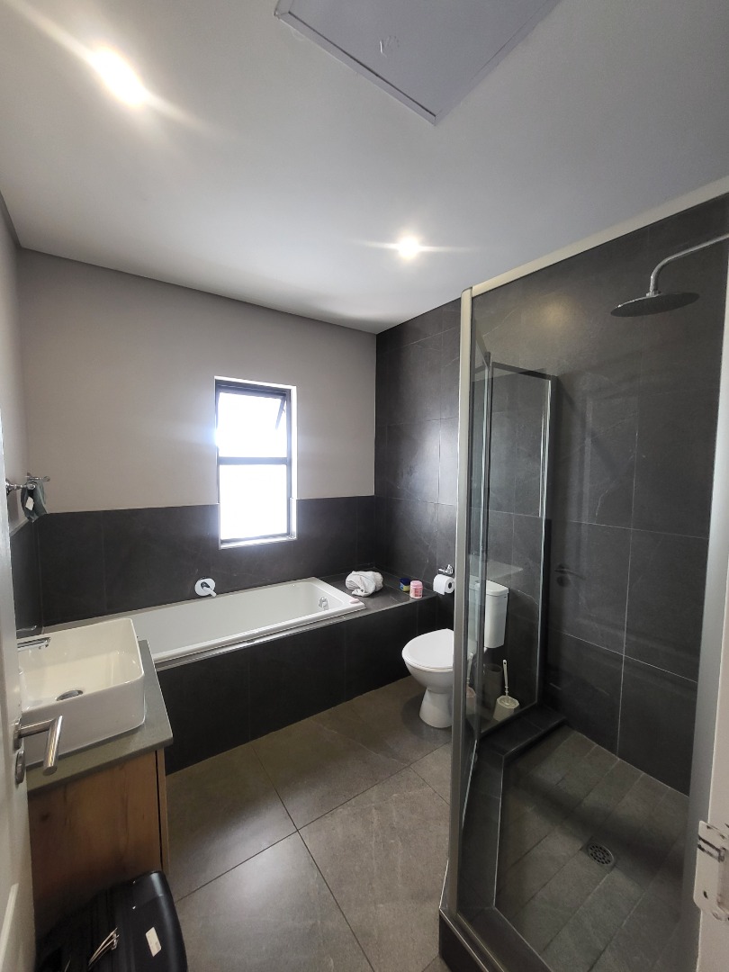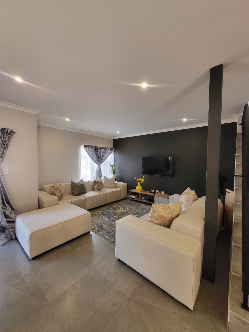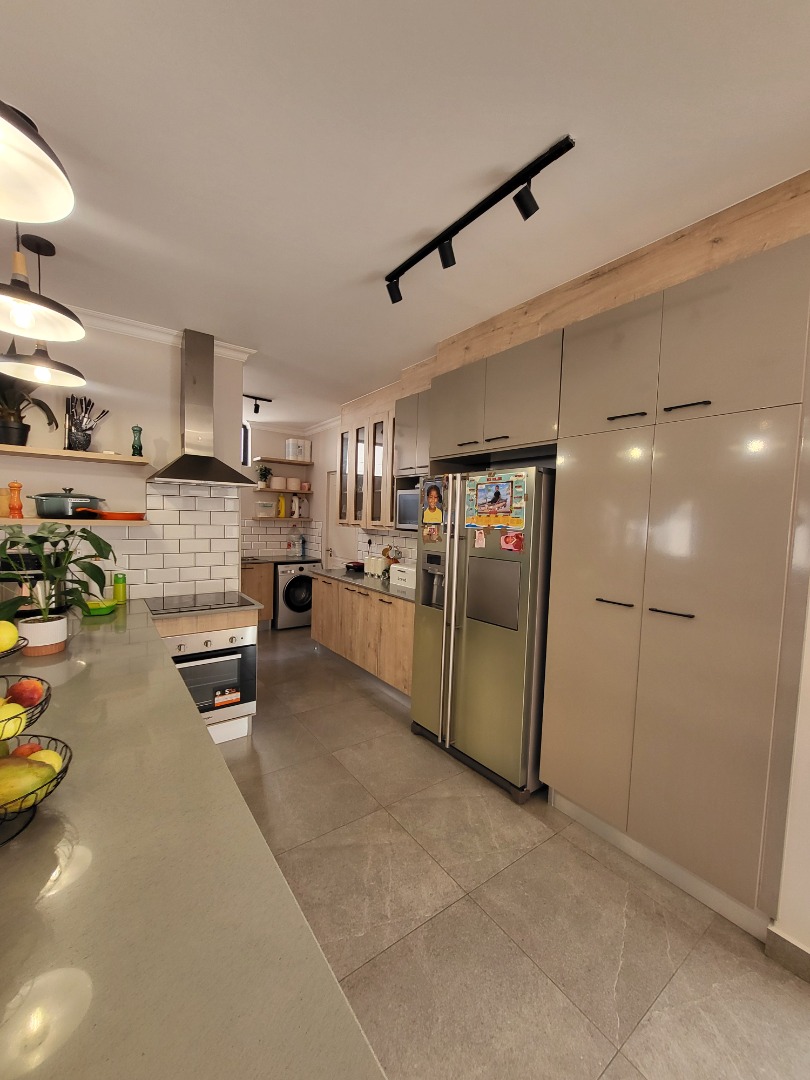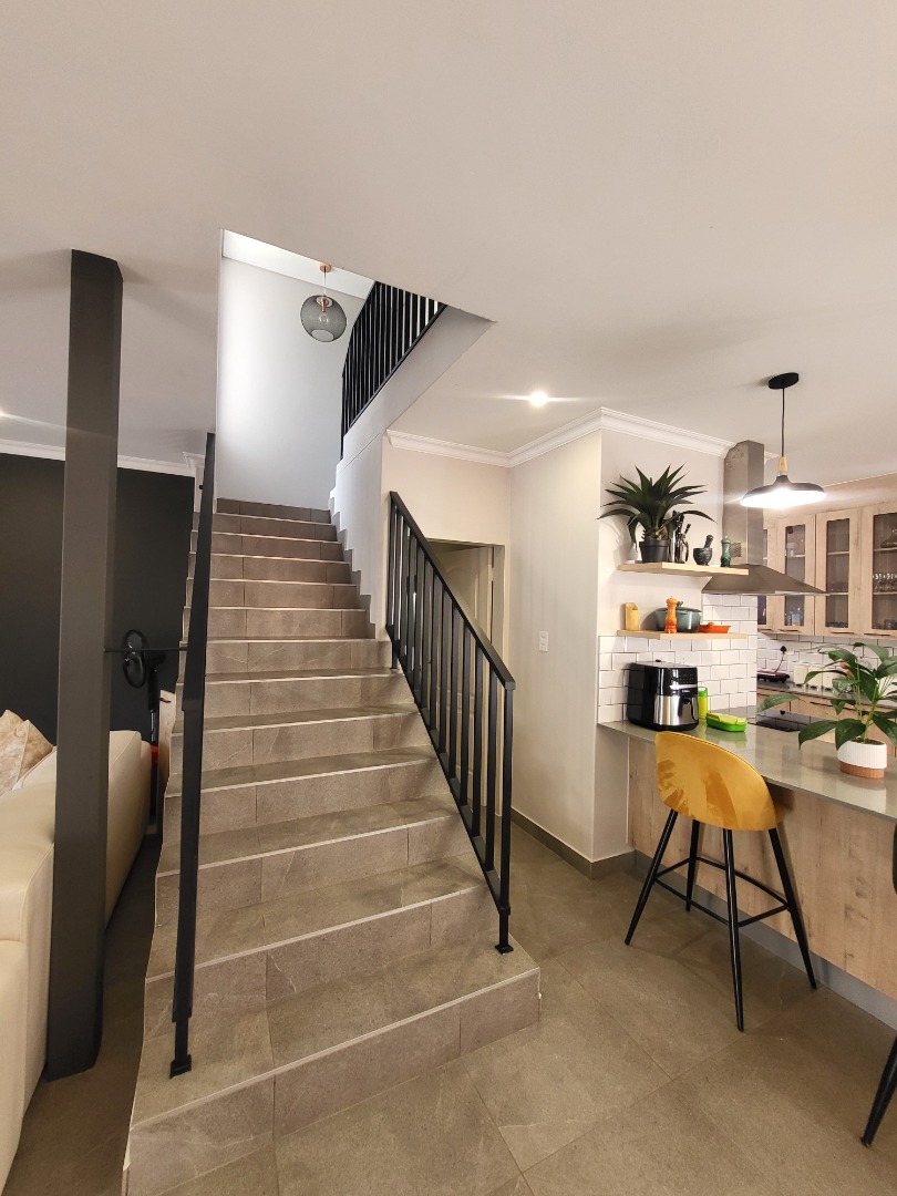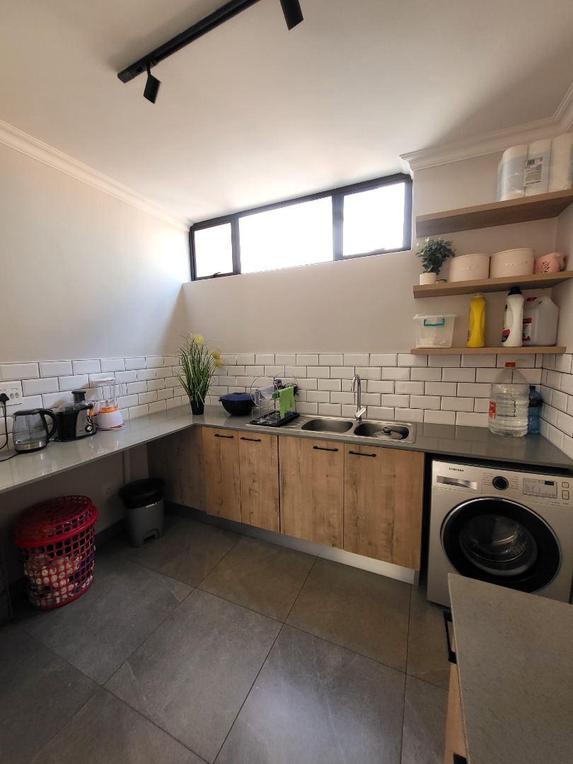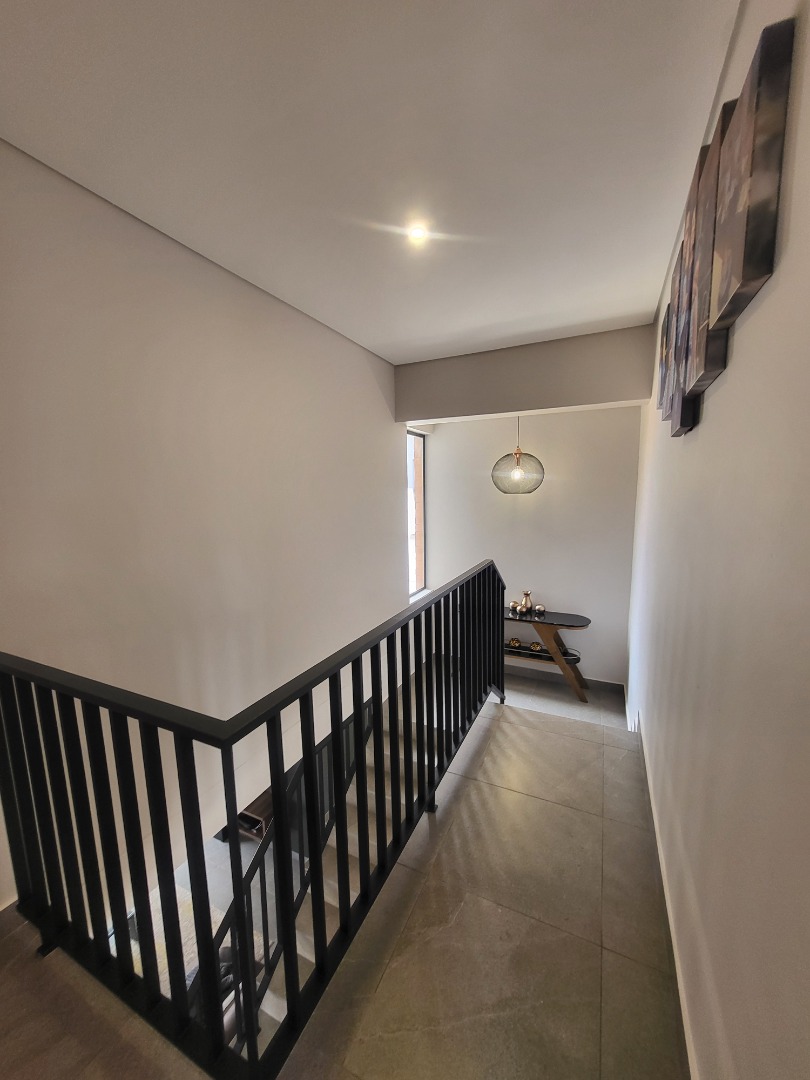 Upstairs, the home offers four well-proportioned bedrooms, each fitted with built-in cupboards. Two bedrooms enjoy en-suite bathrooms, while the remaining two are serviced by a stylish full family bathroom. The main bedroom opens onto a private balcony, creating a peaceful retreat. A dedicated study nook enhances the home’s practicality, making it well-suited for remote work or study.