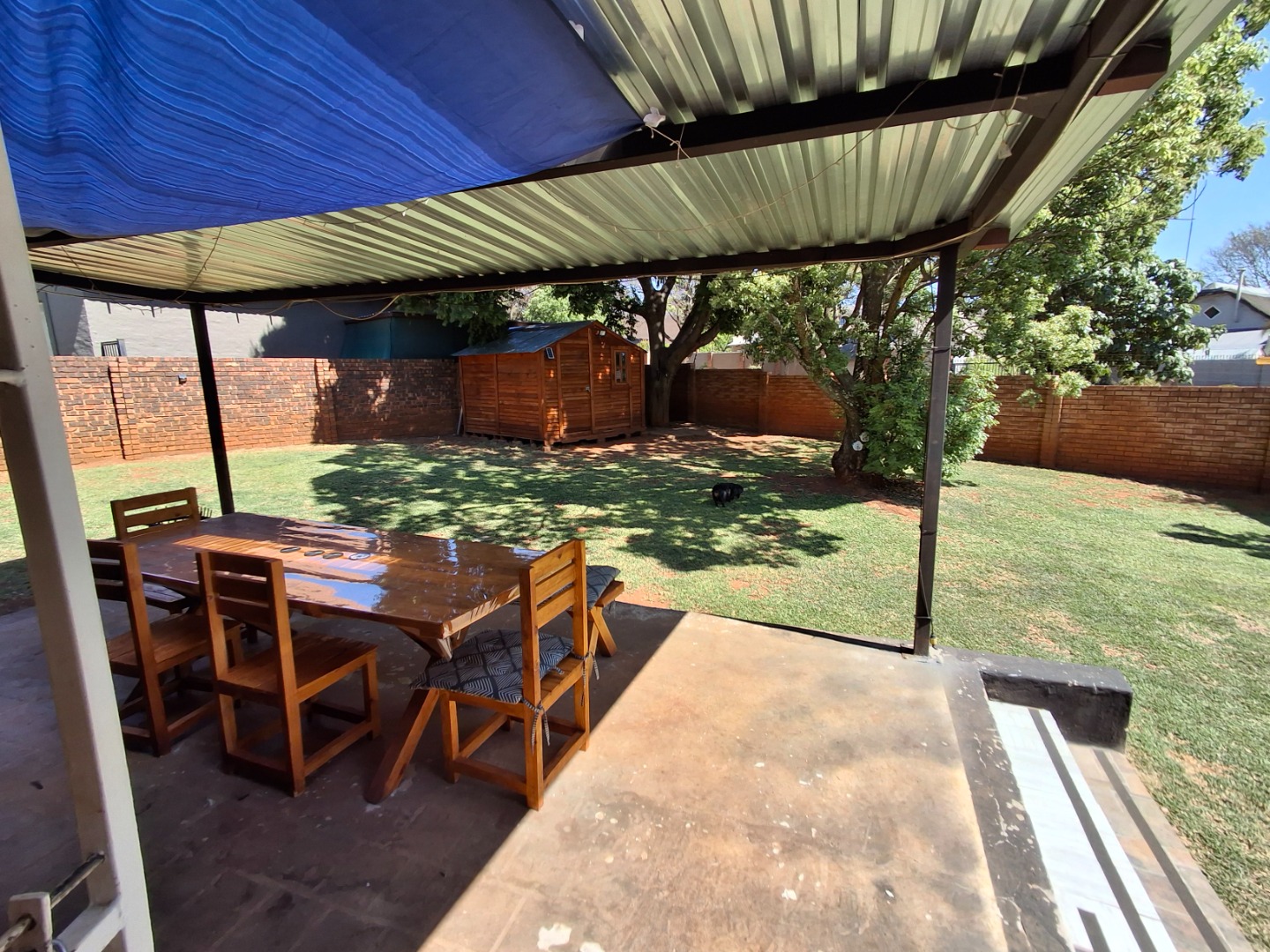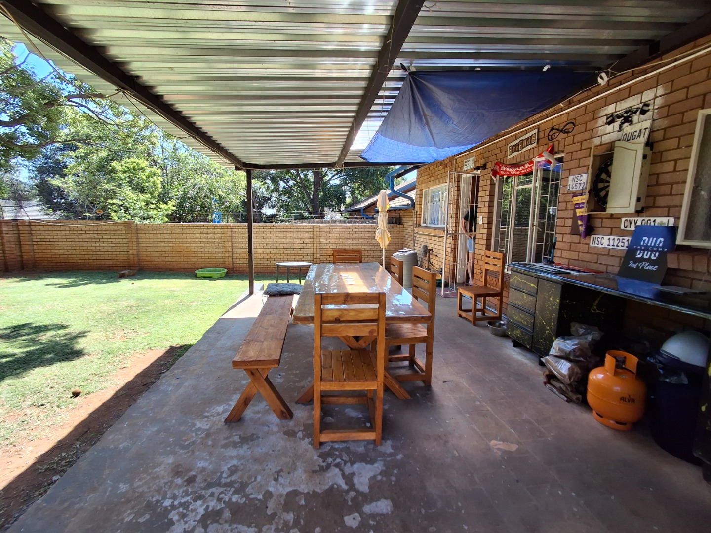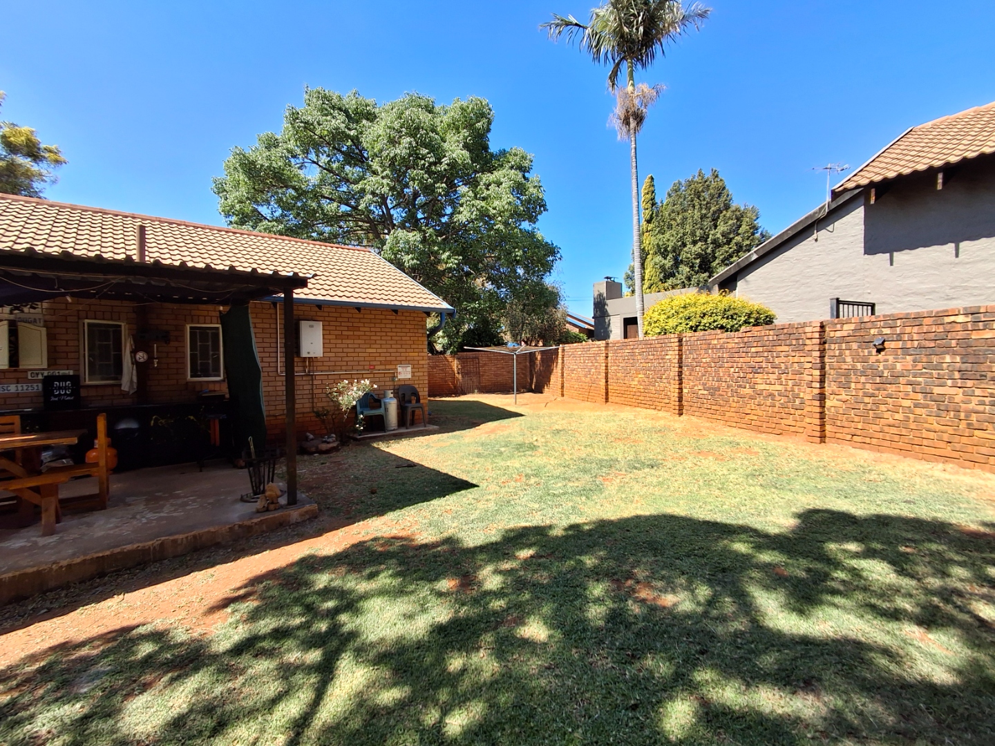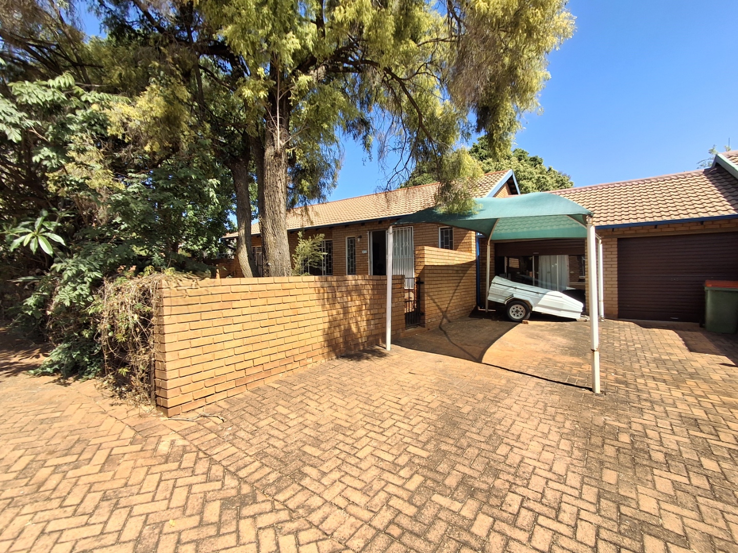 Outdoor living is facilitated by a private patio and a grassed garden area, complete with paving and a wendy house for additional storage. This pet-friendly property also offers a carport and two dedicated parking spaces.