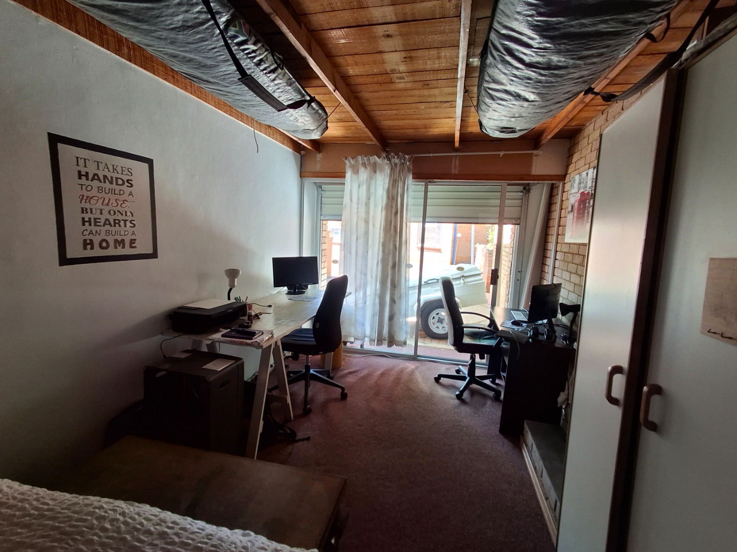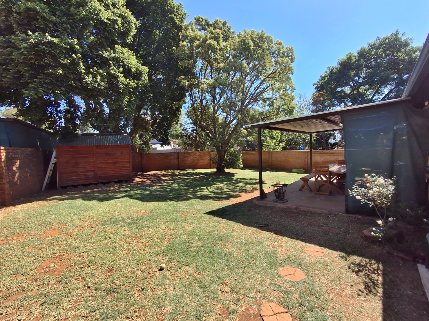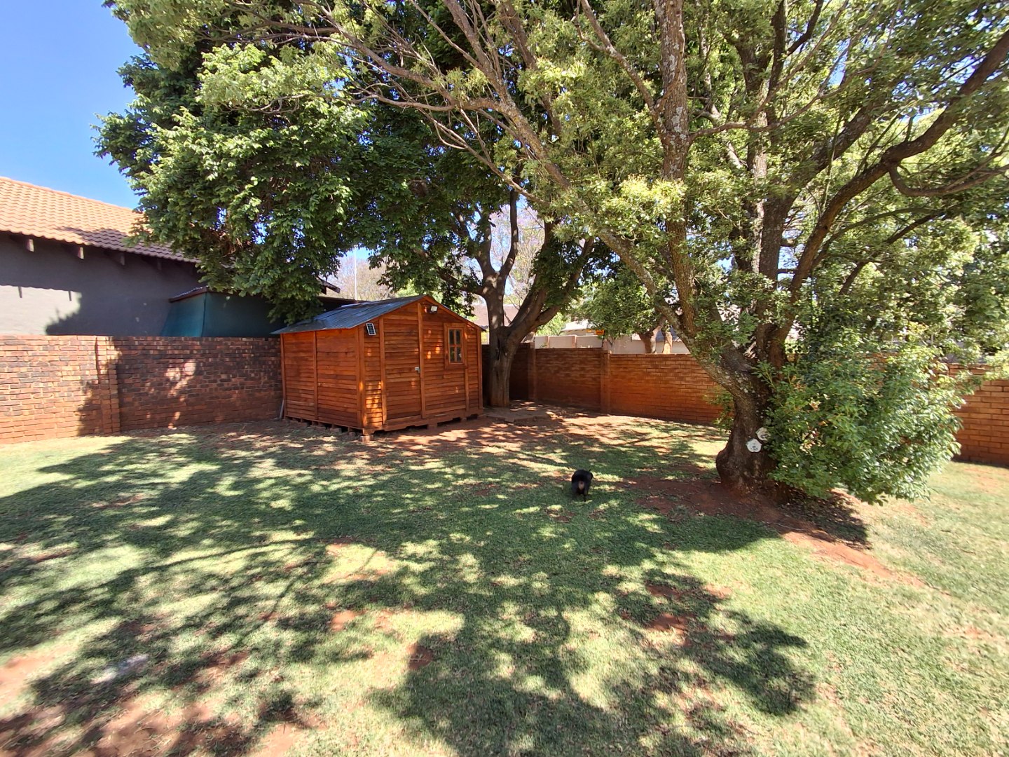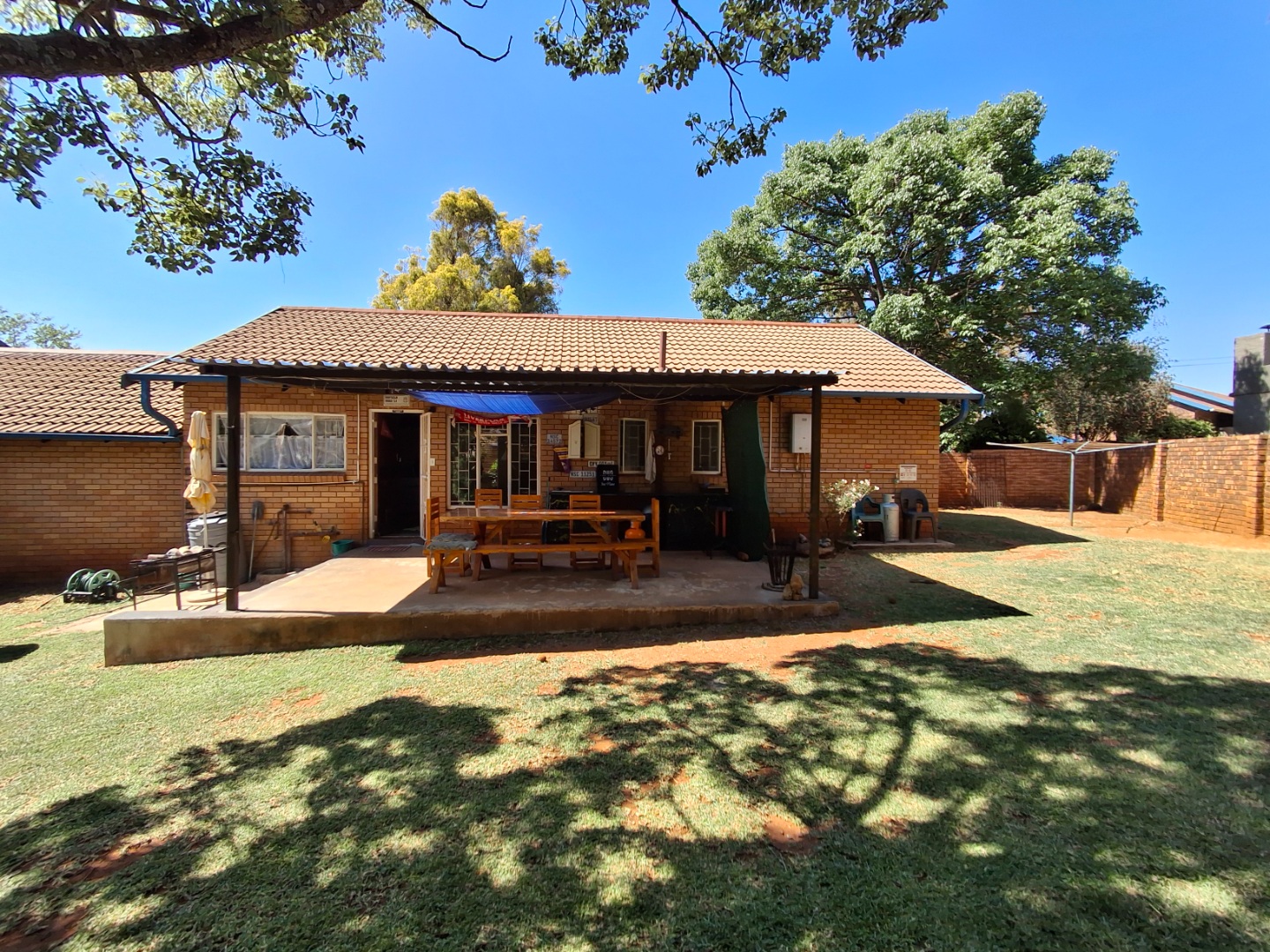 Outdoor living is facilitated by a private patio and a grassed garden area, complete with paving and a wendy house for additional storage. This pet-friendly property also offers a carport and two dedicated parking spaces.