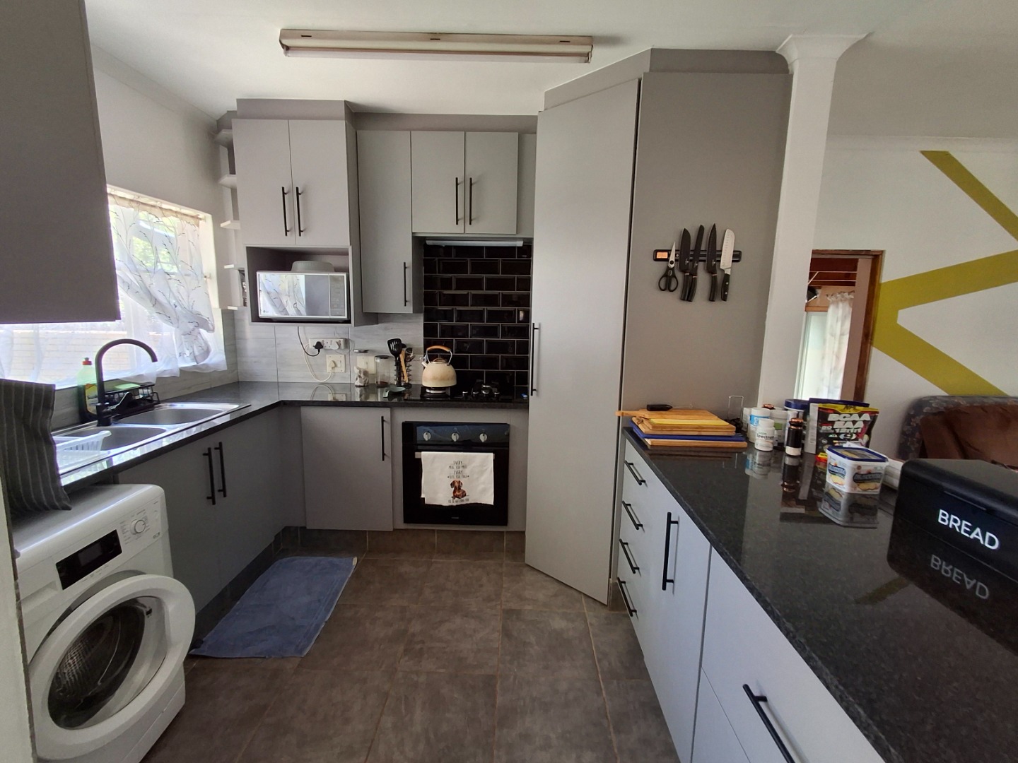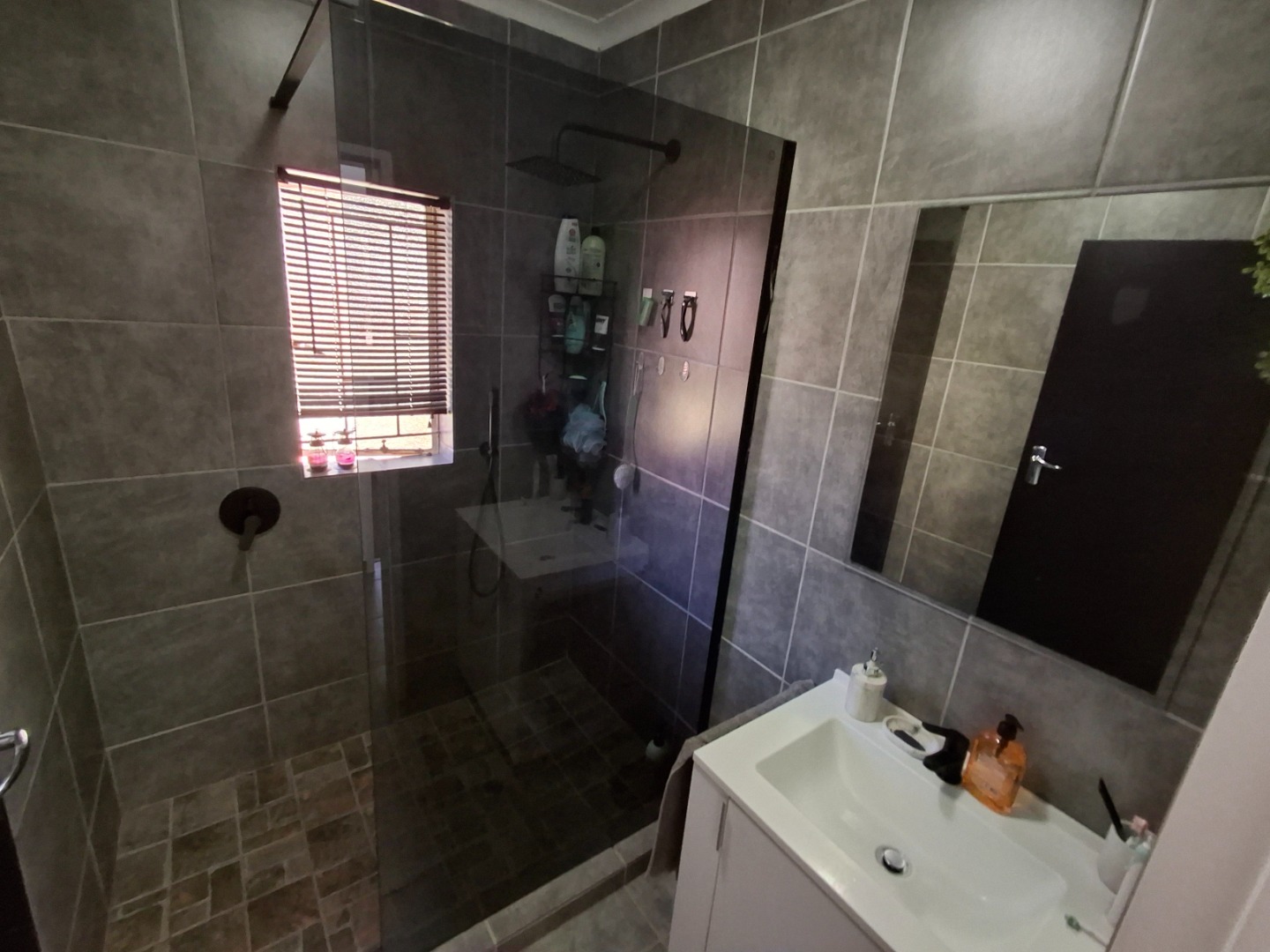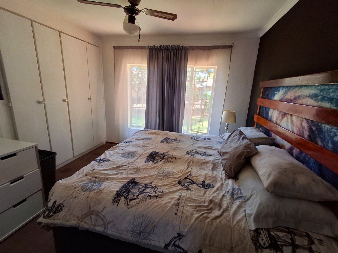 This inviting 84 sqm residential rental property in a well-maintained complex offers comfortable living in Garsfontein. The home features an open-plan layout, seamlessly connecting the lounge, dining area, and a modern kitchen. The kitchen boasts sleek grey cabinetry, dark granite countertops, a black subway tile backsplash, and includes space for a washing machine and fitted with gas stove. Tiled flooring throughout the main living areas, ample natural light, and ceiling fans ensure a comfortable and airy atmosphere, complemented by distinctive accent walls that add character.
