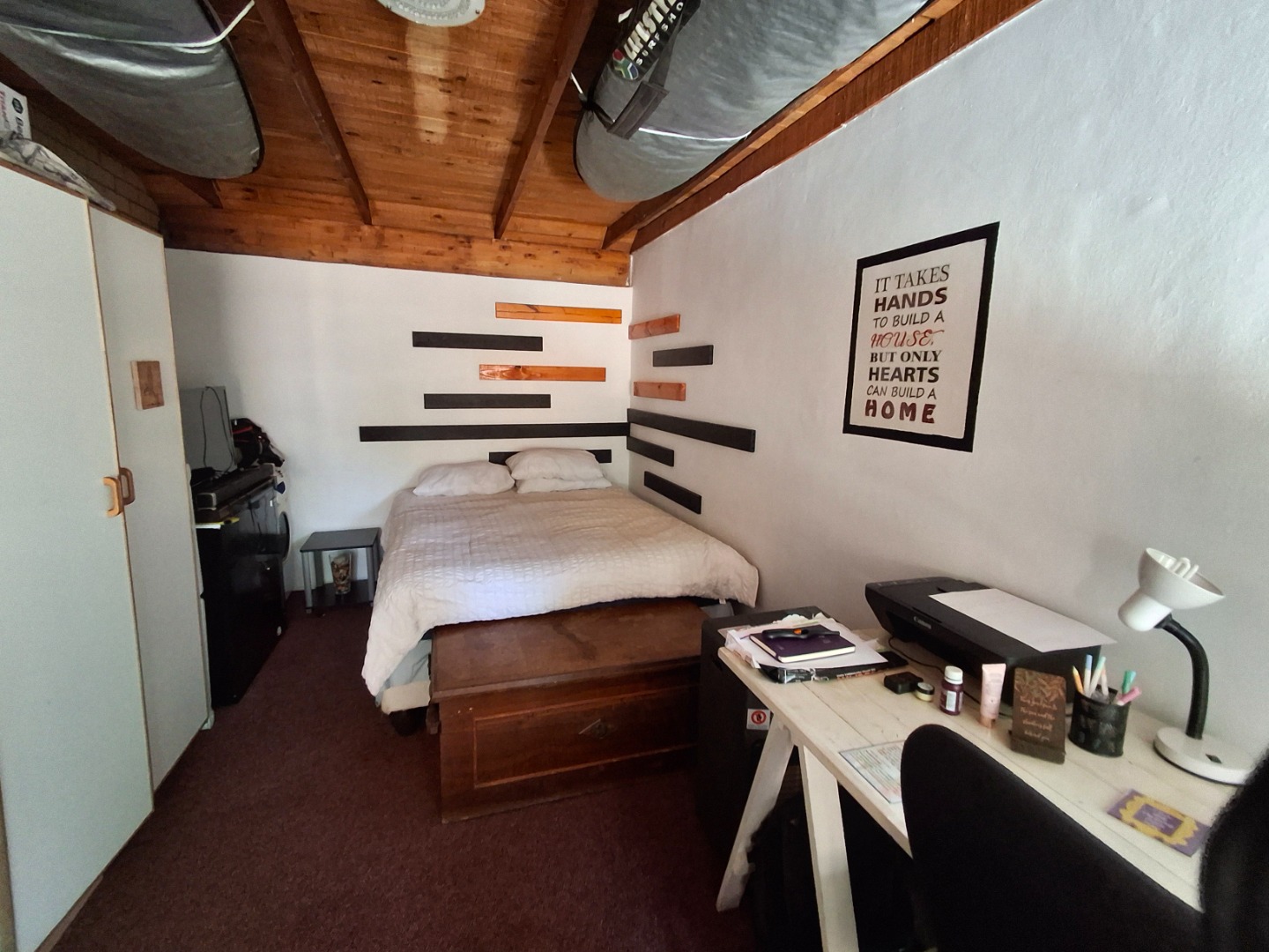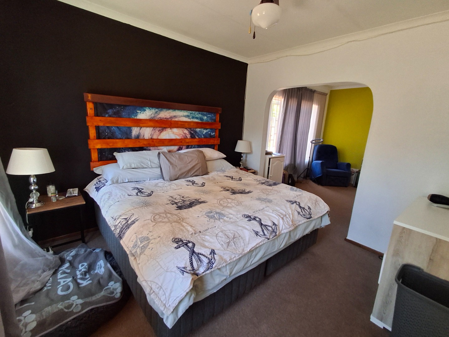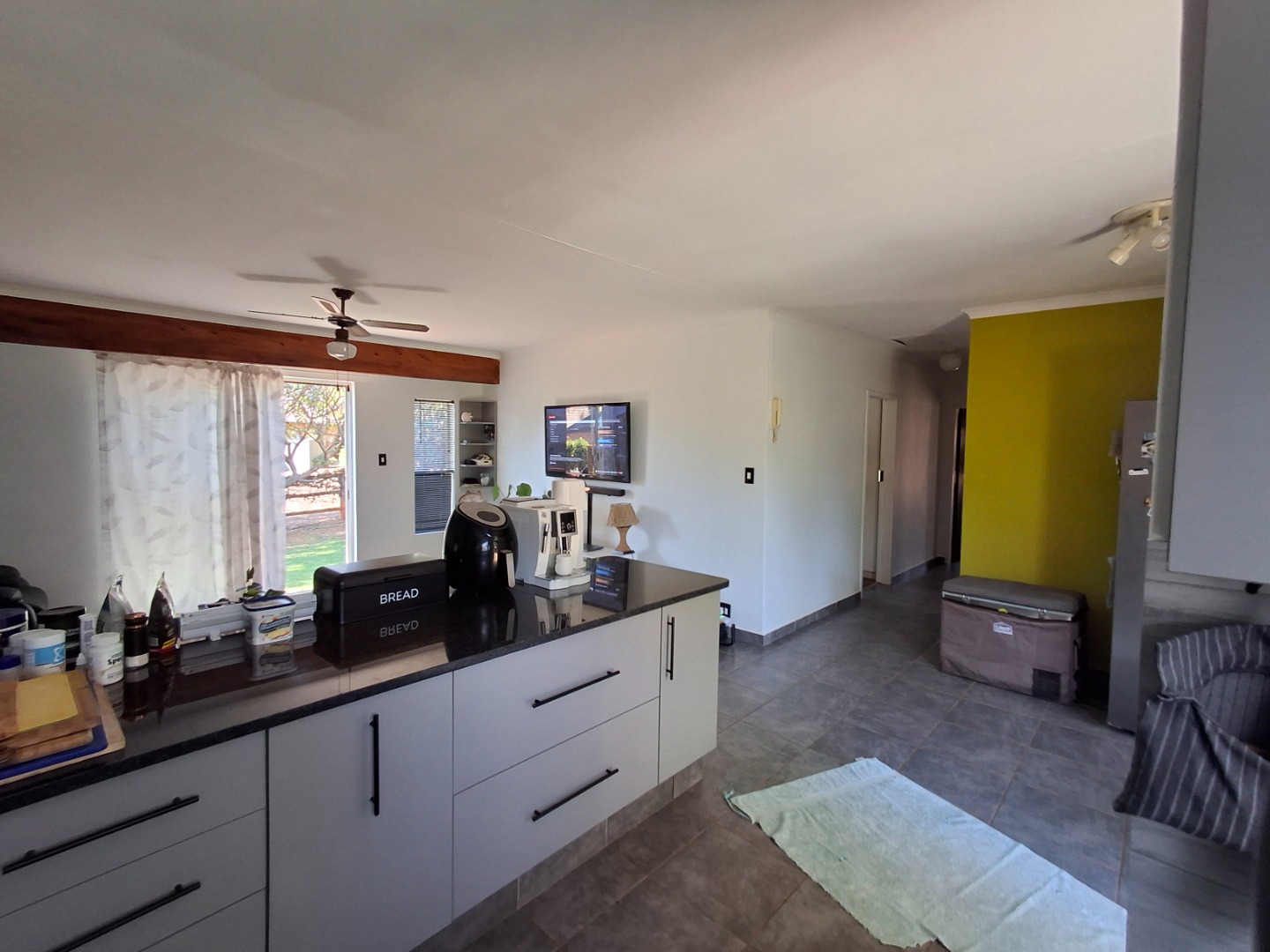 This inviting 84 sqm residential rental property in a well-maintained complex offers comfortable living in Garsfontein. The home features an open-plan layout, seamlessly connecting the lounge, dining area, and a modern kitchen. The kitchen boasts sleek grey cabinetry, dark granite countertops, a black subway tile backsplash, and includes space for a washing machine and fitted with gas stove. Tiled flooring throughout the main living areas, ample natural light, and ceiling fans ensure a comfortable and airy atmosphere, complemented by distinctive accent walls that add character.