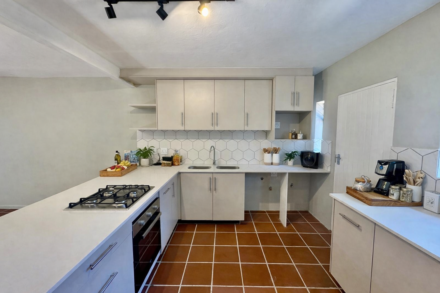 The open-plan kitchen is a chef’s delight, boasting a gas hob, elegant countertops, a breakfast counter, and space for two appliances.