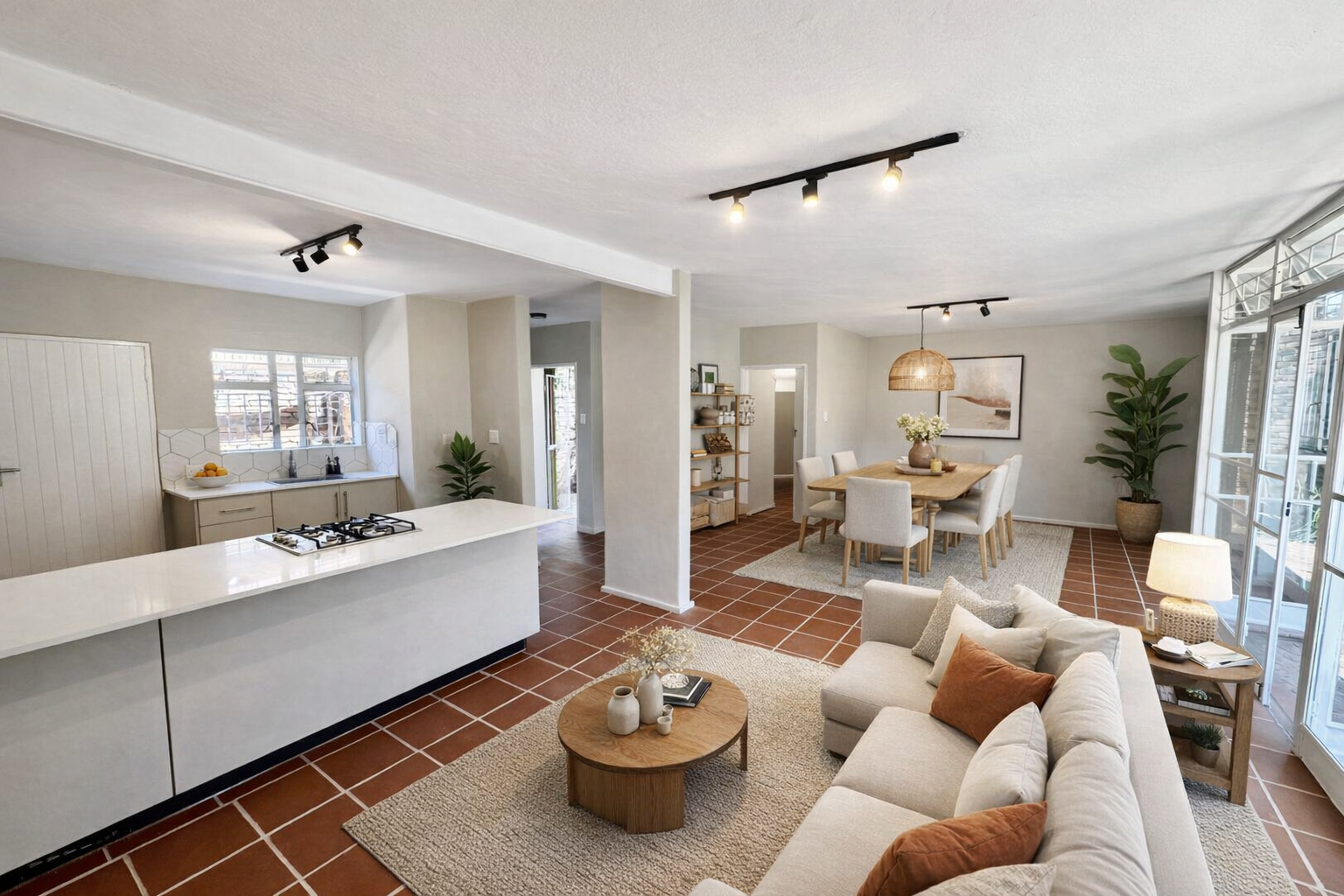 The spacious living and dining area flows seamlessly through glass doors to a patio and garden.