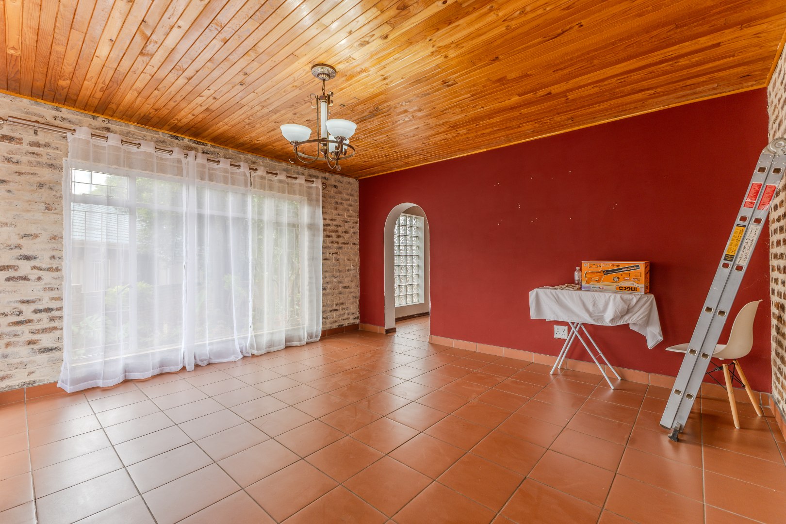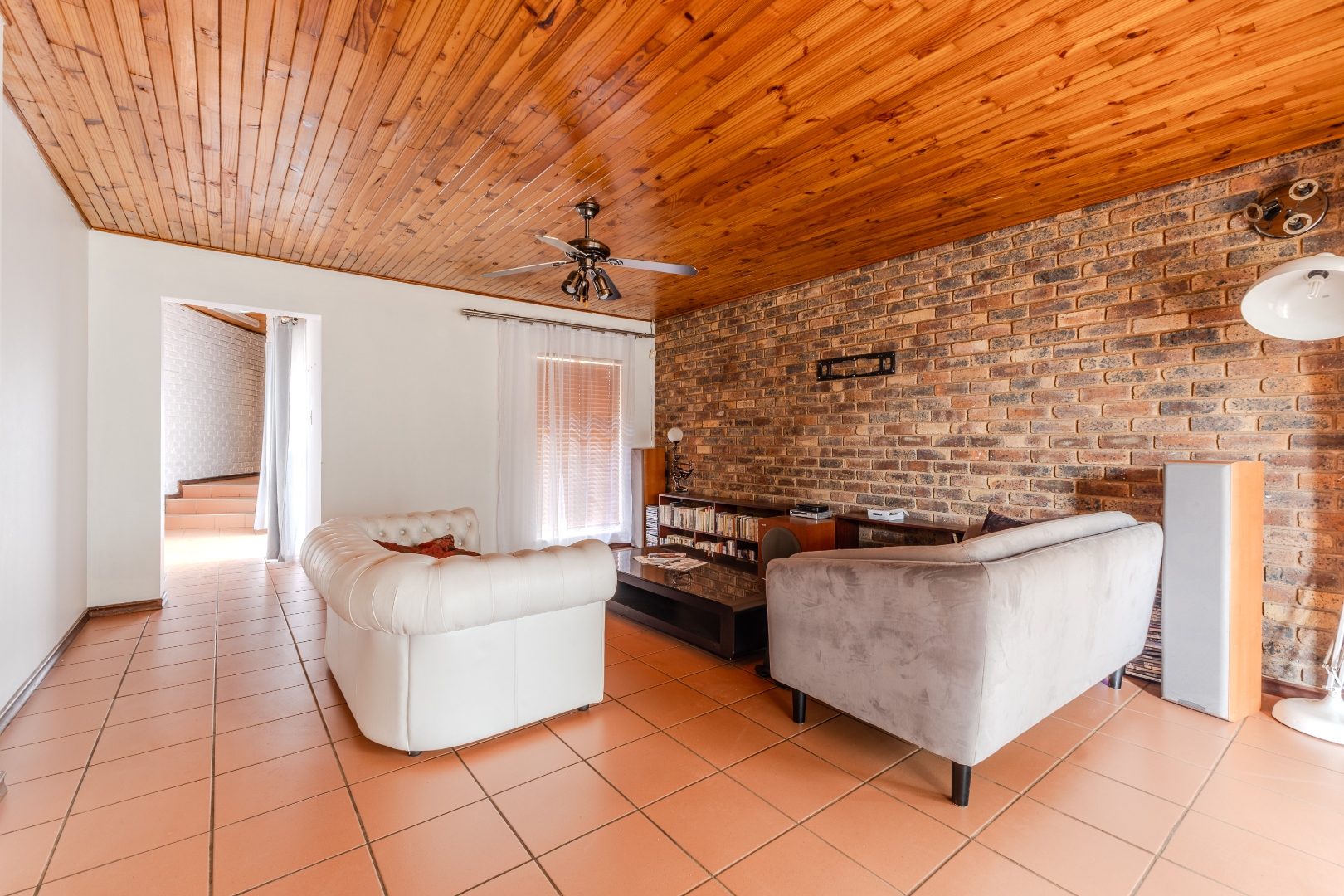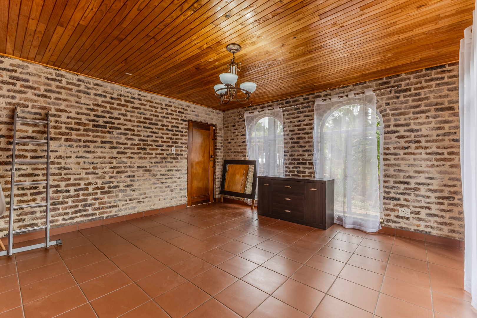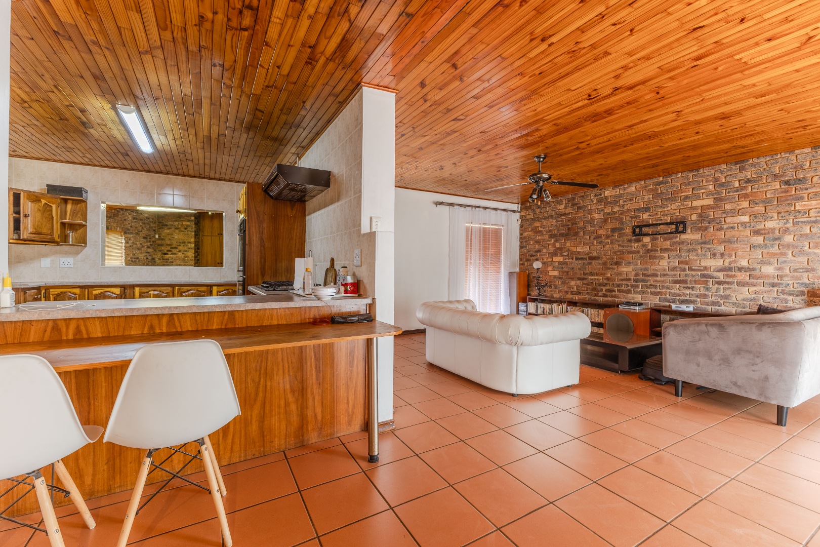 This expansive 5-bedroom, 4-bathroom residence in the sought-after Pretoria suburb of Garsfontein offers a generous living experience across its 1408 sqm floor area, set on a substantial 1410 sqm erf. The home features a distinctive character with warm wood-paneled ceilings, terracotta-tiled flooring, and exposed brick accent walls throughout, creating a unique and inviting atmosphere. An open-plan design enhances the flow between certain living spaces, ideal for comfortable family life.
