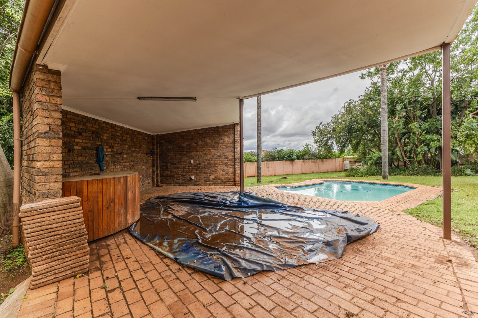 Outside, the property truly shines with a private swimming pool, perfect for relaxation and entertainment, set within an expansive green garden. A covered patio area offers an ideal spot for outdoor dining or simply enjoying the mature landscaping.