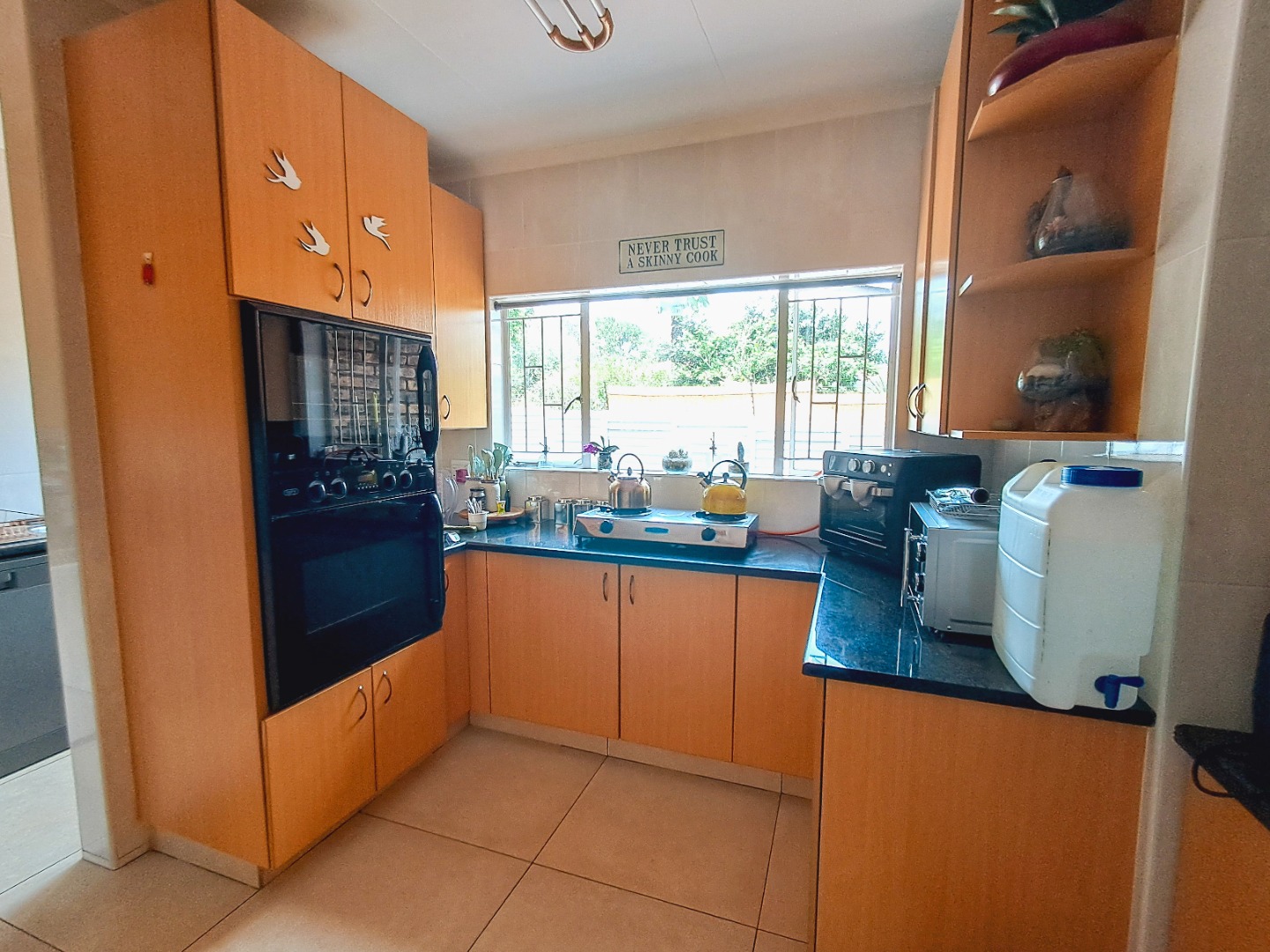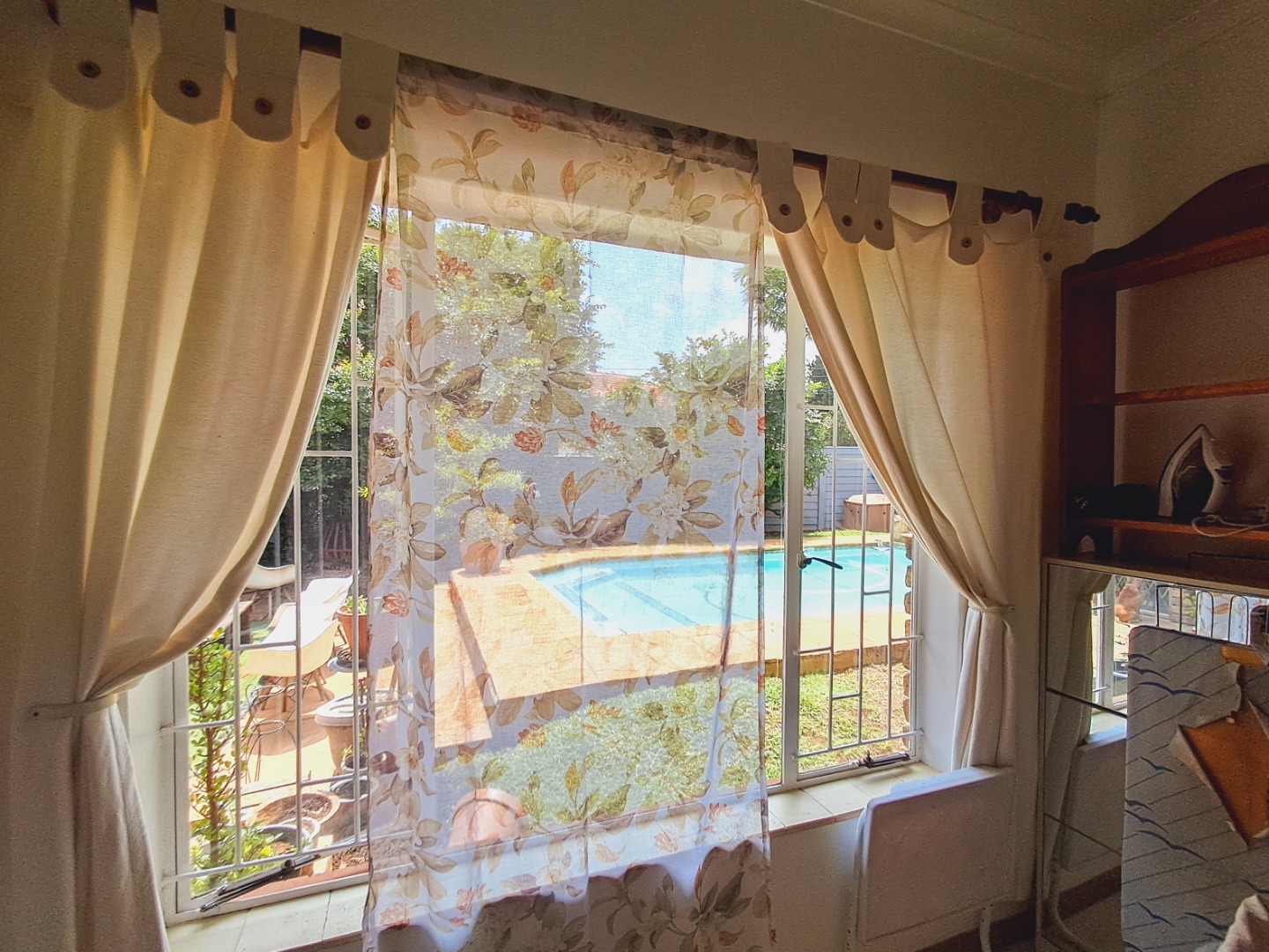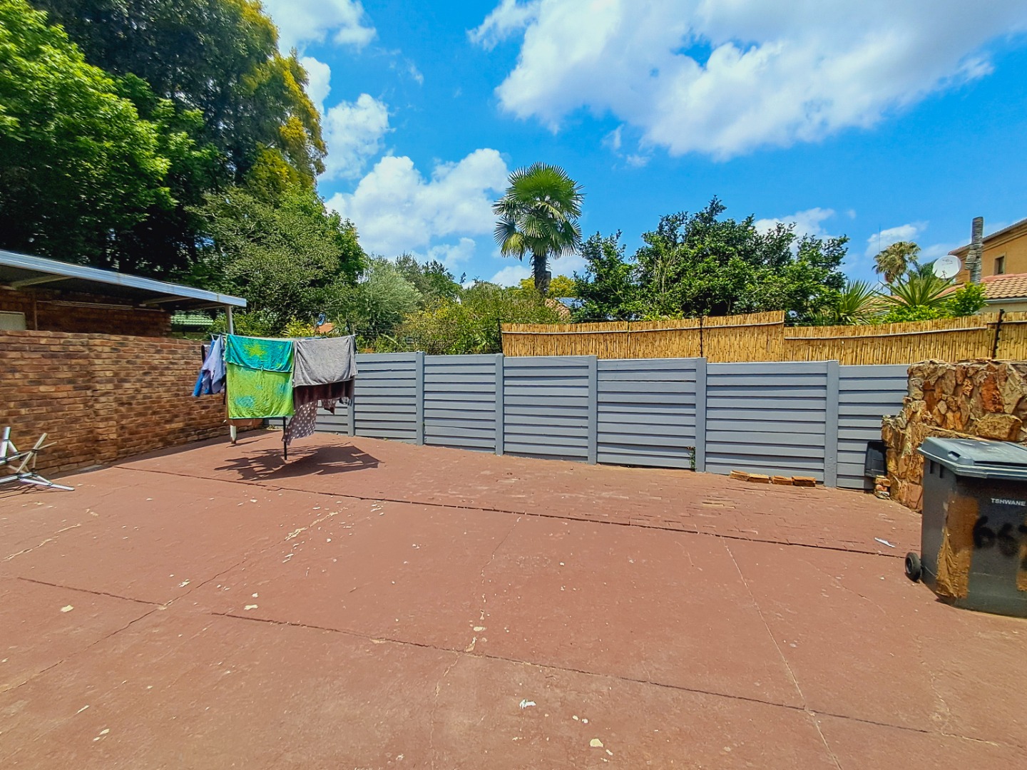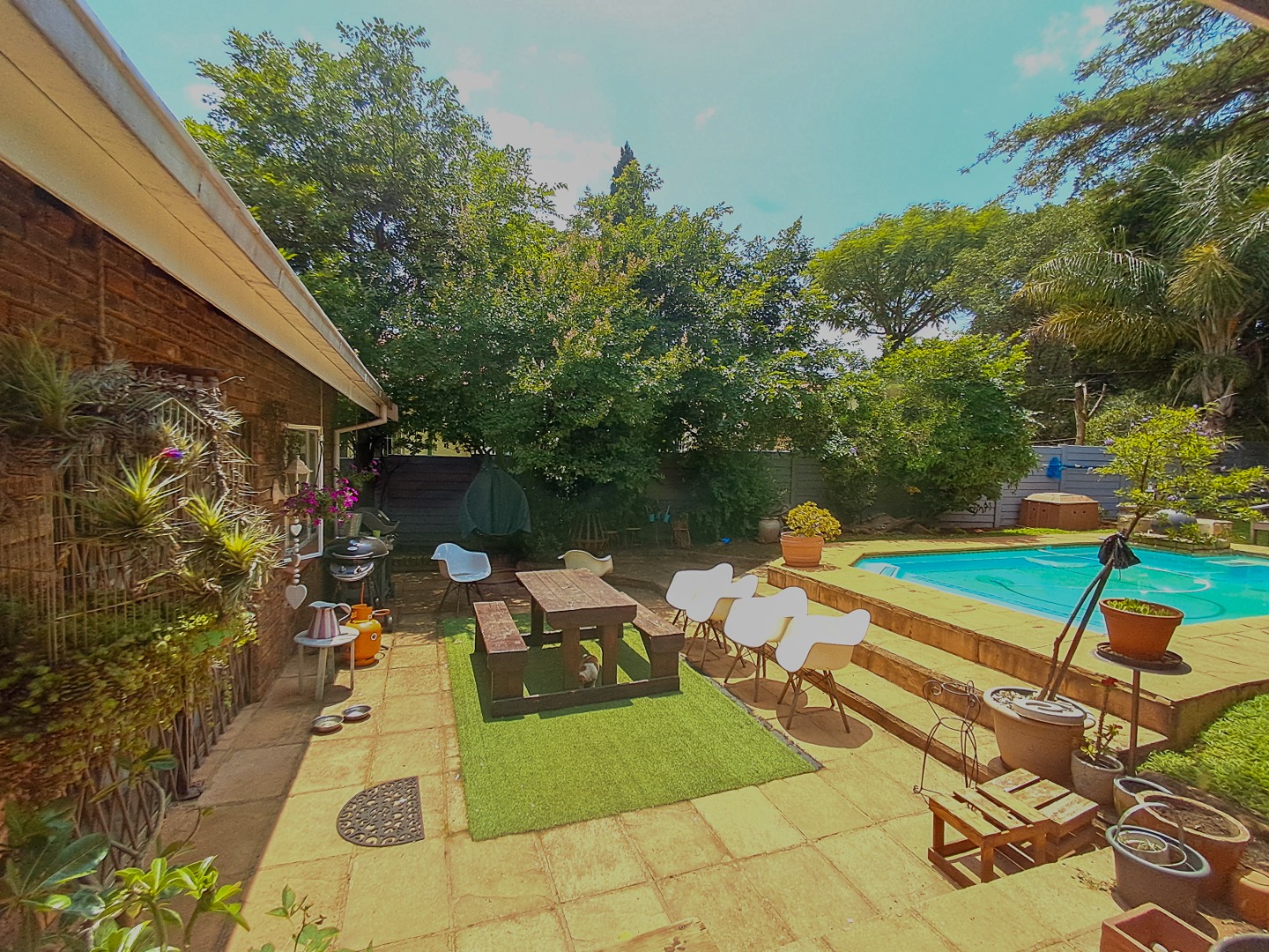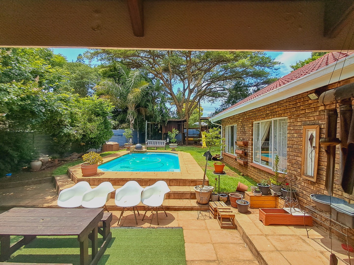 This expansive 5-bedroom, 2-bathroom residence in Garsfontein, Pretoria, offers a blend of comfortable living and vibrant entertainment spaces. The interior boasts two spacious lounges and a dedicated dining room, providing ample room for relaxation and gatherings. A highlight is the open-plan entertainment area featuring a built-in bar with seating and a projector, perfect for hosting. The functional kitchen is equipped with wooden cabinetry, tiled surfaces, a built-in oven, and a gas burner, alongside space for essential appliances like a dishwasher and washing machine. The bathrooms are well-appointed with modern glass-enclosed showers and clean tiled finishes. Step outside to discover a private outdoor oasis designed for leisure. An inviting swimming pool is surrounded by lush, mature trees and a spacious paved patio, offering an ideal setting for outdoor entertaining and a dedicated braai area. The property features a secure gated entrance, a well-maintained brick-paved driveway leading to two garages, and additional parking. Enhanced privacy and security are provided by high brick walls and security bars on windows, complemented by an ADT presence. Staff quarters add to the home's practicality, and pets are welcome. Situated within a desirable gated community on a quiet cul-de-sac, this metropolitan Pretoria home ensures a peaceful and secure lifestyle. The well-maintained street and established residential neighbourhood contribute to its appeal, offering a serene environment while remaining conveniently located. Key Features: • 5 Bedrooms, 2 Bathrooms • 2 Lounges, 1 Dining Room • Private Swimming Pool & Paved Patio • Dedicated Entertainment Bar & Projector • Secure Gated Entrance & 2 Garages • Staff Quarters • Pet-Friendly • Gated Community Location