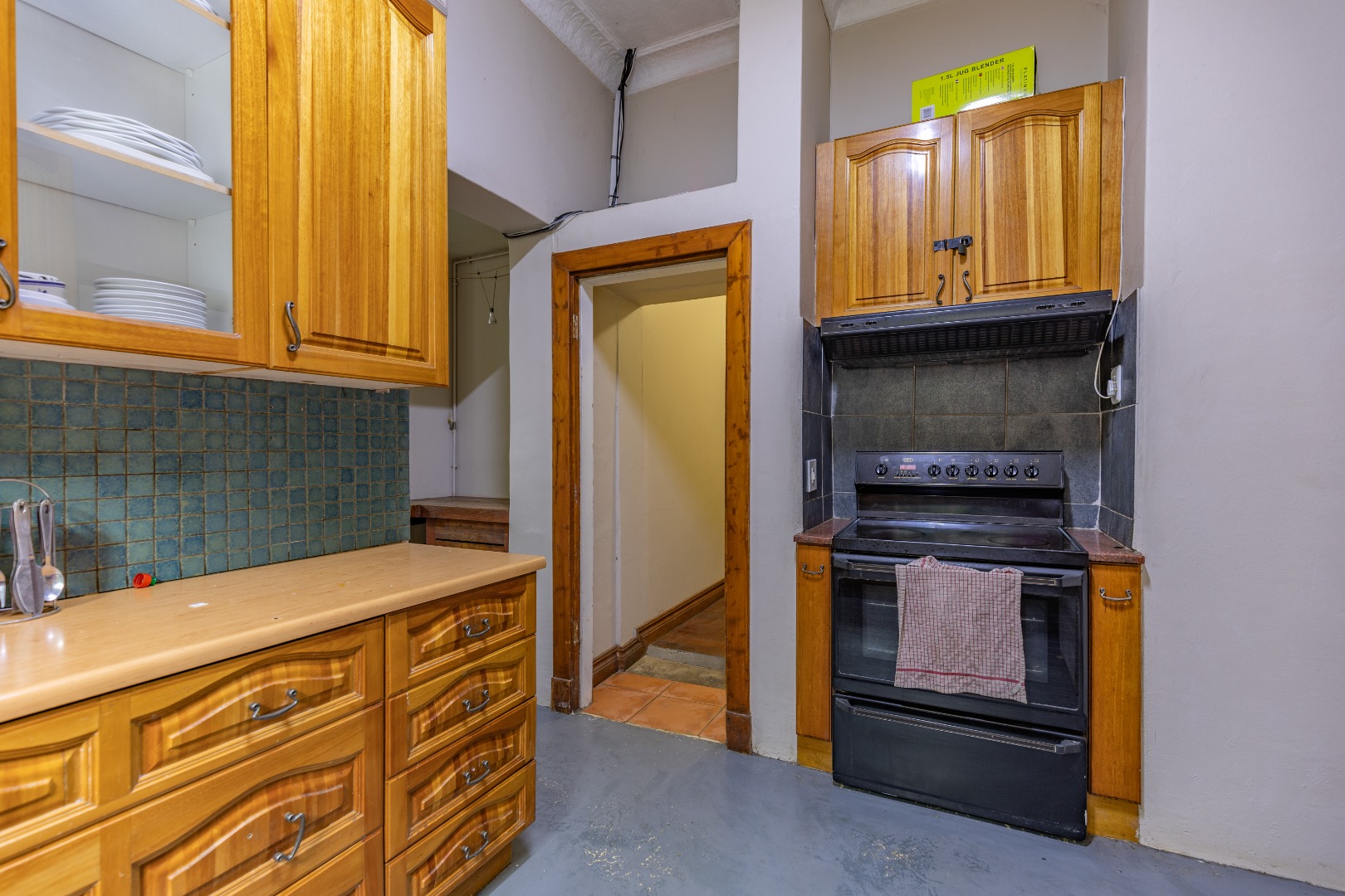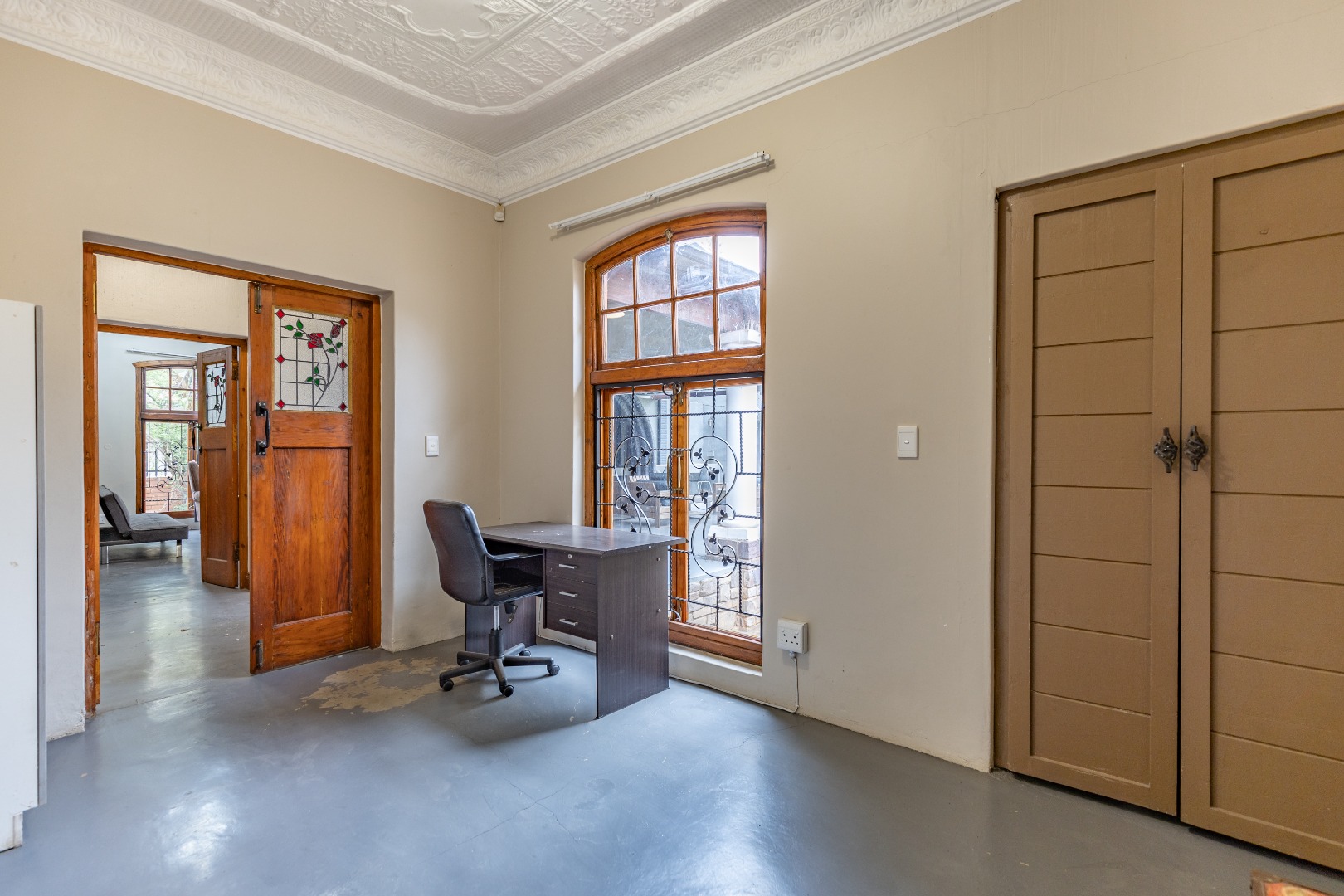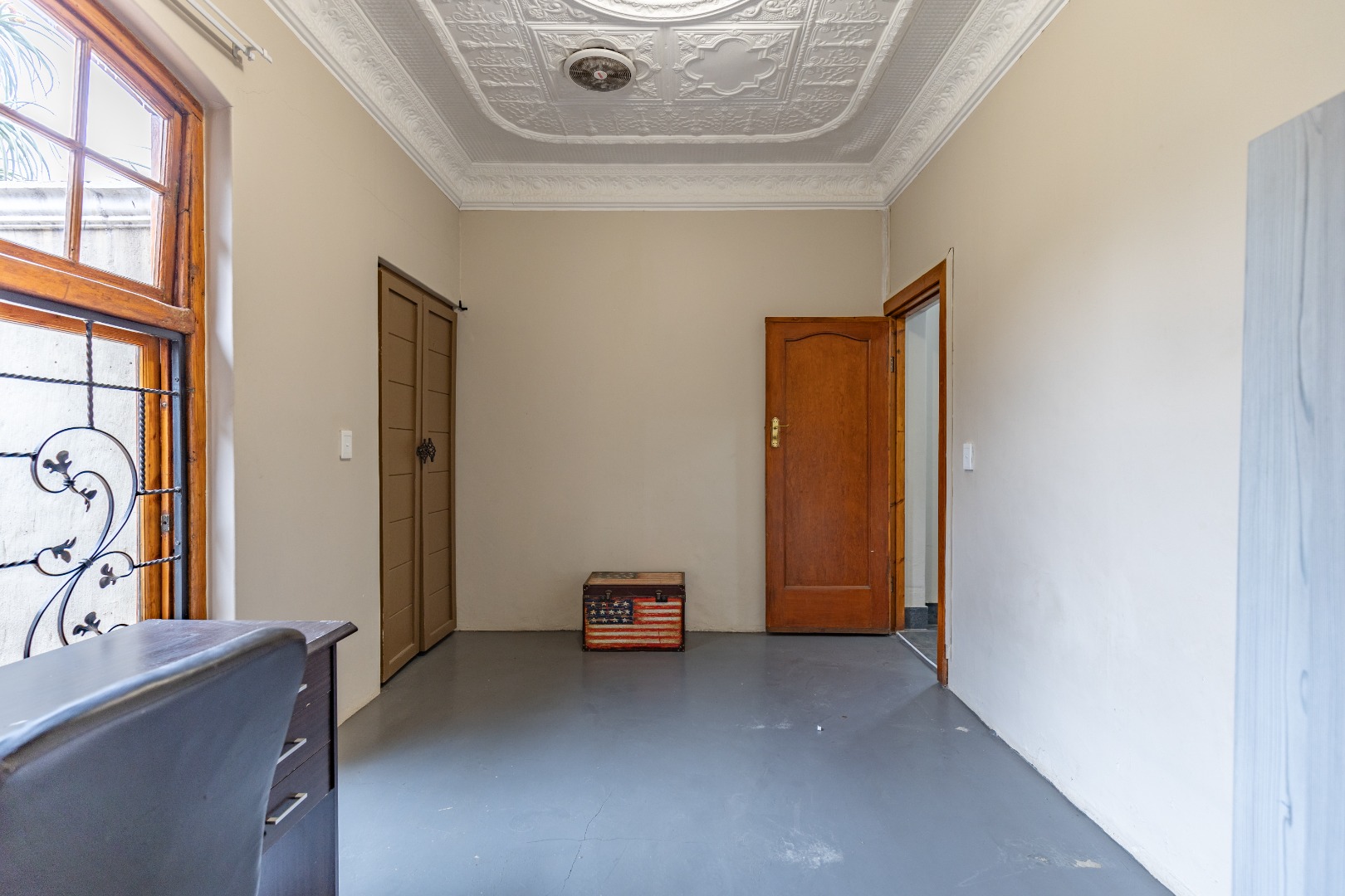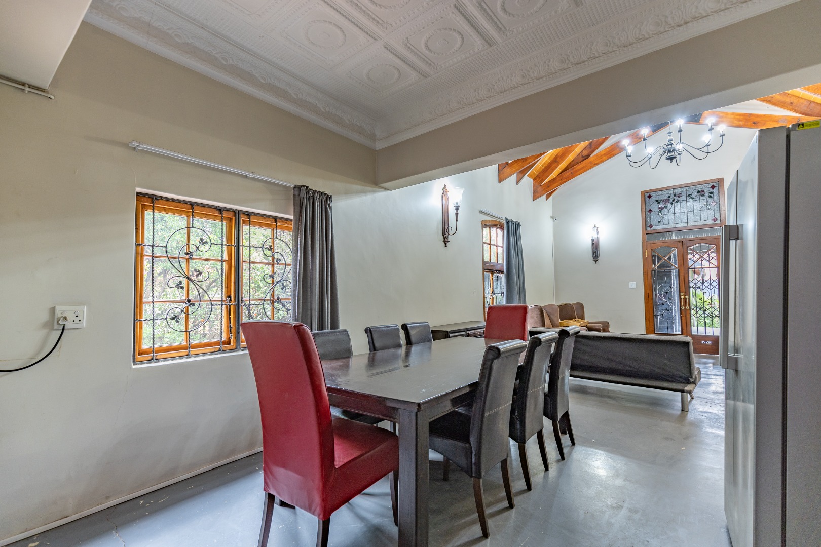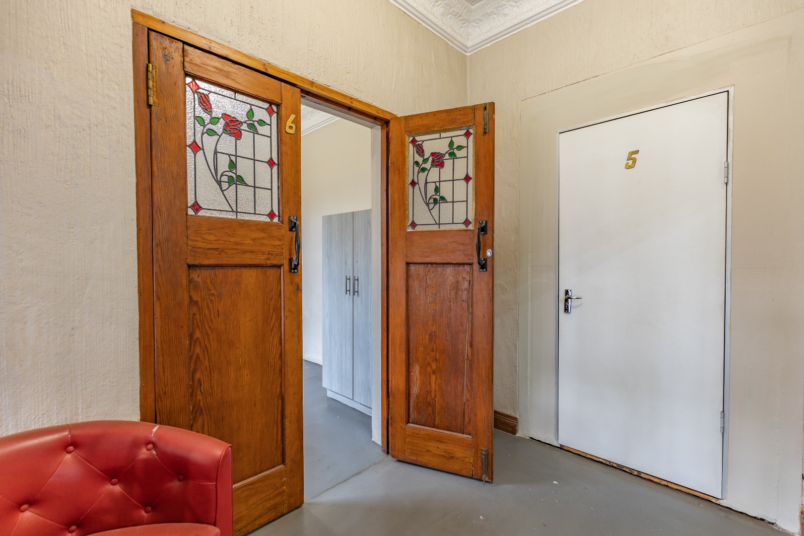 This 1-bedroom, 1-bathroom apartment in Hatfield, Pretoria, offers a comfortable and convenient living space ideal for students. The unit features a well-appointed kitchen and a dedicated family TV room, providing essential amenities for daily life. Architectural character is evident throughout, with unique wooden double doors featuring stained glass accents and decorative ceiling molding adding a touch of elegance to the interior spaces.