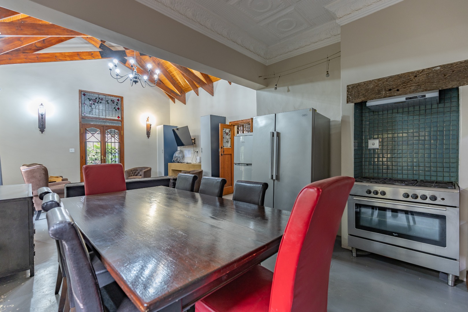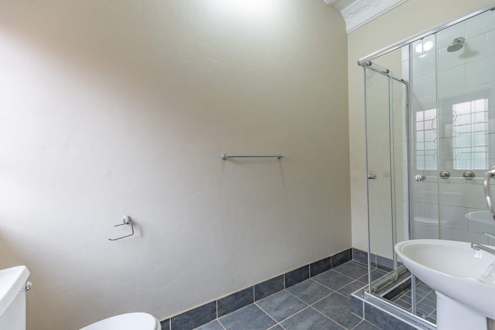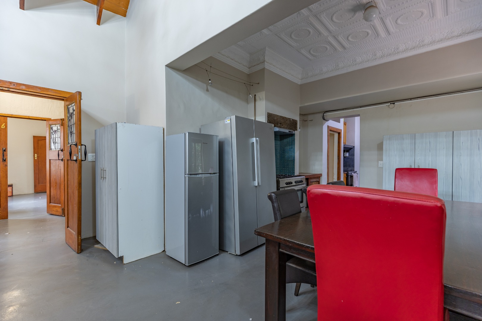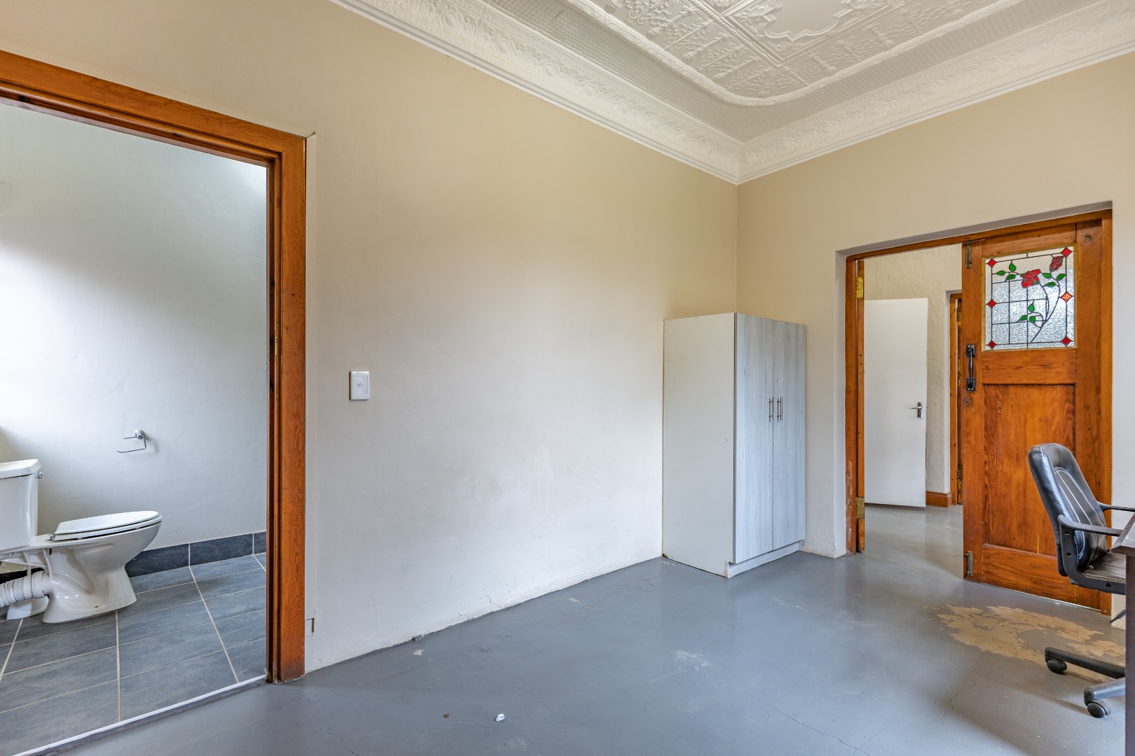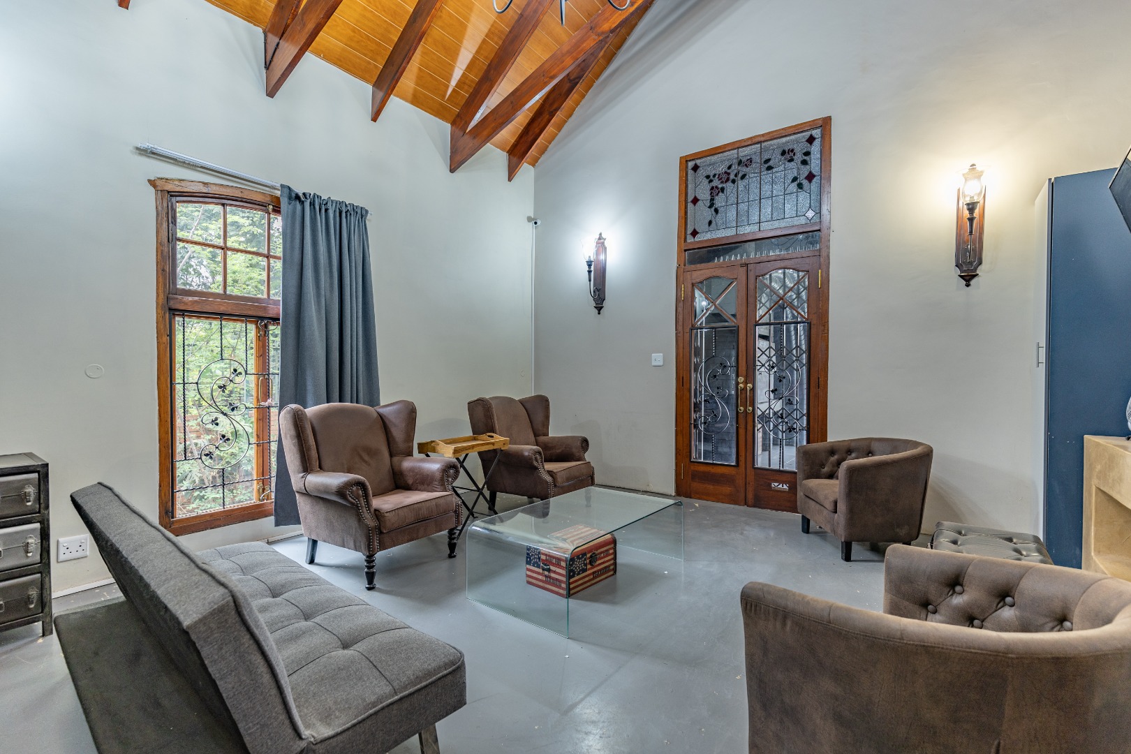 This 1-bedroom, 1-bathroom apartment in Hatfield, Pretoria, offers a comfortable and convenient living space ideal for students. The unit features a well-appointed kitchen and a dedicated family TV room, providing essential amenities for daily life. Architectural character is evident throughout, with unique wooden double doors featuring stained glass accents and decorative ceiling molding adding a touch of elegance to the interior spaces.