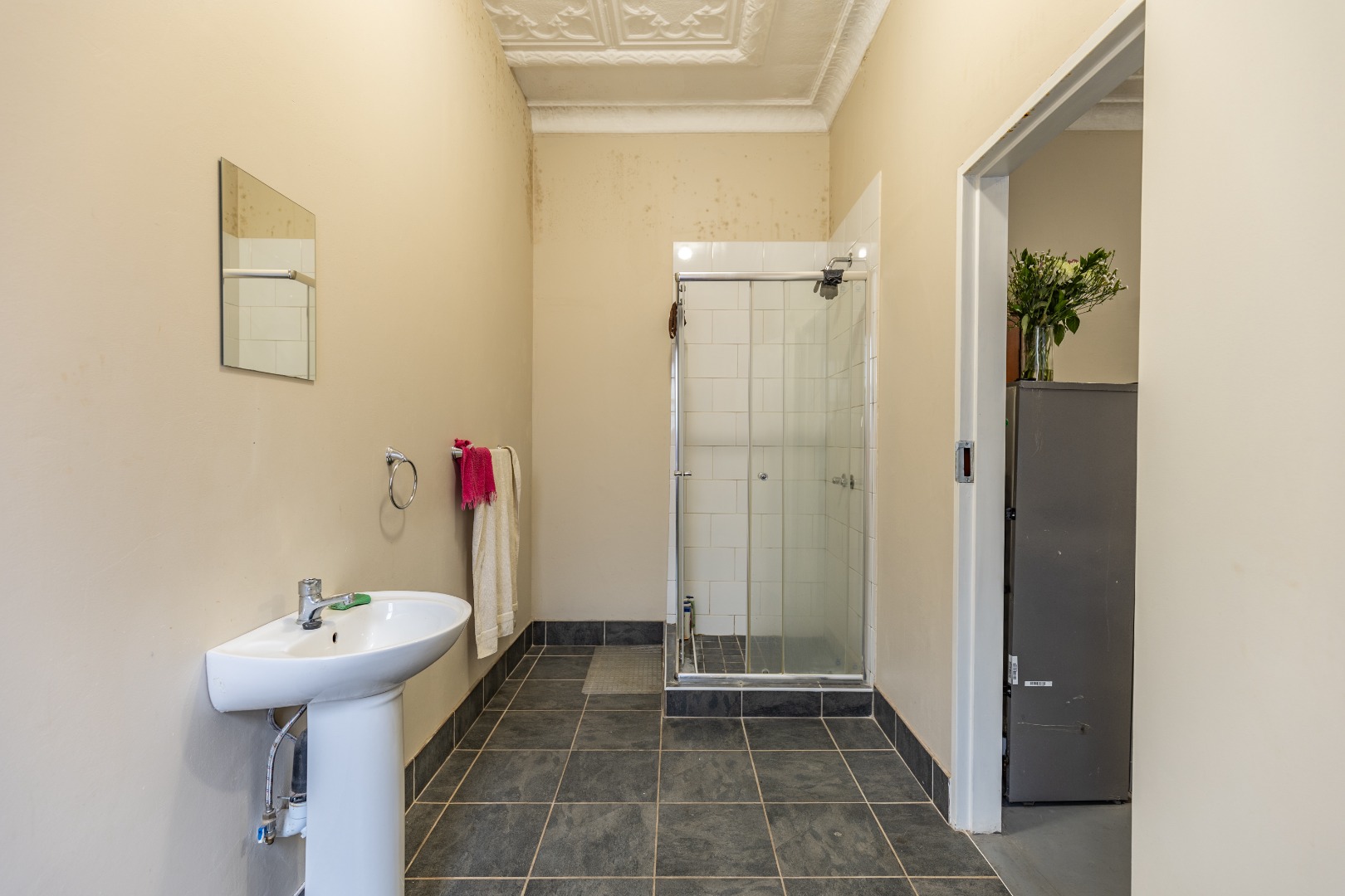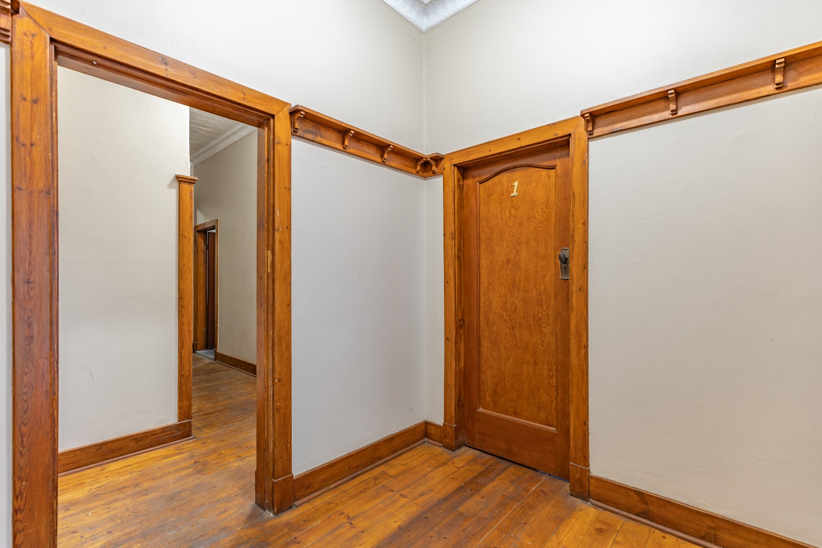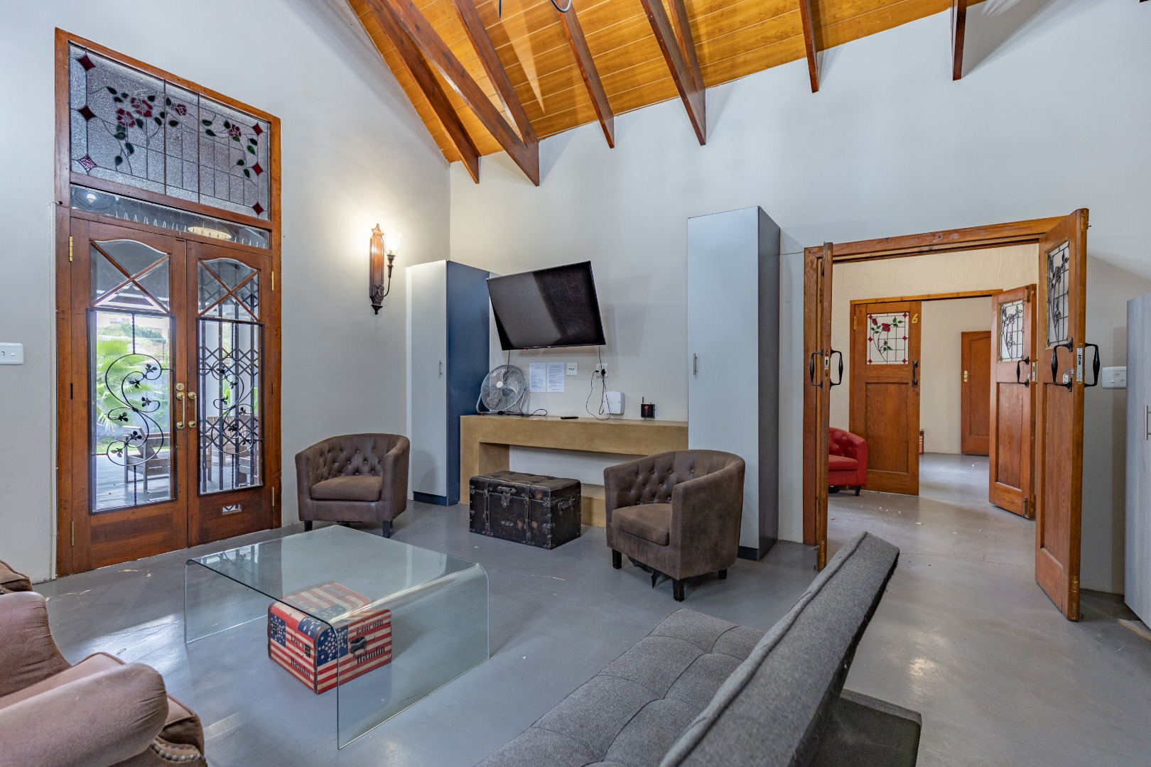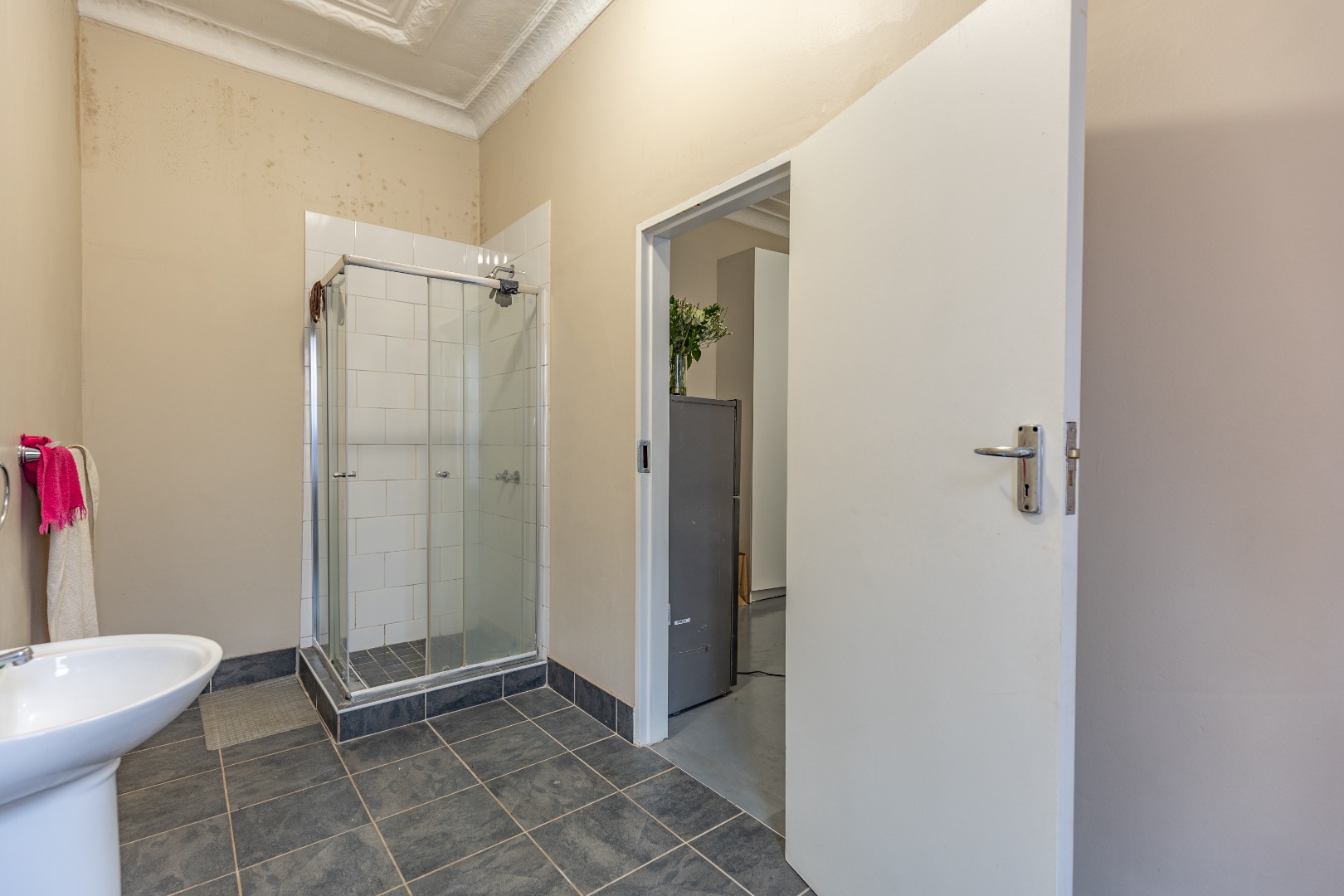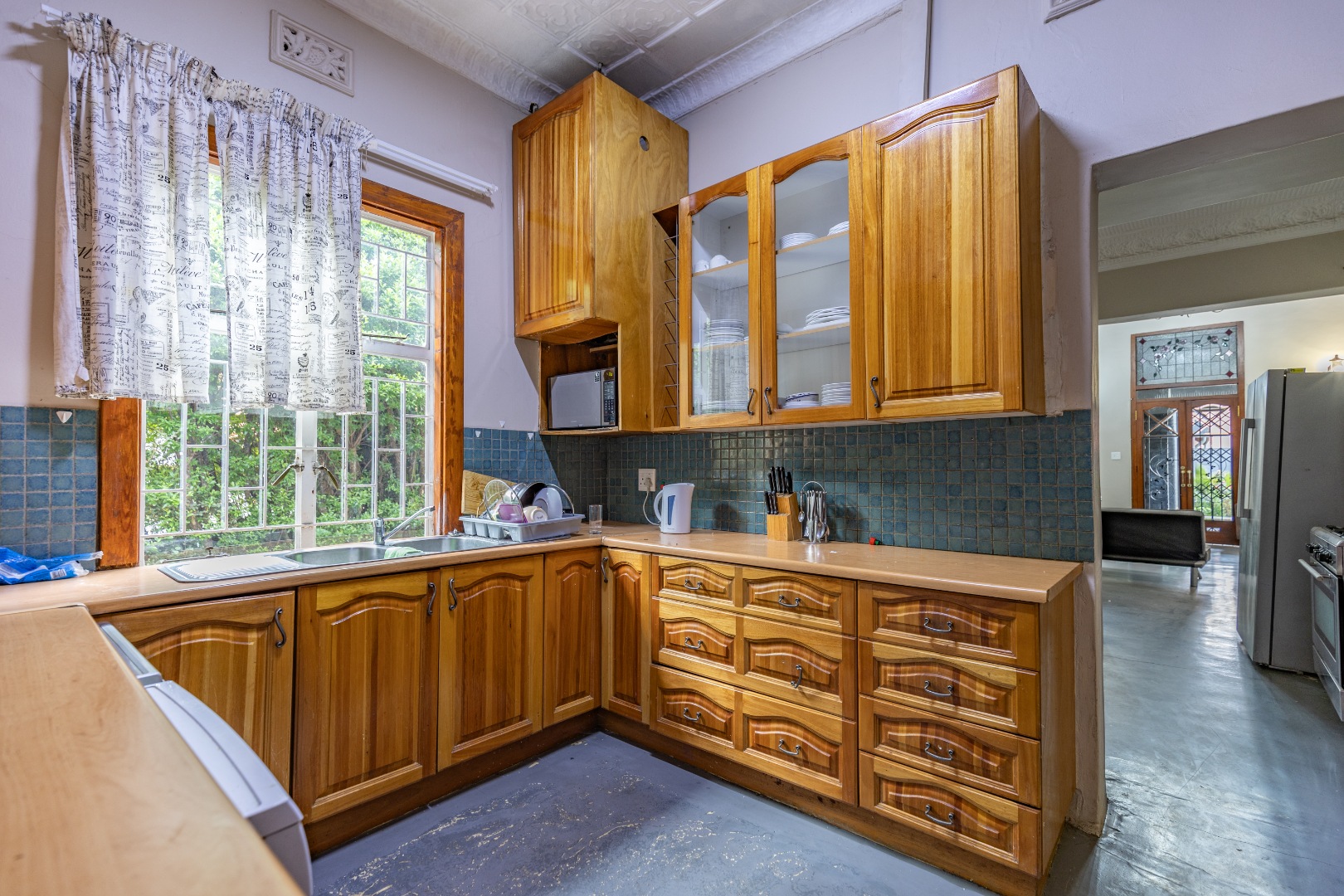 This 1-bedroom, 1-bathroom apartment in Hatfield, Pretoria, offers a comfortable and convenient living space ideal for students. The unit features a well-appointed kitchen and a dedicated family TV room, providing essential amenities for daily life. Architectural character is evident throughout, with unique wooden double doors featuring stained glass accents and decorative ceiling molding adding a touch of elegance to the interior spaces.