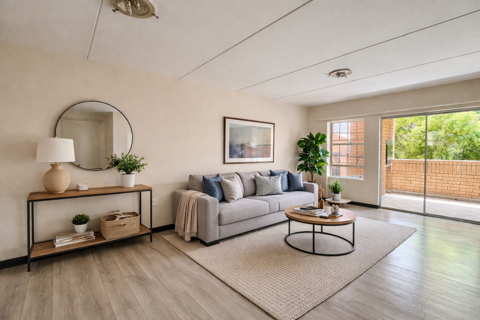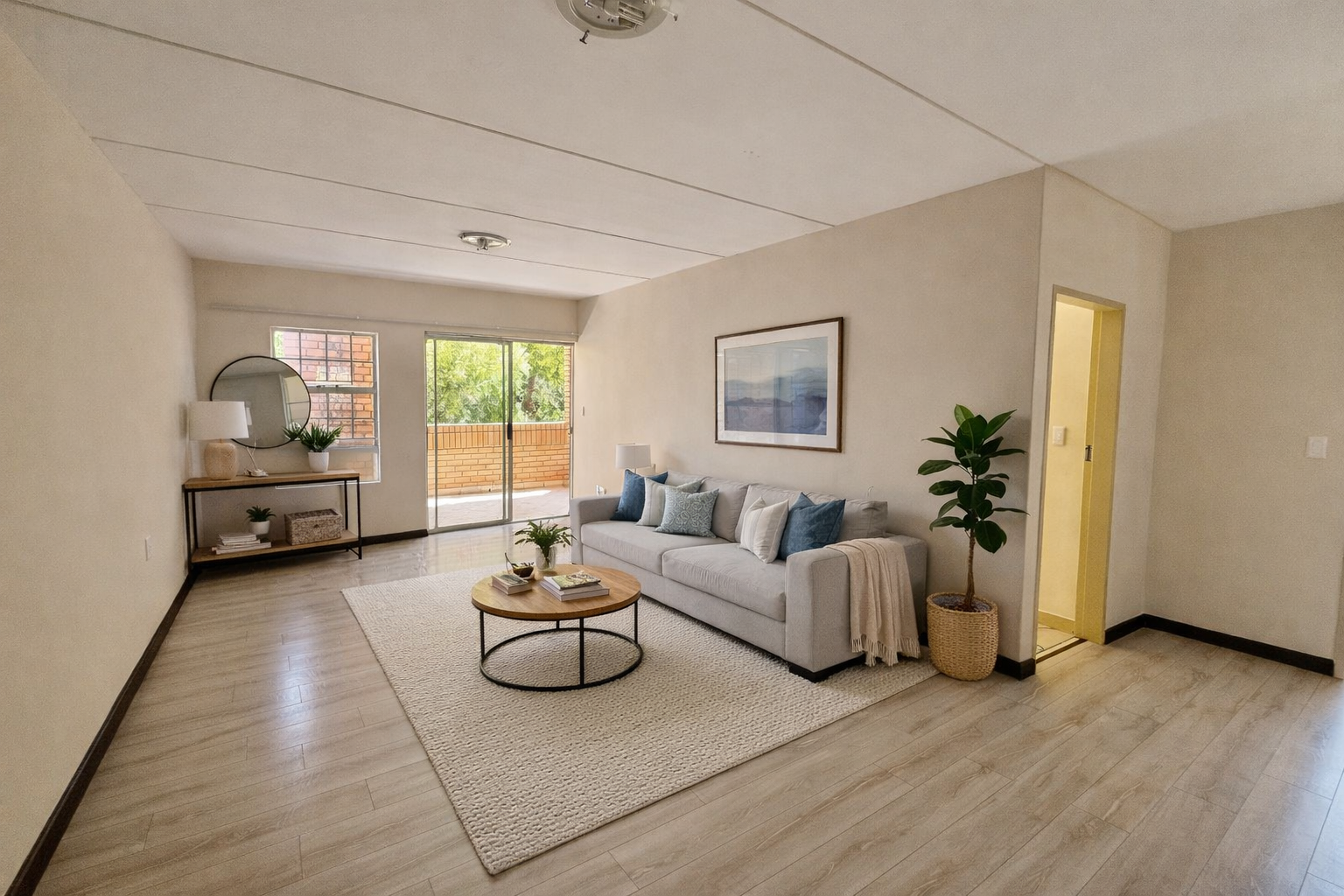The open-plan living area flows seamlessly onto a private balcony with a built-in braai, ideal for entertaining or relaxing after a long day.