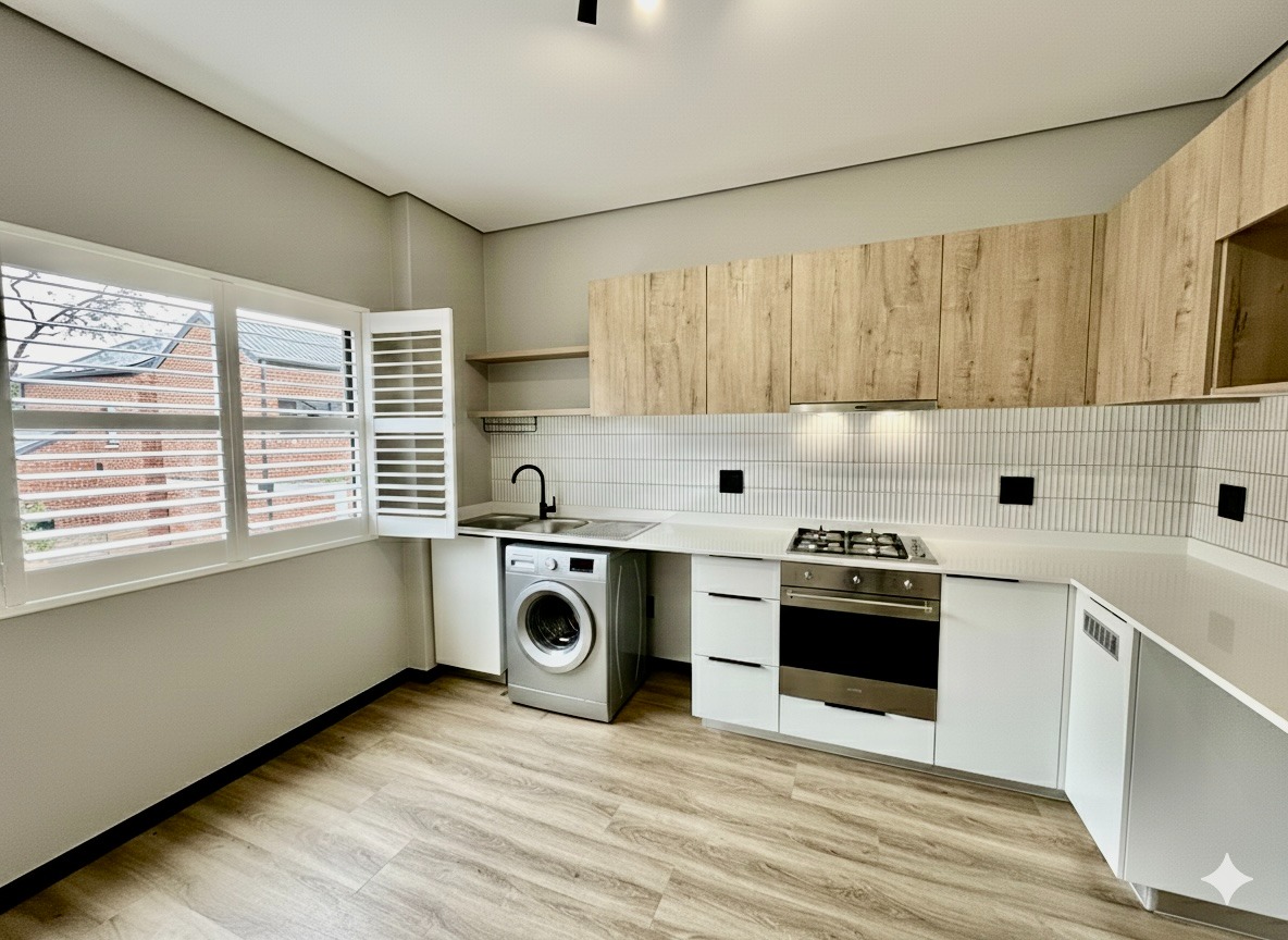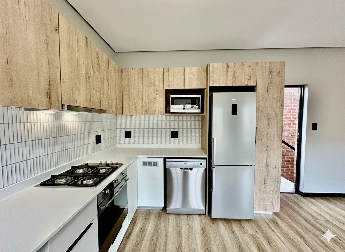 Discover modern student living in this 1-bedroom apartment, perfectly designed for comfort and convenience. The interior boasts a contemporary aesthetic with an open-plan layout seamlessly connecting the lounge and kitchen. The well-appointed kitchen is a highlight, featuring sleek light wood-look cabinetry, pristine white countertops, and a stylish vertical tile backsplash. It comes equipped with a gas stove, oven, built-in microwave, dishwasher, washing machine, and a fridge/freezer, all in stainless steel, complemented by practical under-cabinet lighting. The single bedroom is served by a modern ensuite bathroom, ensuring privacy and ease.