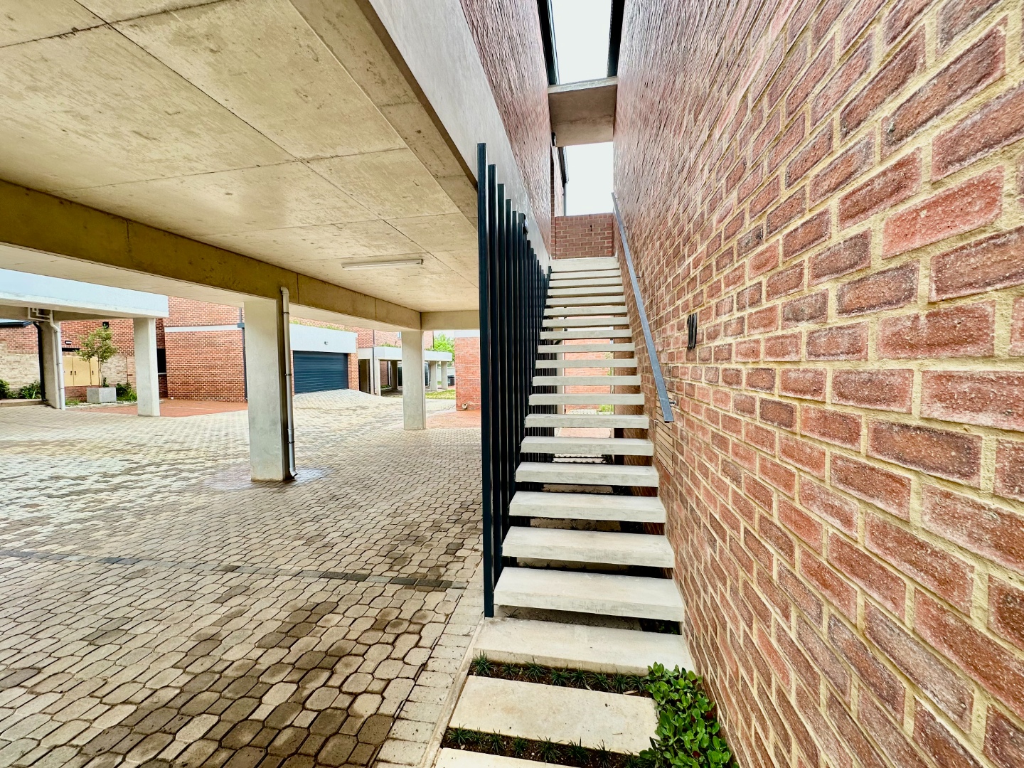 This unit is part of a modern residential complex in Hazelwood, Pretoria, showcasing a striking architectural design with red brick and concrete finishes. Residents benefit from a dedicated covered parking bay, providing secure and convenient vehicle storage within the paved common areas. The lock-up-and-go nature of this apartment makes it an ideal choice for students or young professionals seeking a hassle-free lifestyle in a vibrant university community.