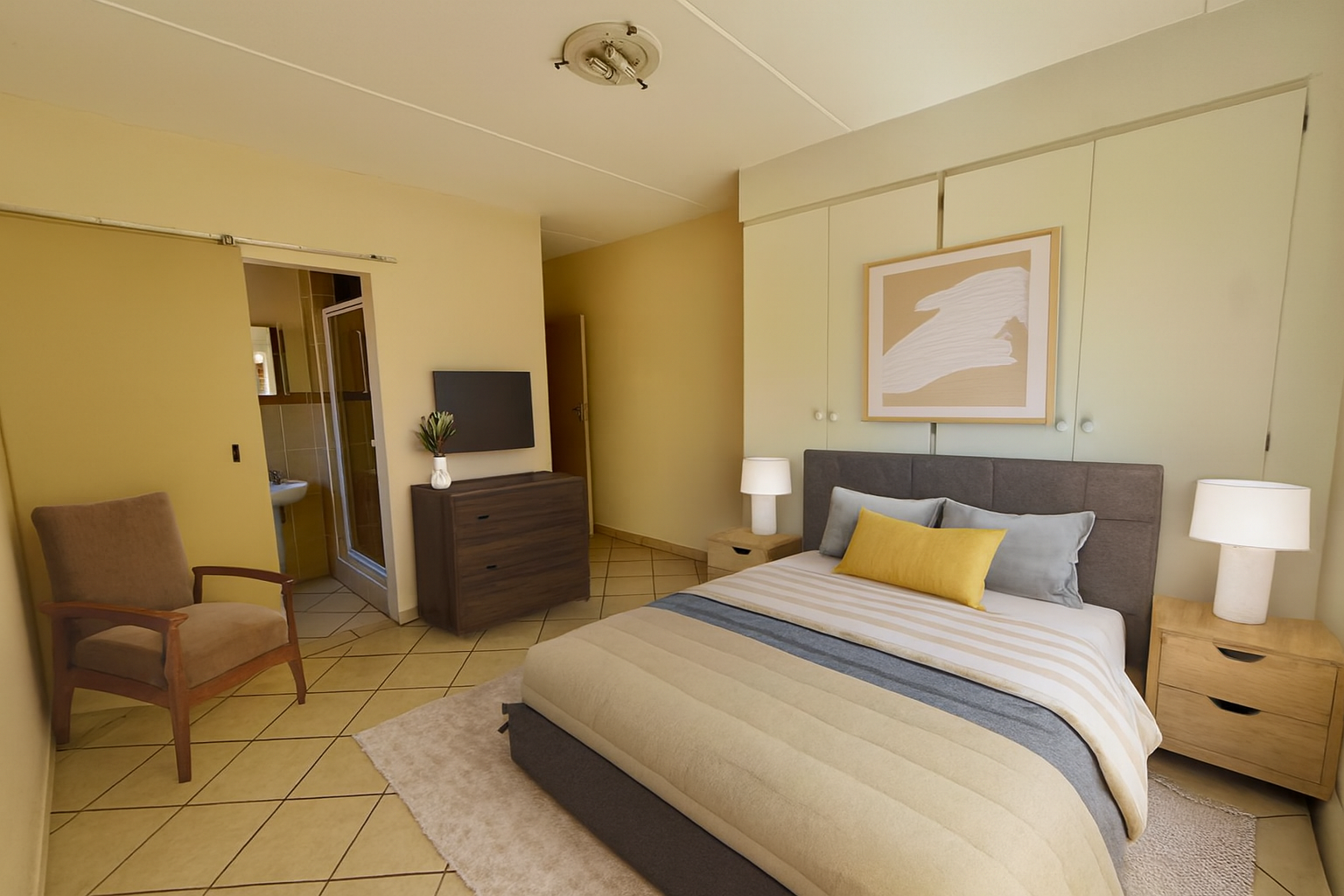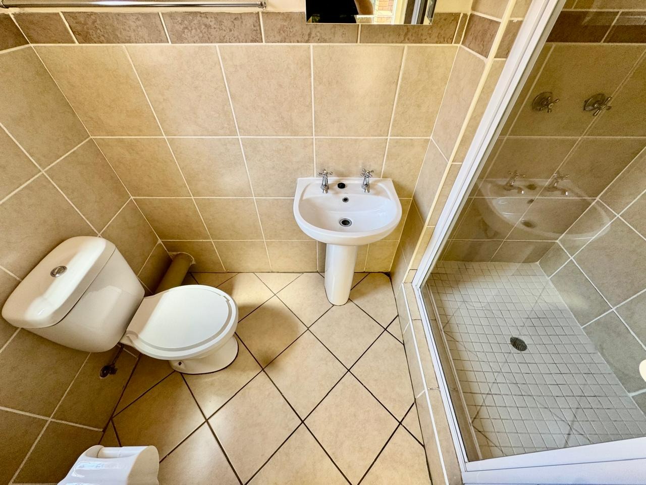 The unit features three fully tiled bedrooms and a laminated lounge, creating a warm and modern living space. The open-plan kitchen is fitted with granite countertops, a pantry, and space for your appliances, flowing seamlessly into the living area.