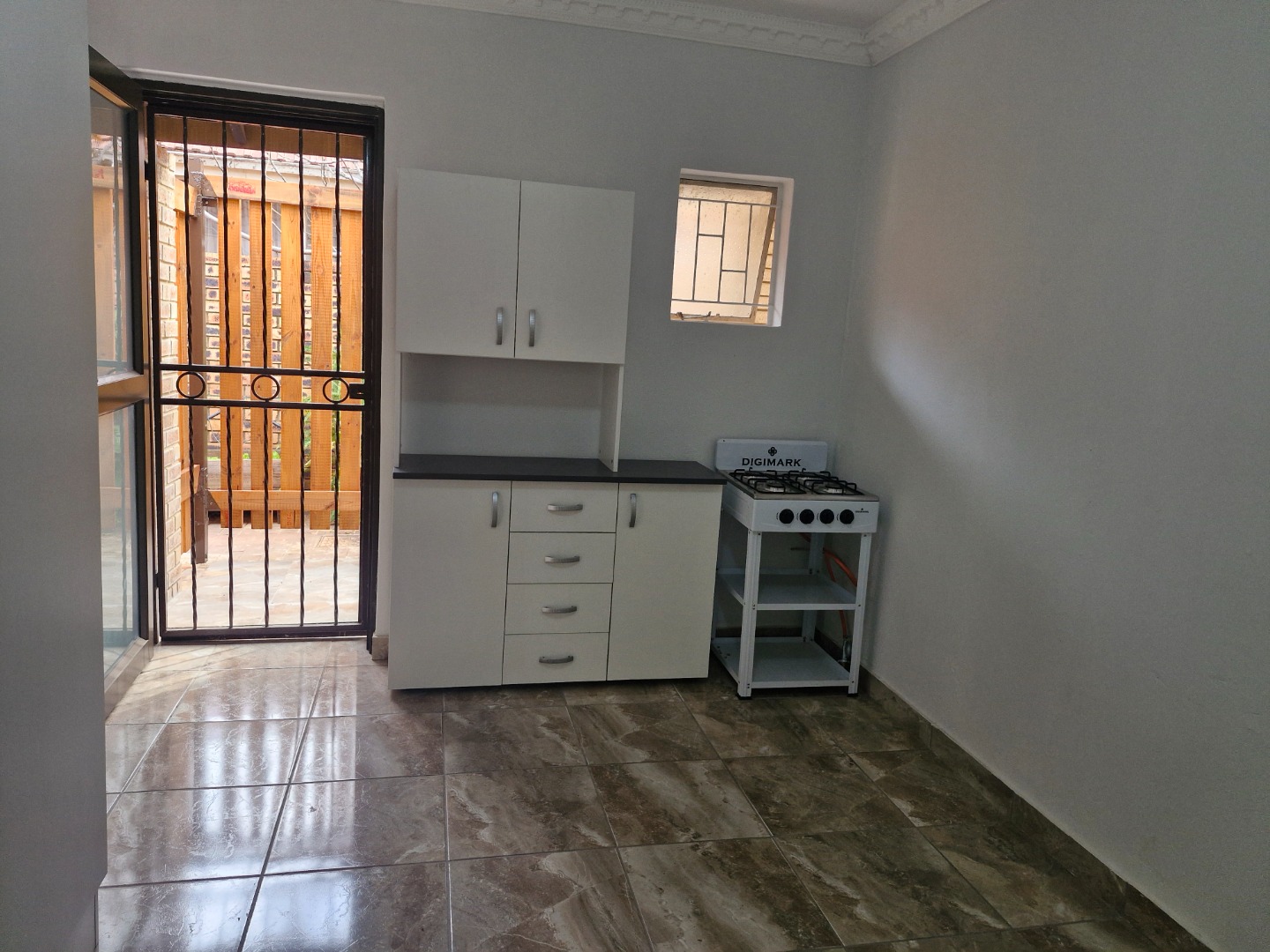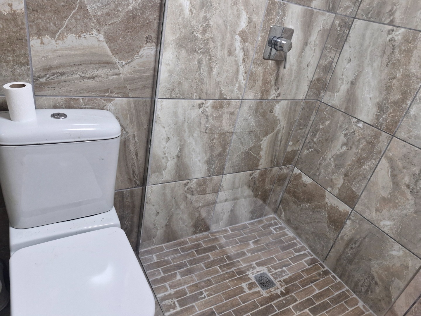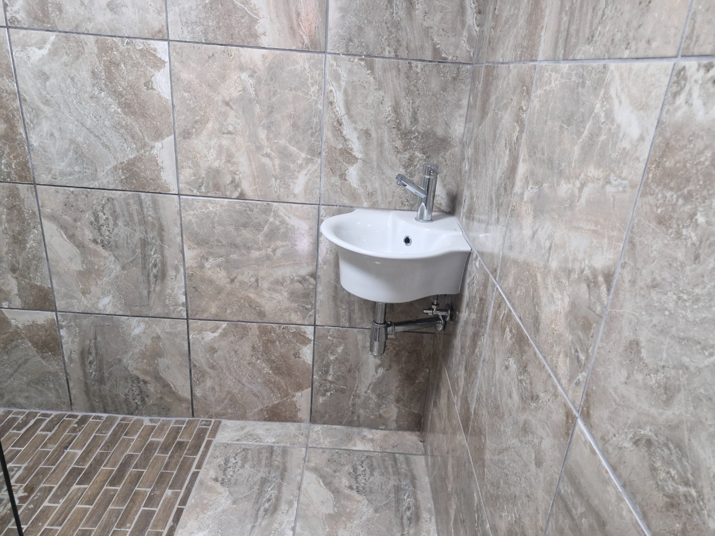 Single room with shower, toilet and basin with built-in cupboard. On one side of the room is a small kitchen cupboard with a 2-burner gas stove. Outside the room is washing machine facility.