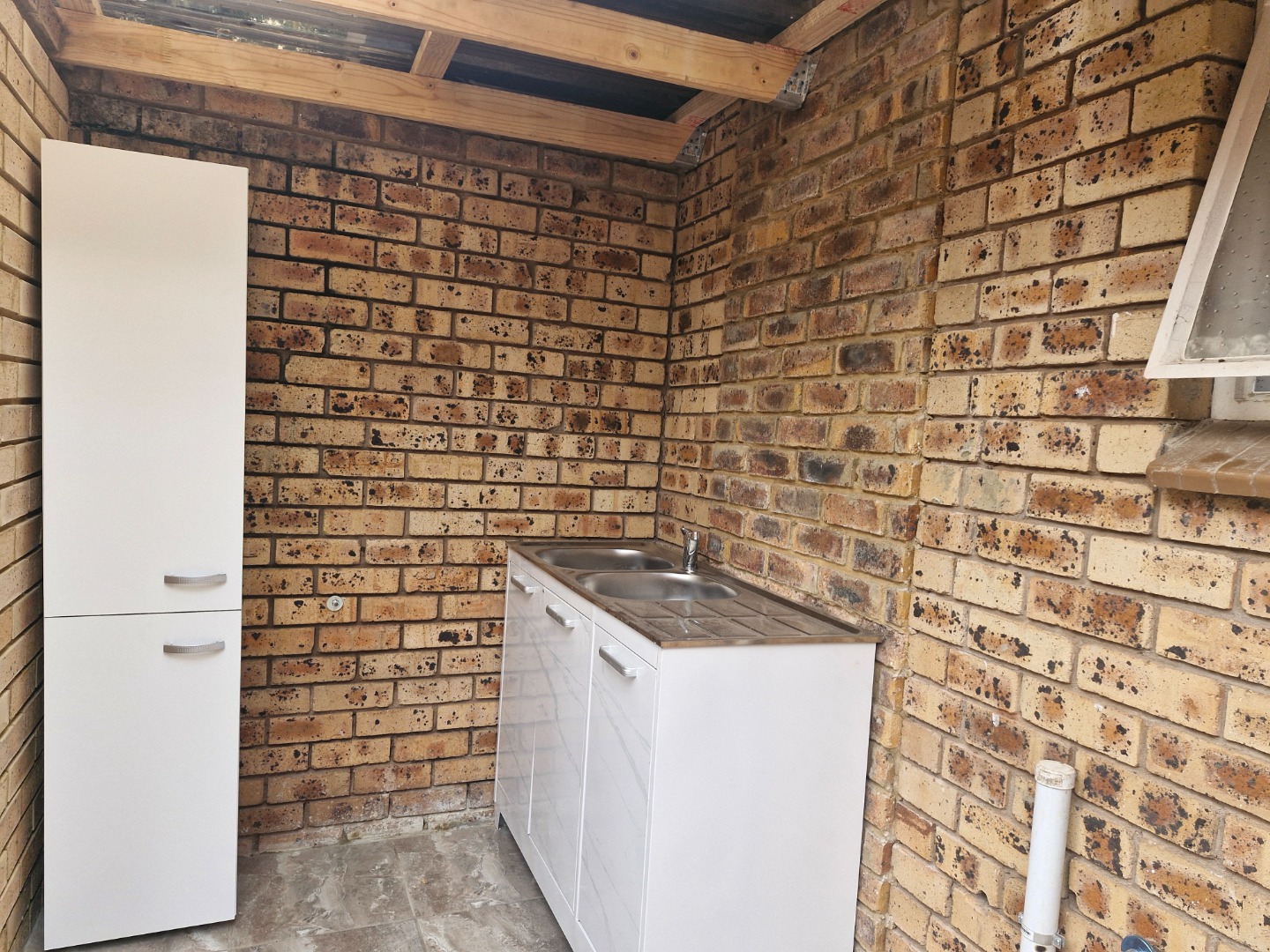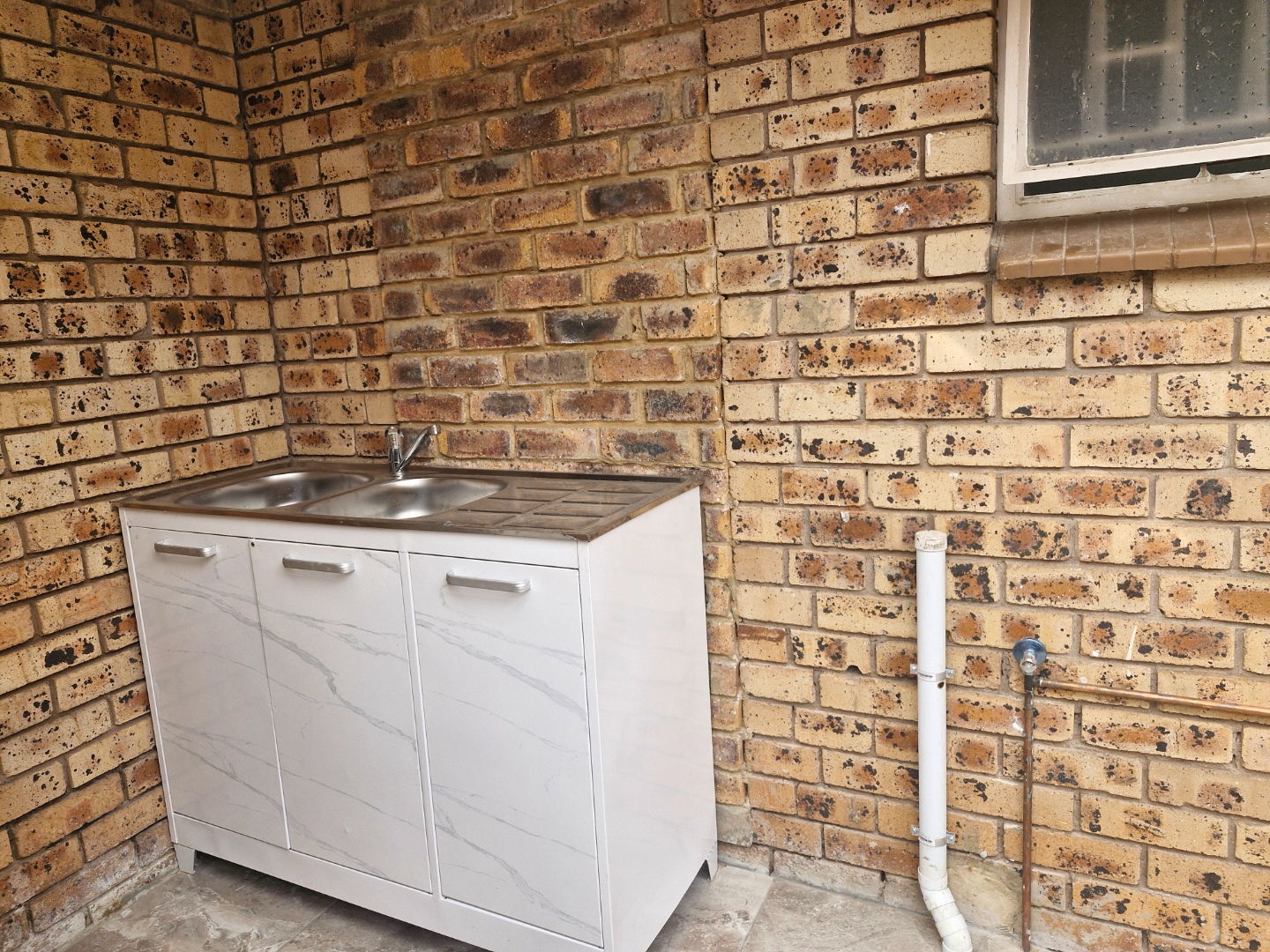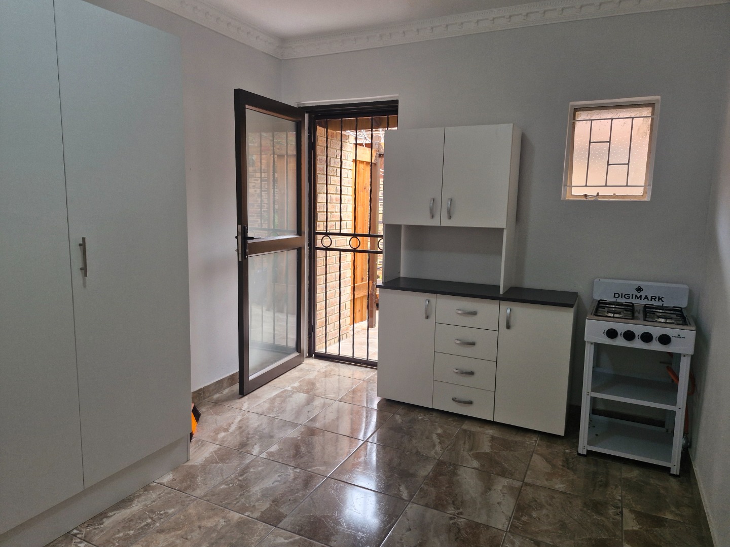 Single room with shower, toilet and basin with built-in cupboard. On one side of the room is a small kitchen cupboard with a 2-burner gas stove. Outside the room is washing machine facility.