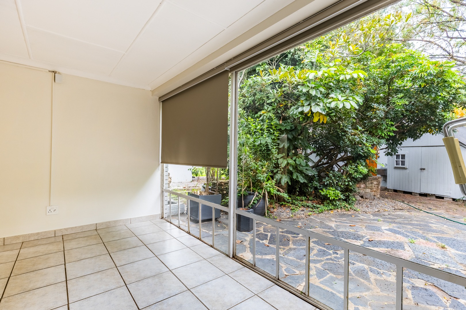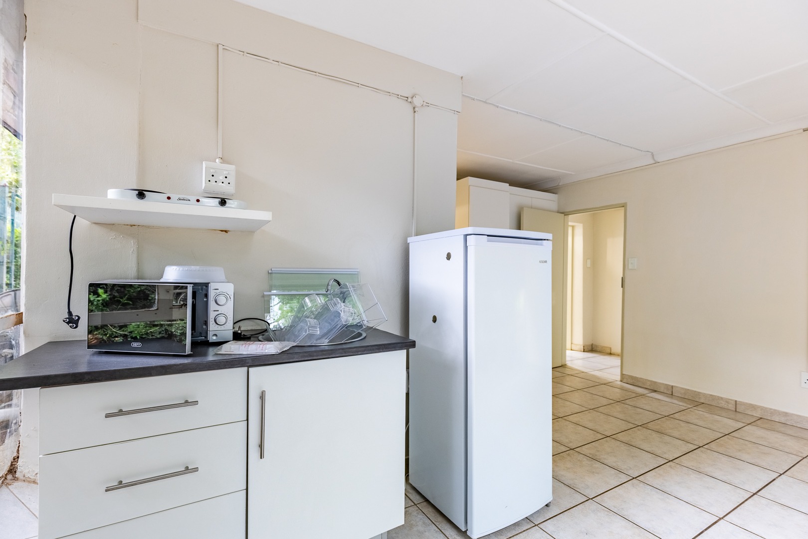 The home features two bedrooms—or one bedroom plus a cosy living room—a modern shower bathroom, and a functional kitchenette equipped with a bar fridge, microwave, and two-plate stove. Outside, residents enjoy access to a beautifully maintained shared garden complete with braai facilities, a jungle gym, and a dedicated children’s play area, creating the perfect space to relax or connect with neighbours.