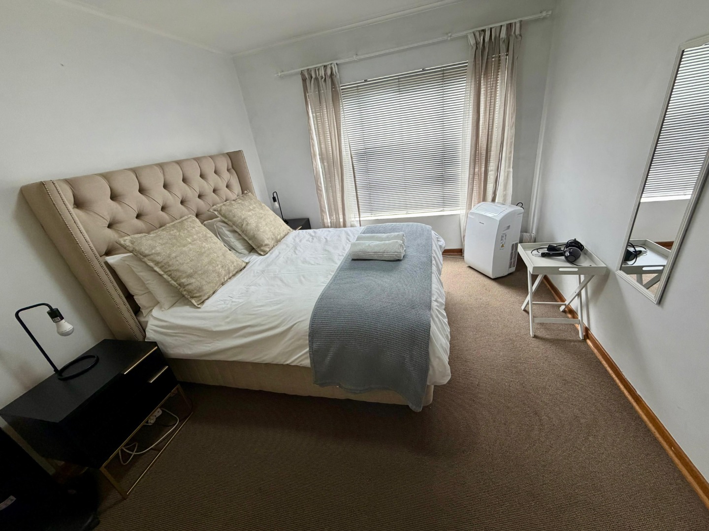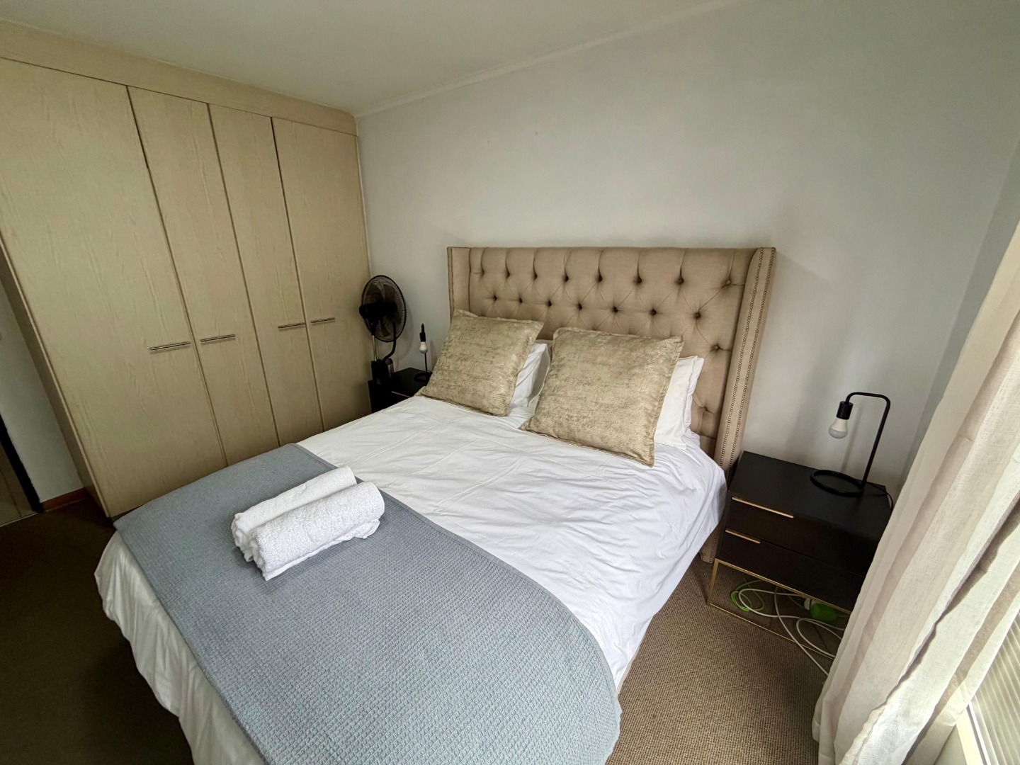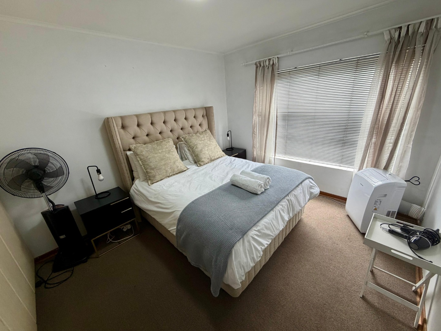 This functional apartment features two well-appointed bedrooms, furnished with a portable air conditioner and fan to ensure comfort. The bathroom includes a bath with a convenient hand-held shower, offering both practicality and relaxation.