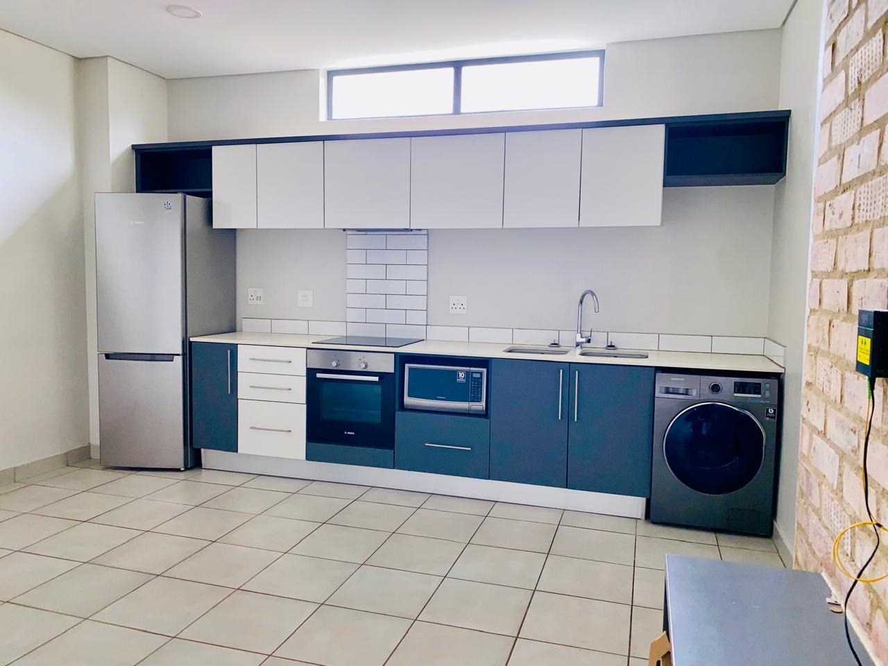 * Sleek kitchen with appliances (washing machine/dryer, fridge/freezer, microwave oven