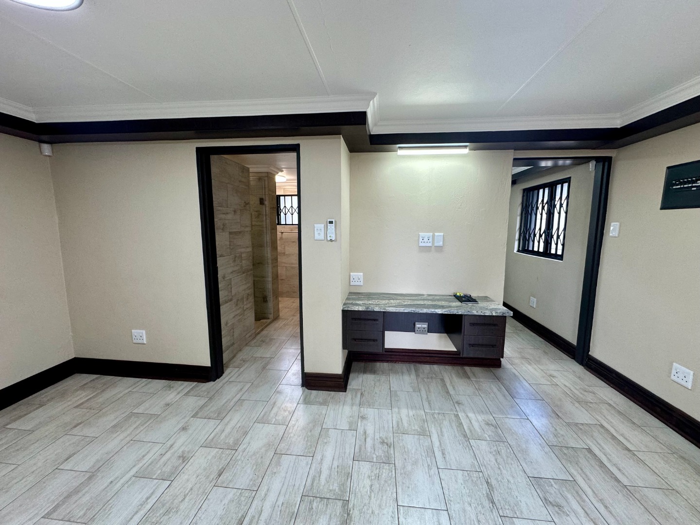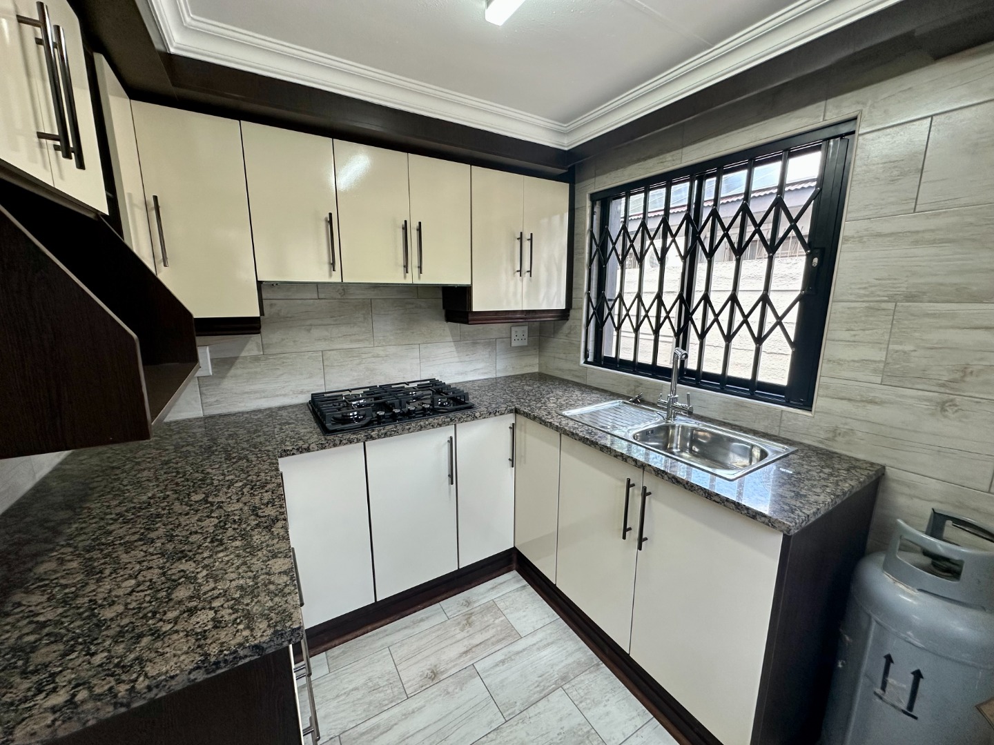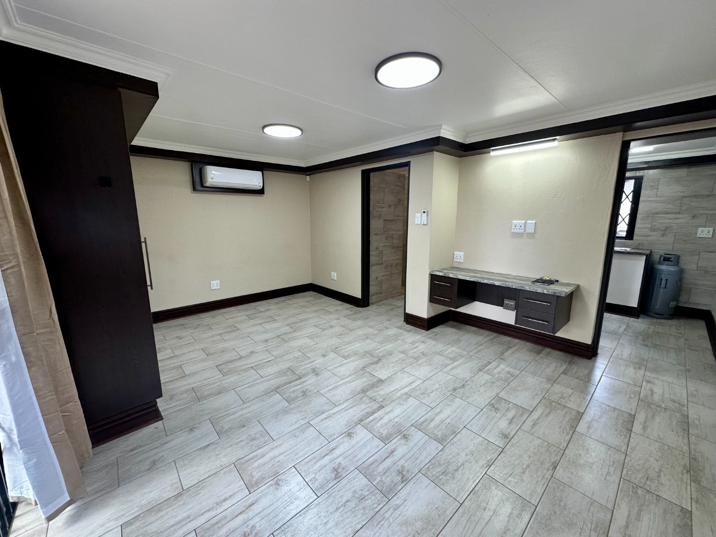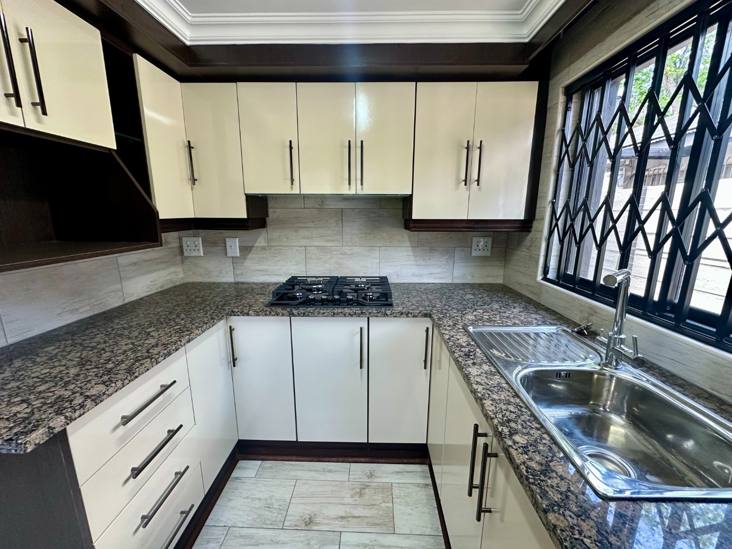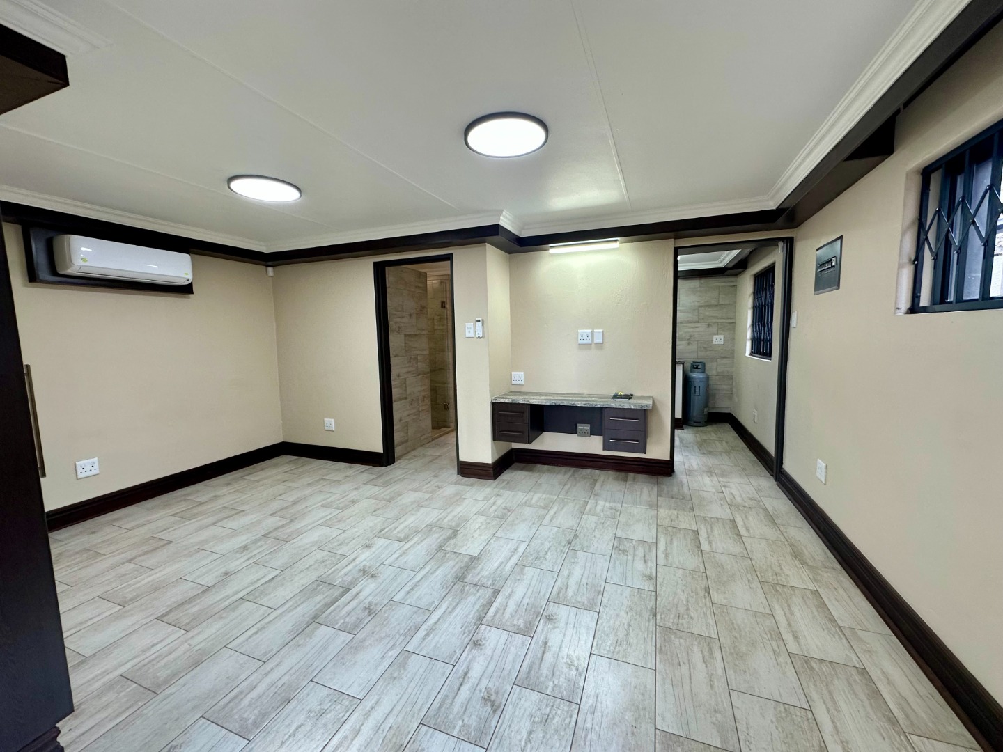 The modern kitchen boasts two-tone cabinetry, granite-look countertops, a built-in gas hob, and a tiled backsplash, providing a functional space for meal preparation. The unit includes a comfortable lounge area, perfect for relaxation. With dual living potential, this self-contained unit offers privacy and independence within a larger property.
