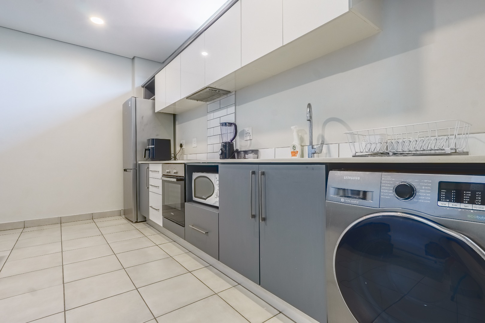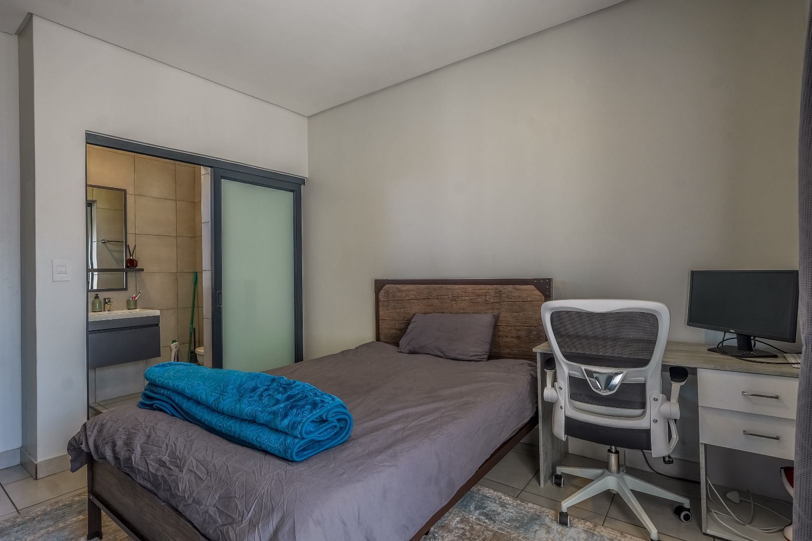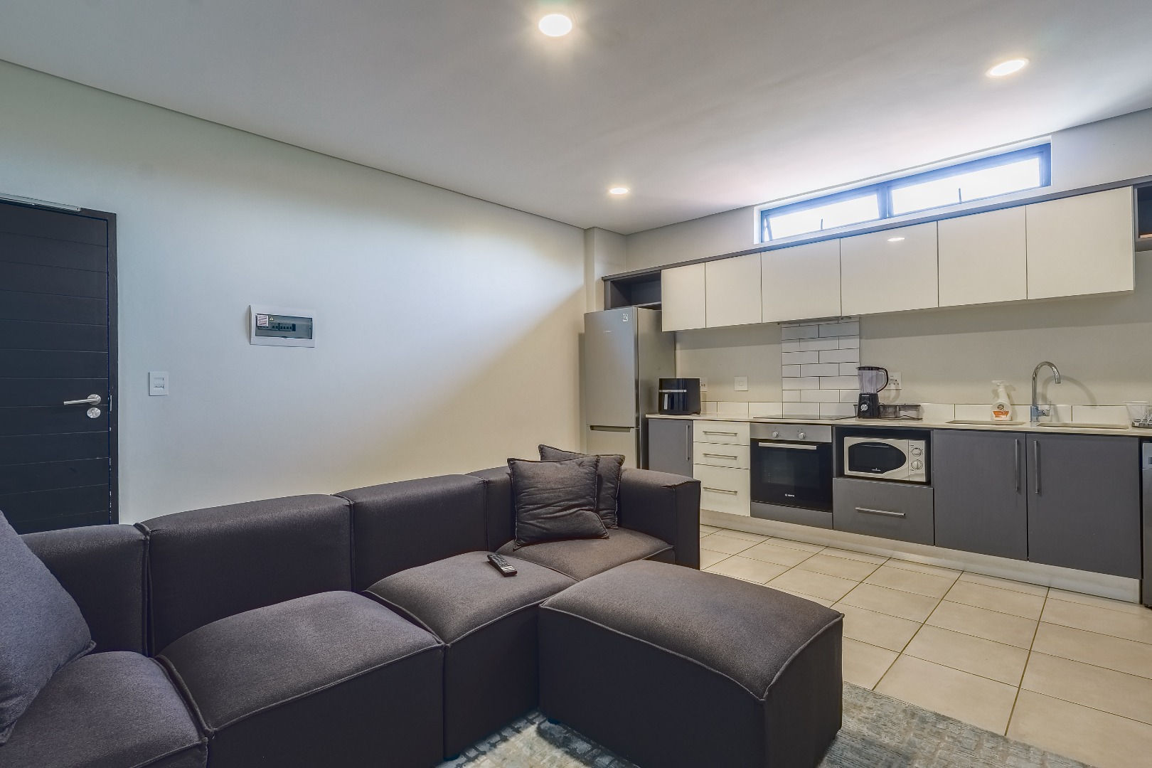 This modern 1-bedroom, 1-bathroom apartment offers sophisticated and convenient living in Menlo Park, Pretoria. The open-plan living area is designed for contemporary comfort, featuring a stylish exposed brick accent wall with space for a wall-mounted TV and a comfortable sectional sofa. The integrated kitchen boasts modern two-tone cabinetry, a subway tile backsplash, and essential appliances including a fridge, stove, oven, microwave, and washing and dryer machine. Tiled flooring throughout ensures a clean, low-maintenance environment. The well-appointed bedroom provides a private sanctuary with space for a study table. Natural light fills the room. The en-suite bathroom, accessible via a modern frosted sliding door, showcases sleek grey tiling, a floating vanity, and a contemporary glass-enclosed shower. Built-in wardrobes offer practical storage, contributing to the apartment's efficient design.