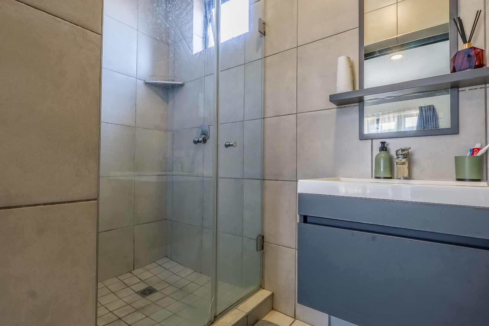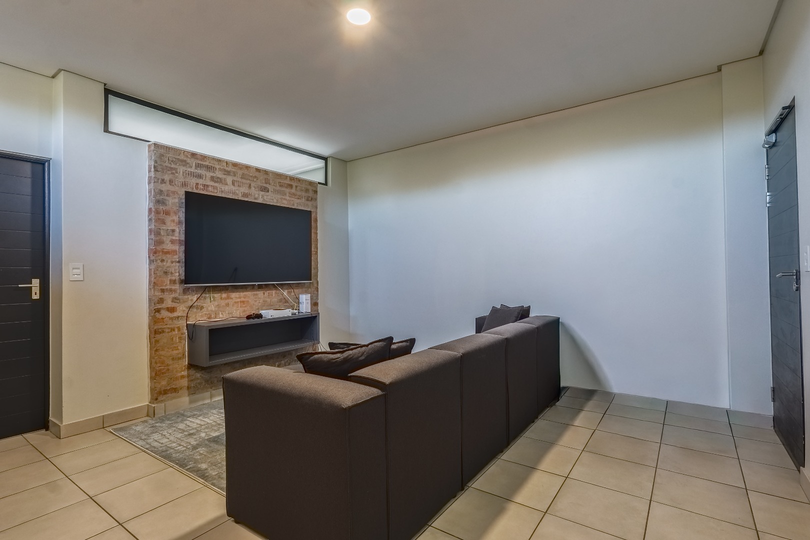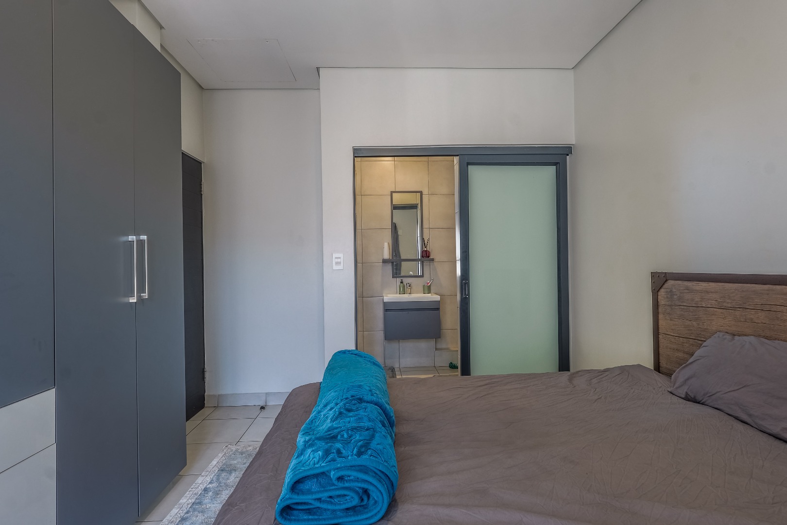 This modern 1-bedroom, 1-bathroom apartment offers sophisticated and convenient living in Menlo Park, Pretoria. The open-plan living area is designed for contemporary comfort, featuring a stylish exposed brick accent wall with space for a wall-mounted TV and a comfortable sectional sofa. The integrated kitchen boasts modern two-tone cabinetry, a subway tile backsplash, and essential appliances including a fridge, stove, oven, microwave, and washing and dryer machine. Tiled flooring throughout ensures a clean, low-maintenance environment. The well-appointed bedroom provides a private sanctuary with space for a study table. Natural light fills the room. The en-suite bathroom, accessible via a modern frosted sliding door, showcases sleek grey tiling, a floating vanity, and a contemporary glass-enclosed shower. Built-in wardrobes offer practical storage, contributing to the apartment's efficient design.