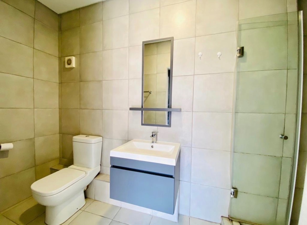 The bathroom continues the contemporary theme, boasting light grey tiles, a glass-enclosed shower, wall-mounted vanity, extractor fan, and a thoughtfully placed high-set window for natural ventilation. Step outside to your private balcony—the perfect spot to unwind with morning coffee or an evening breeze.