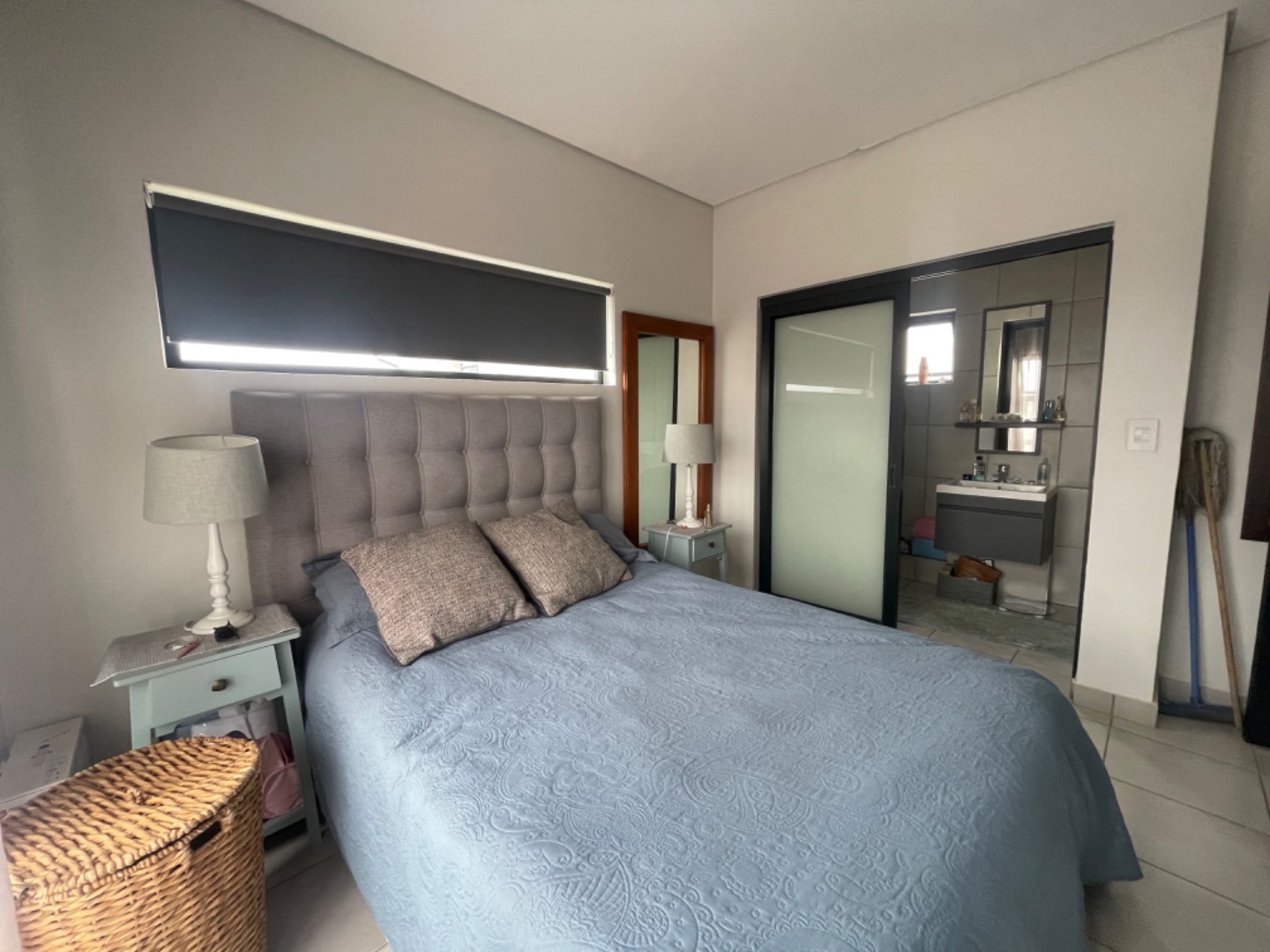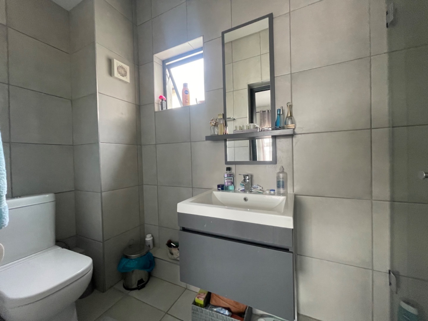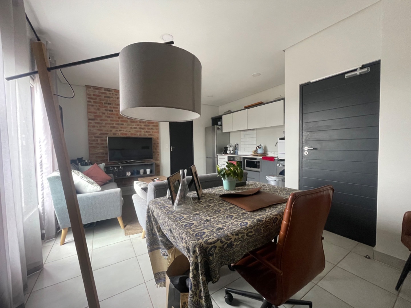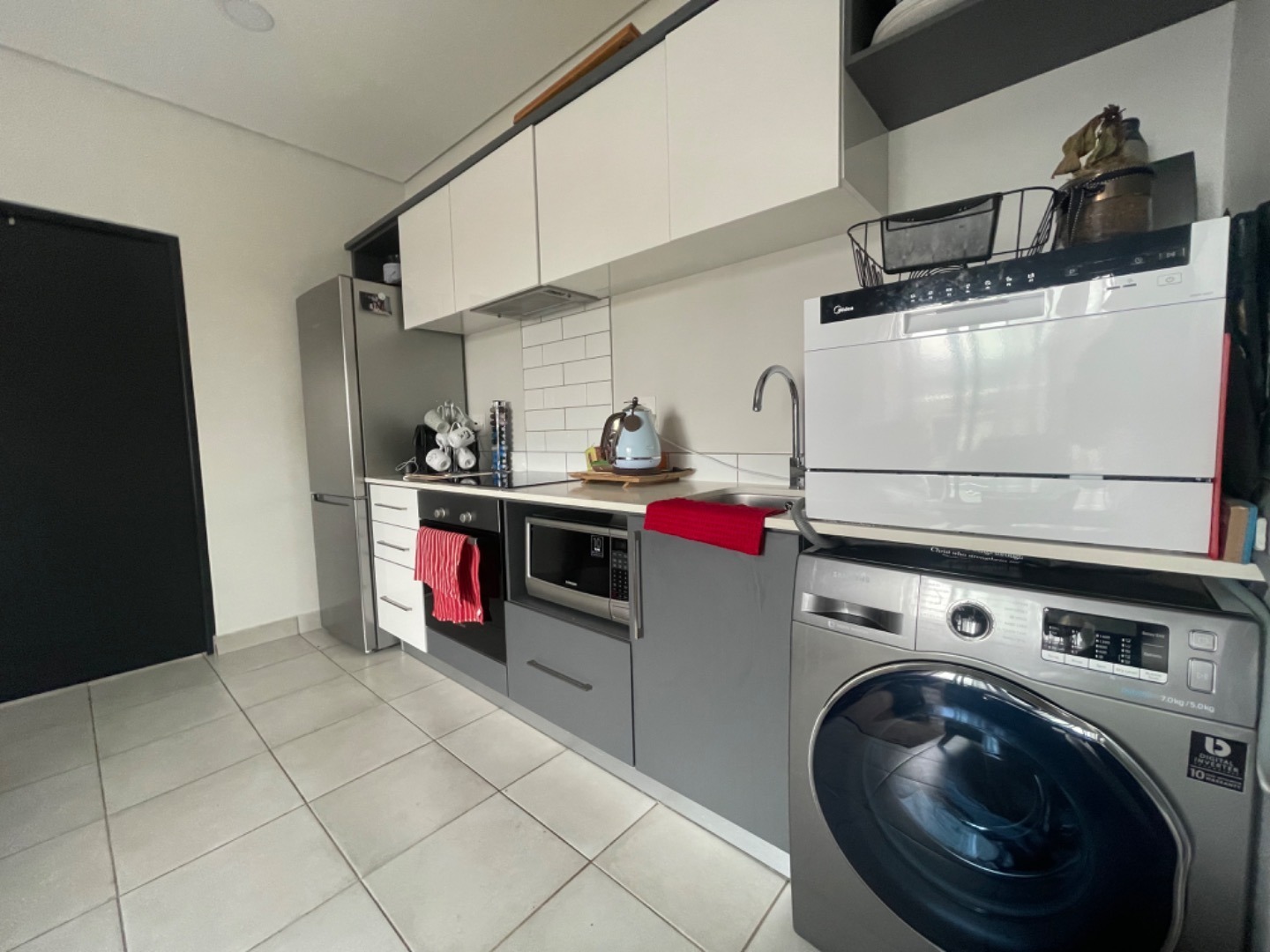 The bedroom is well-sized and includes an en-suite bathroom, providing privacy and comfort. Clean, modern finishes throughout the apartment enhance its sleek, urban appeal.