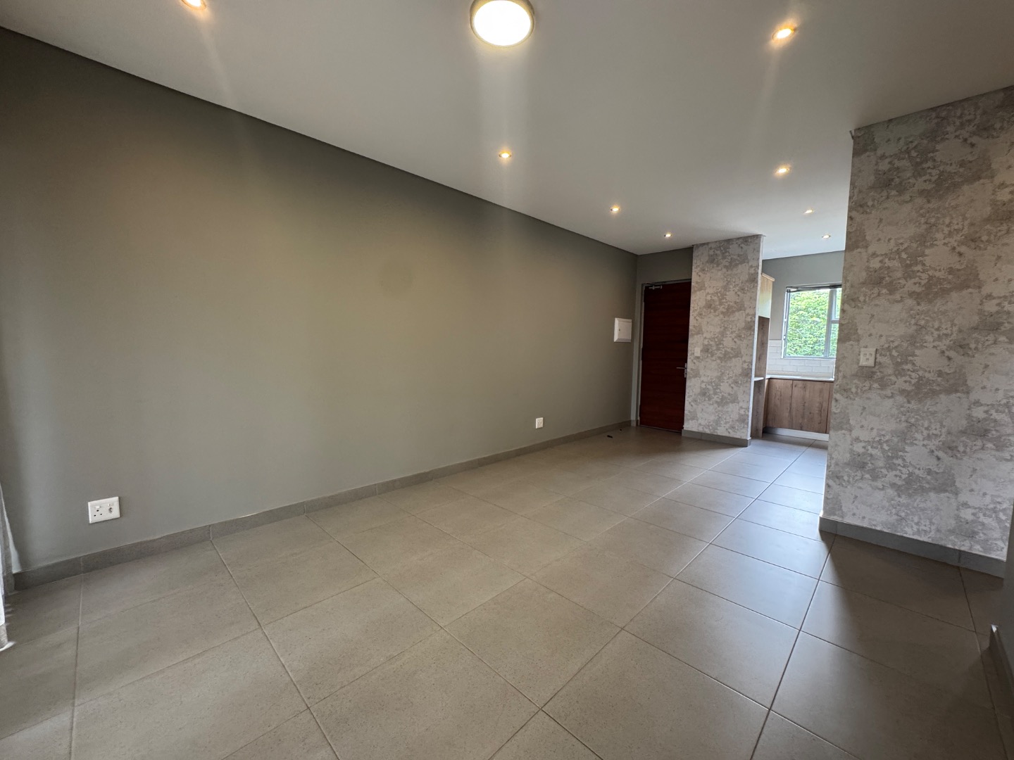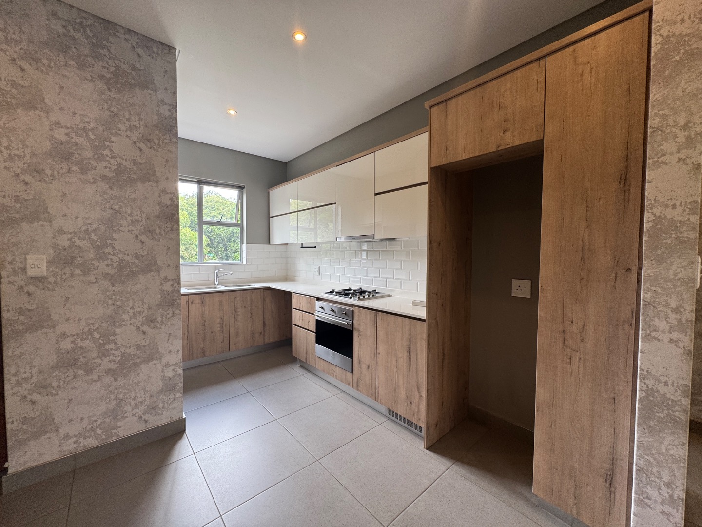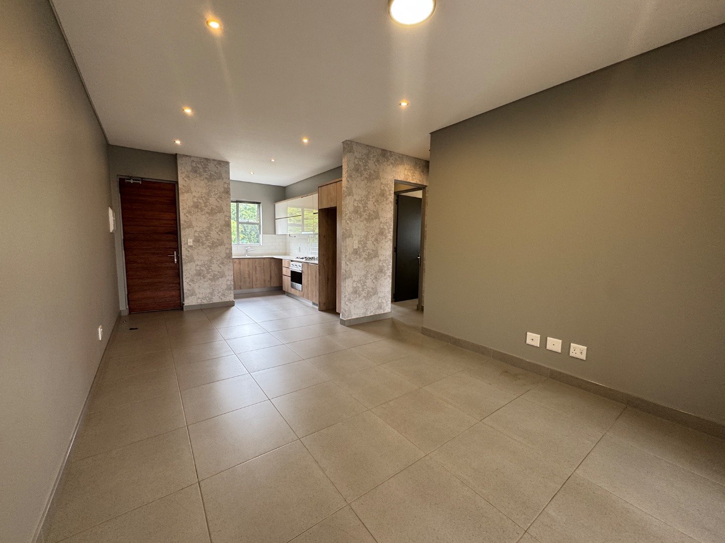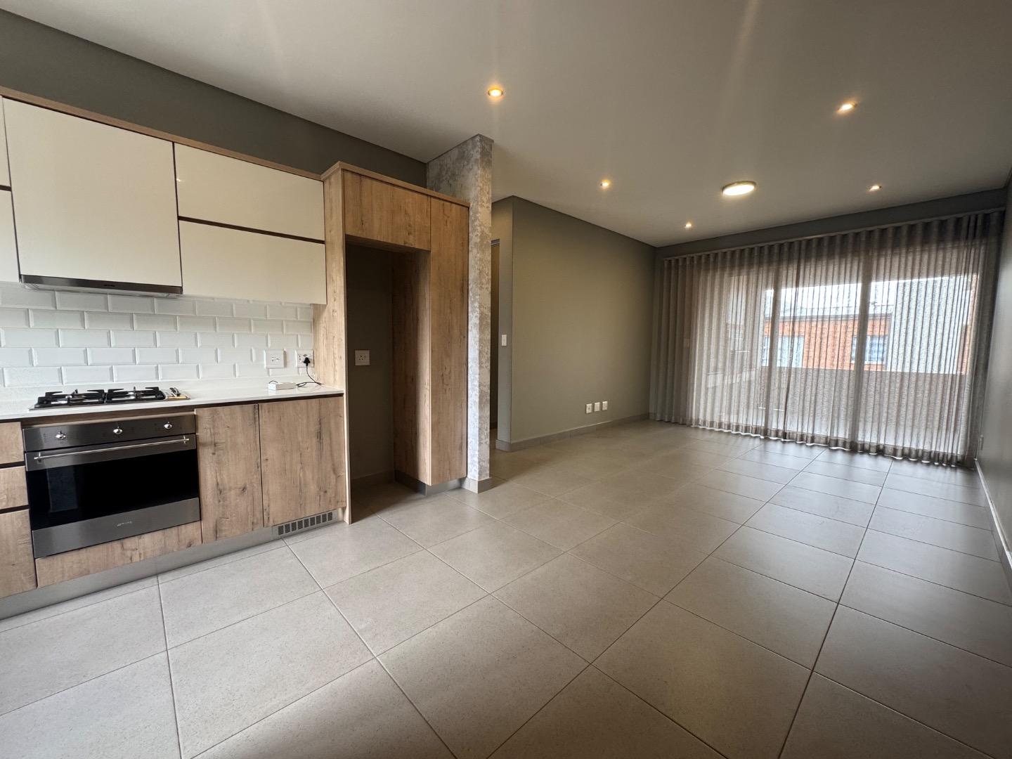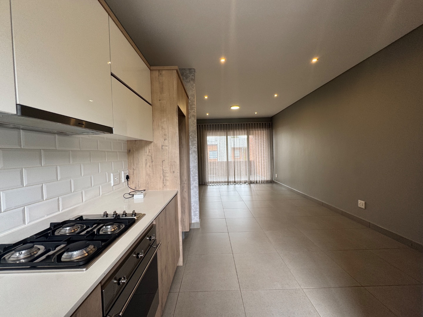 The open-plan living area seamlessly integrates a lounge, dining space, and a modern kitchen. The kitchen is well-appointed with contemporary wood-look and cream cabinetry, a sleek subway tile backsplash, an integrated oven, and a gas hob. Large sliding doors extend the living space to a private balcony or patio, complete with a built-in braai, ideal for entertaining or relaxing. Throughout the apartment, you'll find neutral tiled flooring and recessed ceiling lighting, creating a bright and inviting atmosphere.