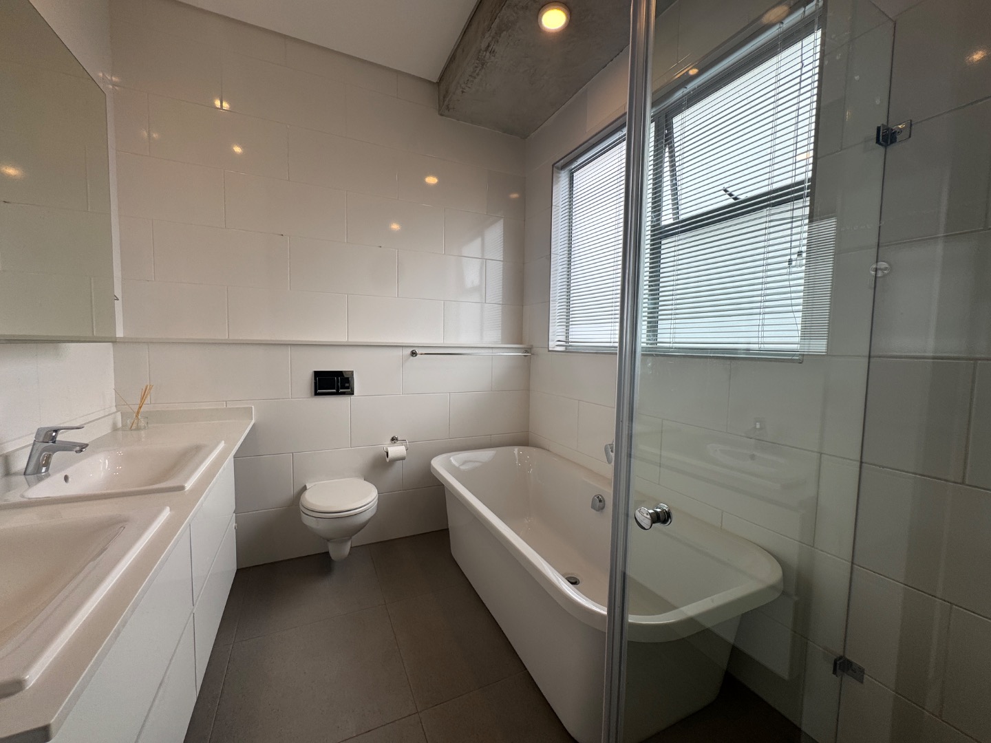 Both bedrooms feature extensive built-in wardrobes, offering ample storage, and benefit from abundant natural light. The two bathrooms are designed with modern aesthetics, including a dual-sink vanity, a wall-mounted toilet, and a combination of a bathtub and a separate glass-enclosed shower, ensuring comfort and convenience.