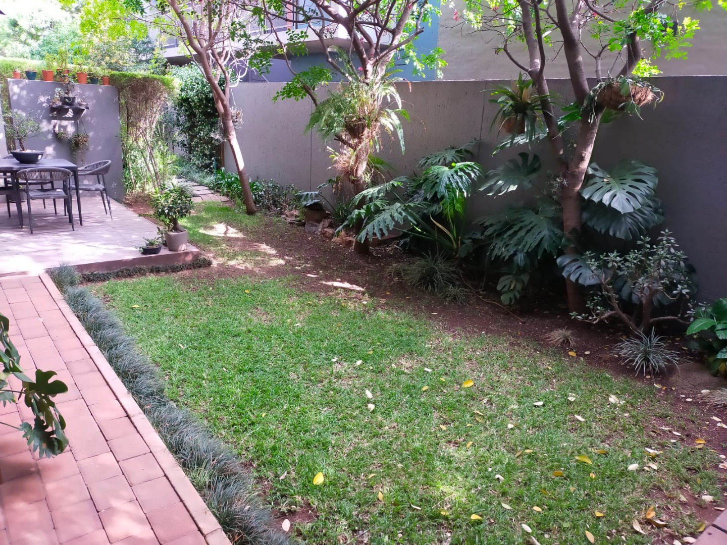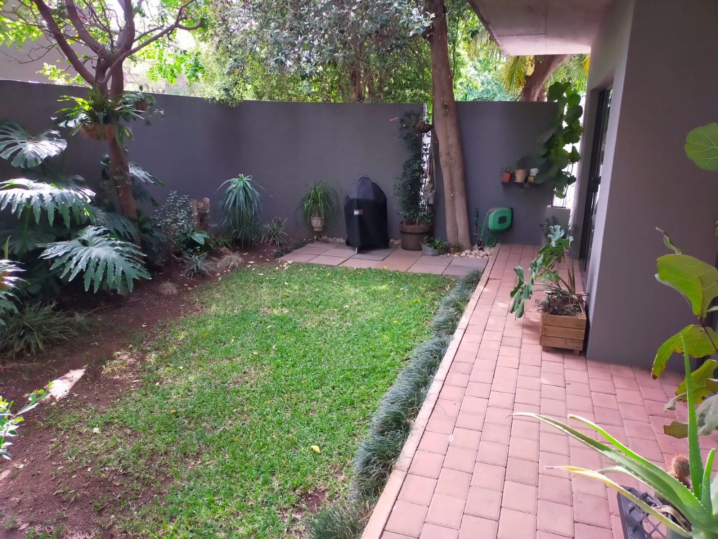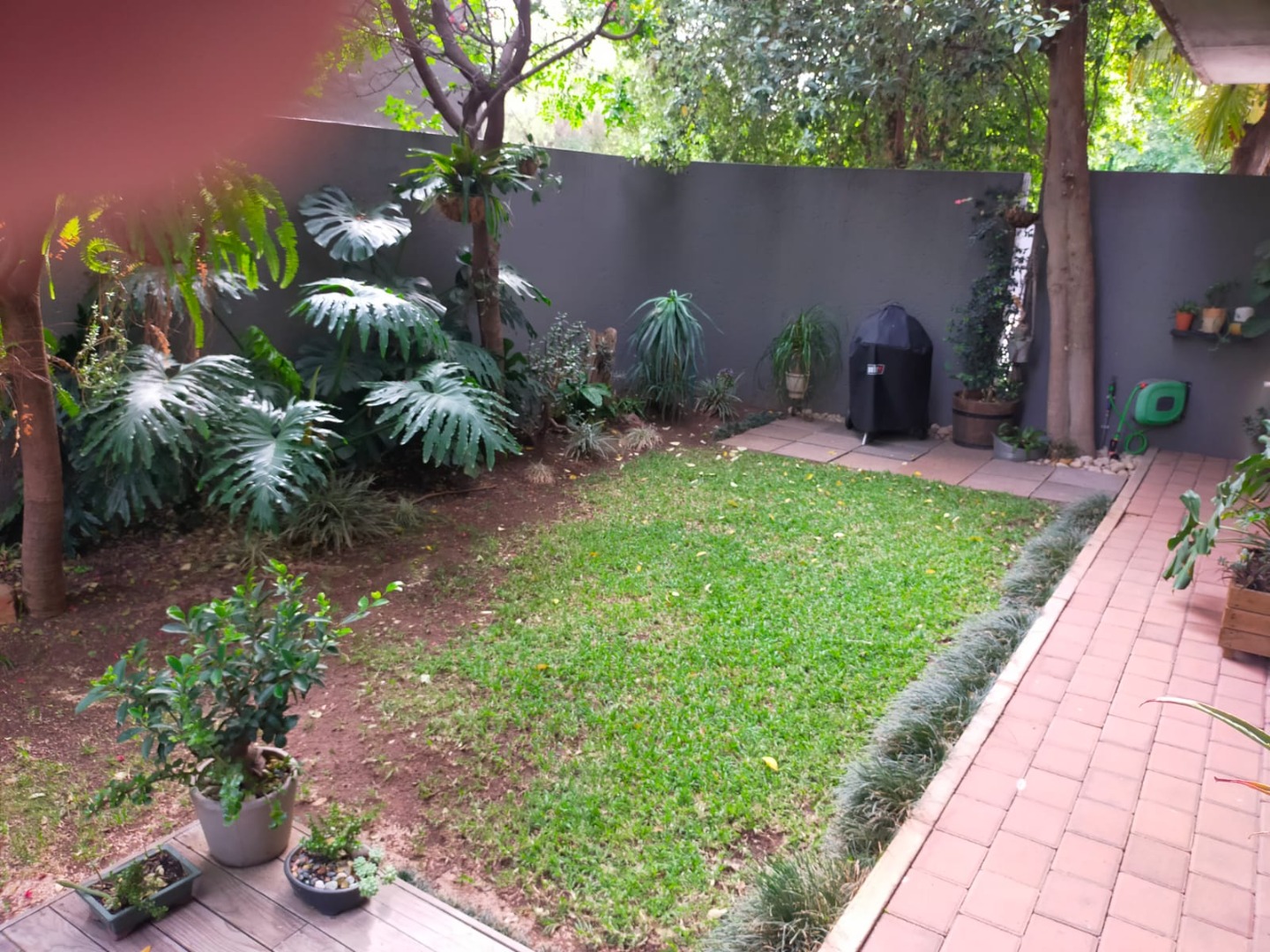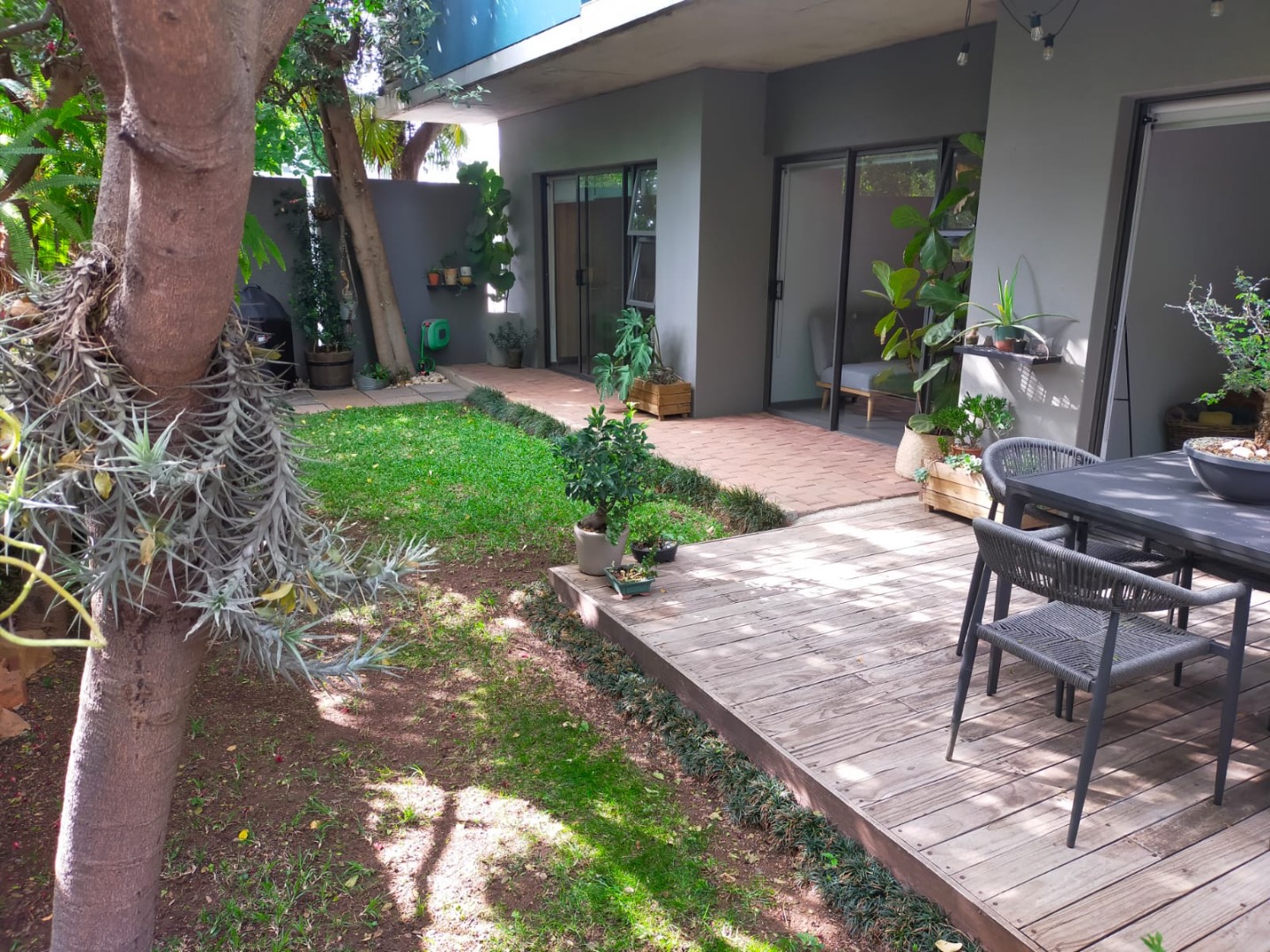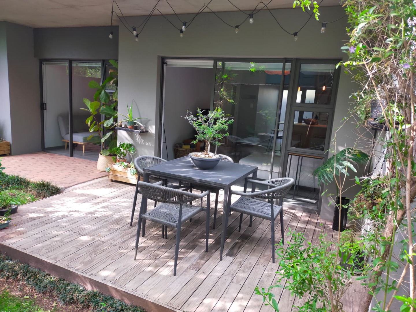 The property boasts a lush, tropical-style garden featuring a wooden deck and paved areas, ideal for relaxation and entertaining. Enjoy alfresco dining with the included modern outdoor set, or host a braai in your secluded space, surrounded by mature greenery and high privacy walls. The garden provides a serene escape, making it perfect for those who appreciate outdoor living.