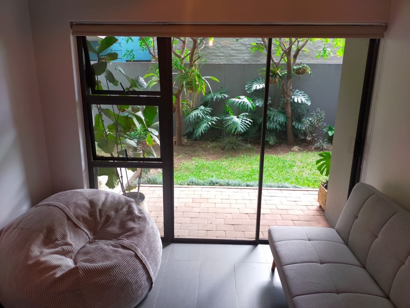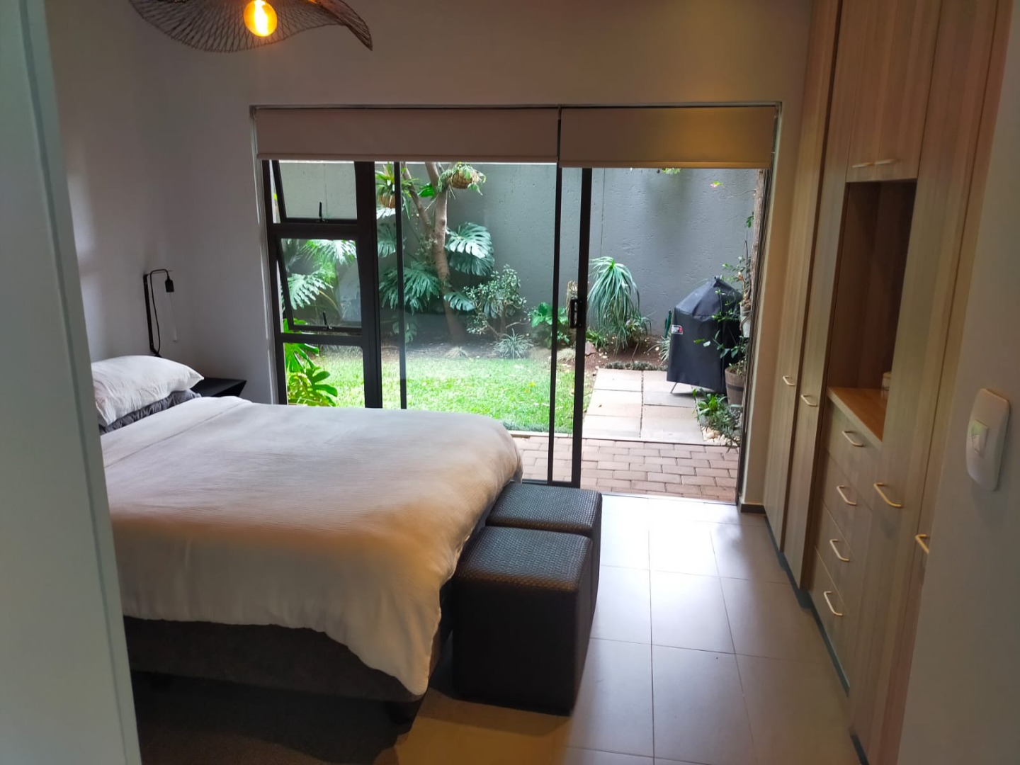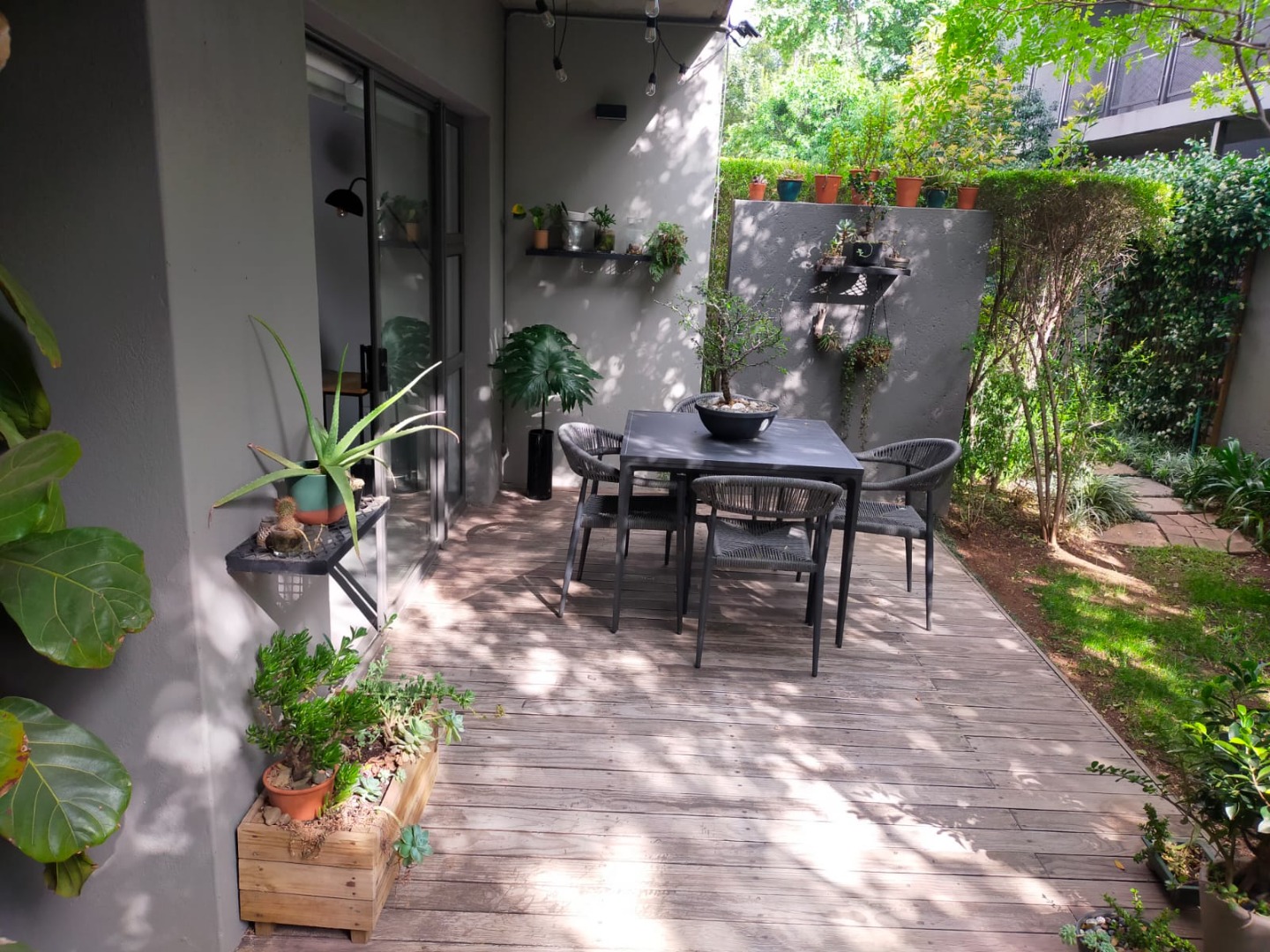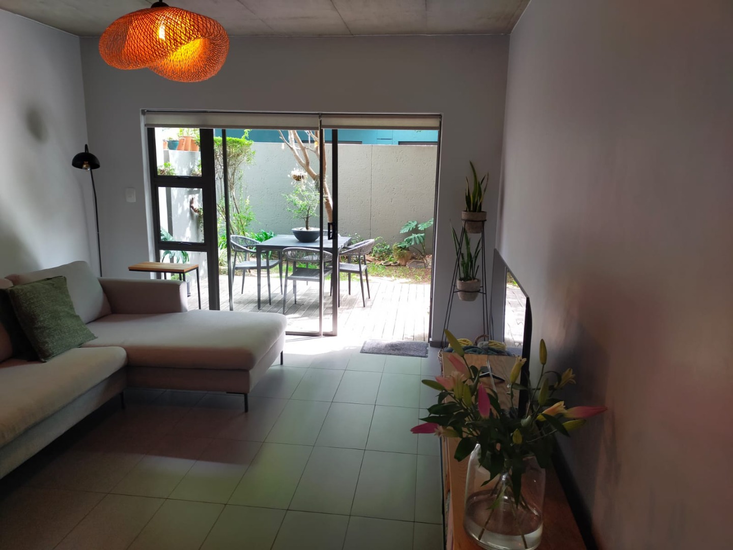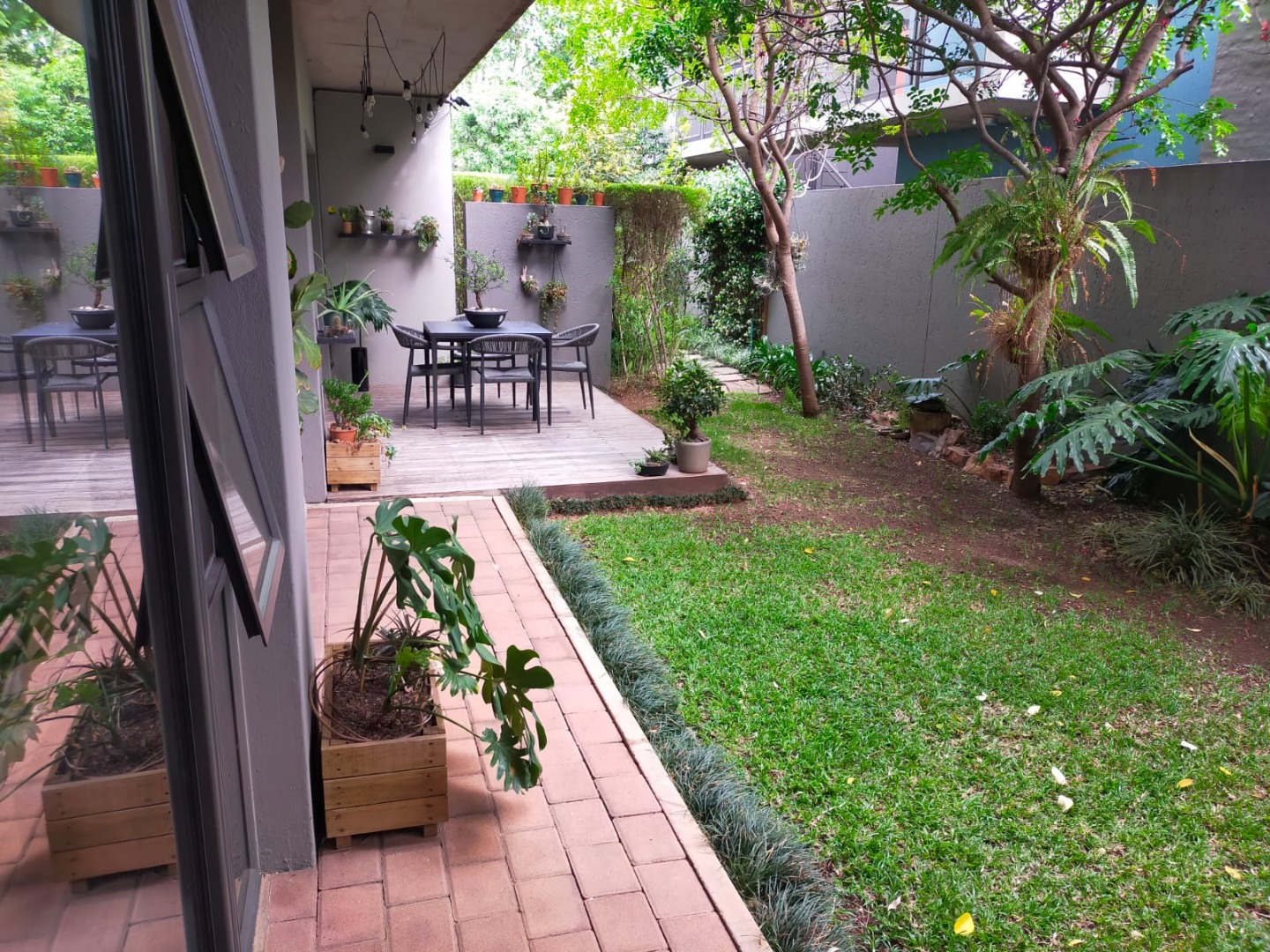 The property boasts a lush, tropical-style garden featuring a wooden deck and paved areas, ideal for relaxation and entertaining. Enjoy alfresco dining with the included modern outdoor set, or host a braai in your secluded space, surrounded by mature greenery and high privacy walls. The garden provides a serene escape, making it perfect for those who appreciate outdoor living.