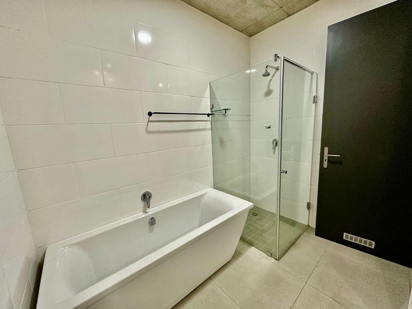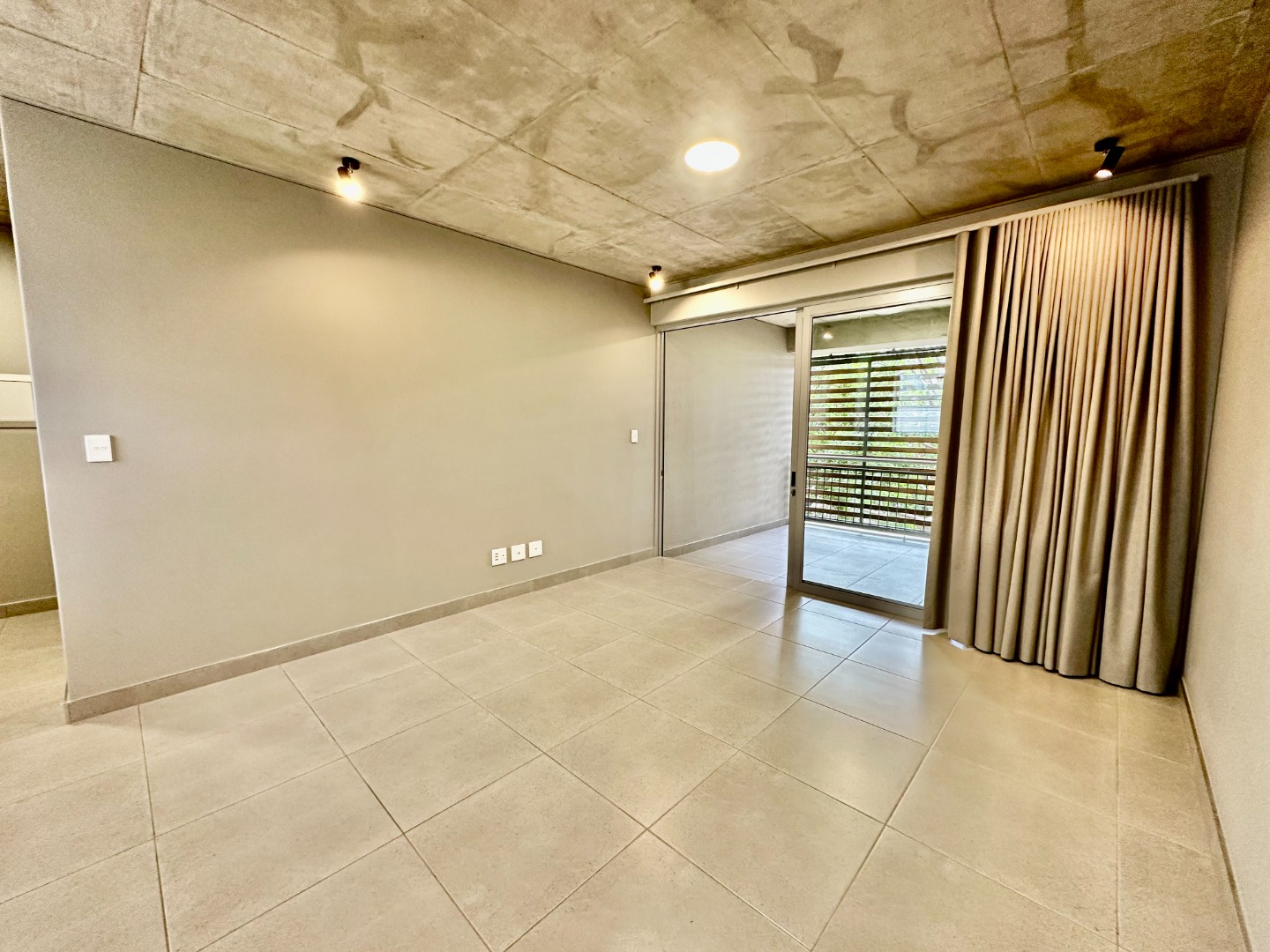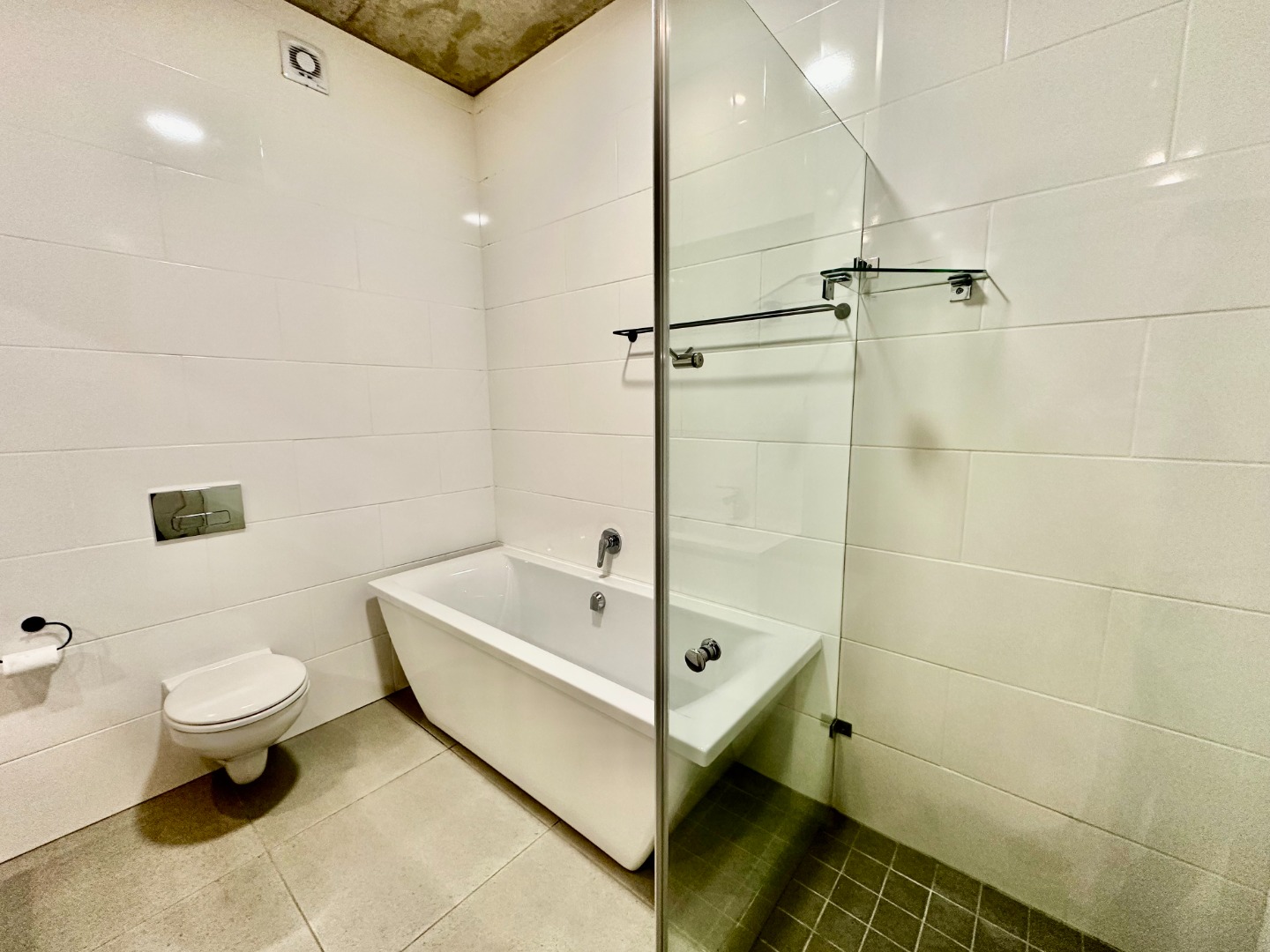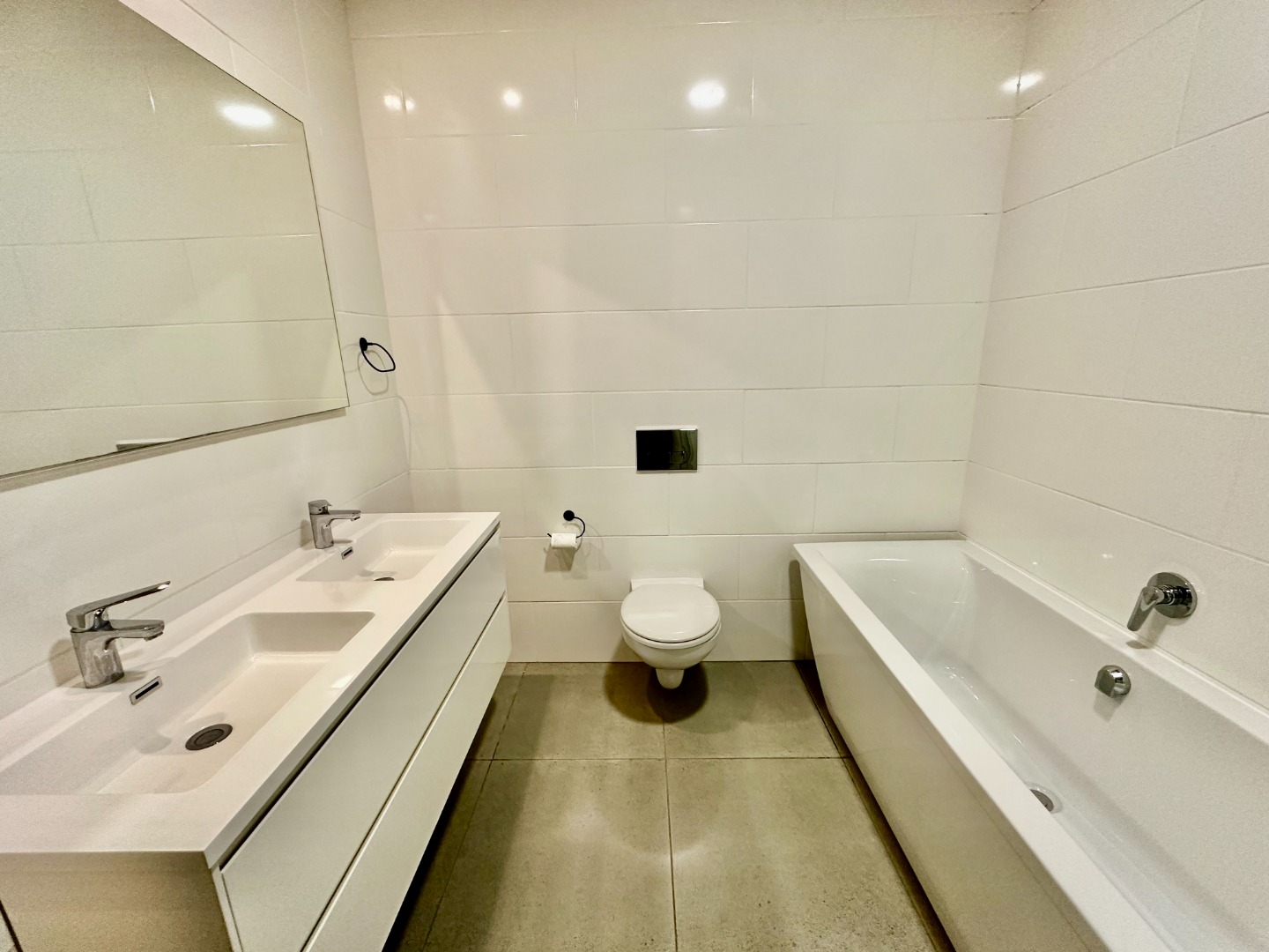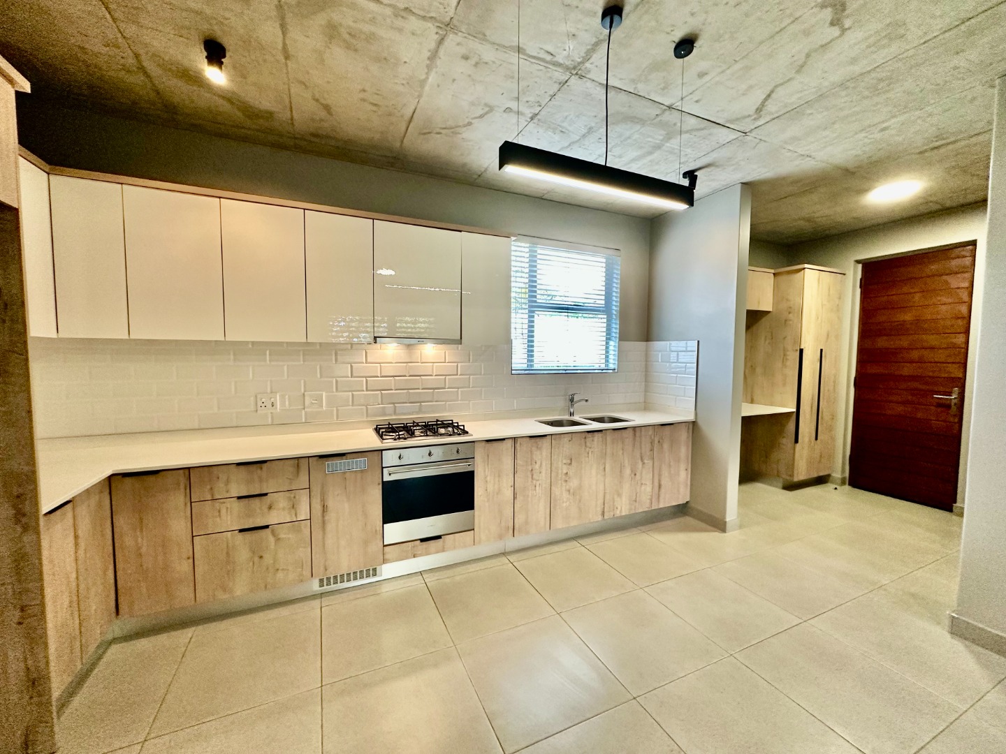 Spanning 104 sqm, the apartment boasts a contemporary open-plan design with an industrial-chic aesthetic, highlighted by exposed concrete ceilings and modern lighting. The heart of the home is a sleek kitchen, featuring light wood-look lower cabinets, high-gloss white upper cabinets, a white subway tile backsplash, and light-toned countertops. It comes equipped with a built-in oven, gas hob, extractor fan, and a double stainless steel sink, providing both functionality and style. The bright living area, with its neutral tiled floors and walls, seamlessly extends to a private balcony through large sliding glass doors, perfect for enjoying the scenic views and fresh air. A dedicated study nook offers a convenient workspace.
