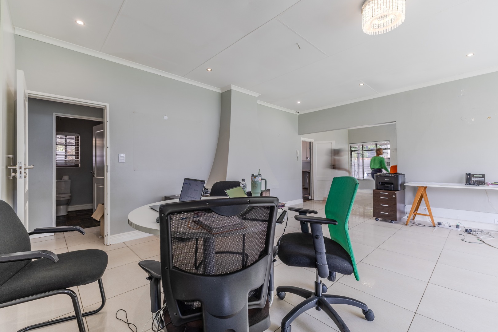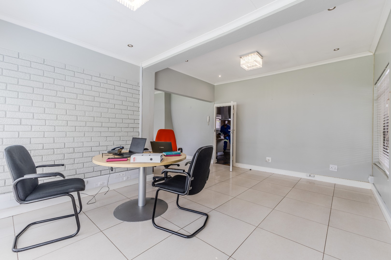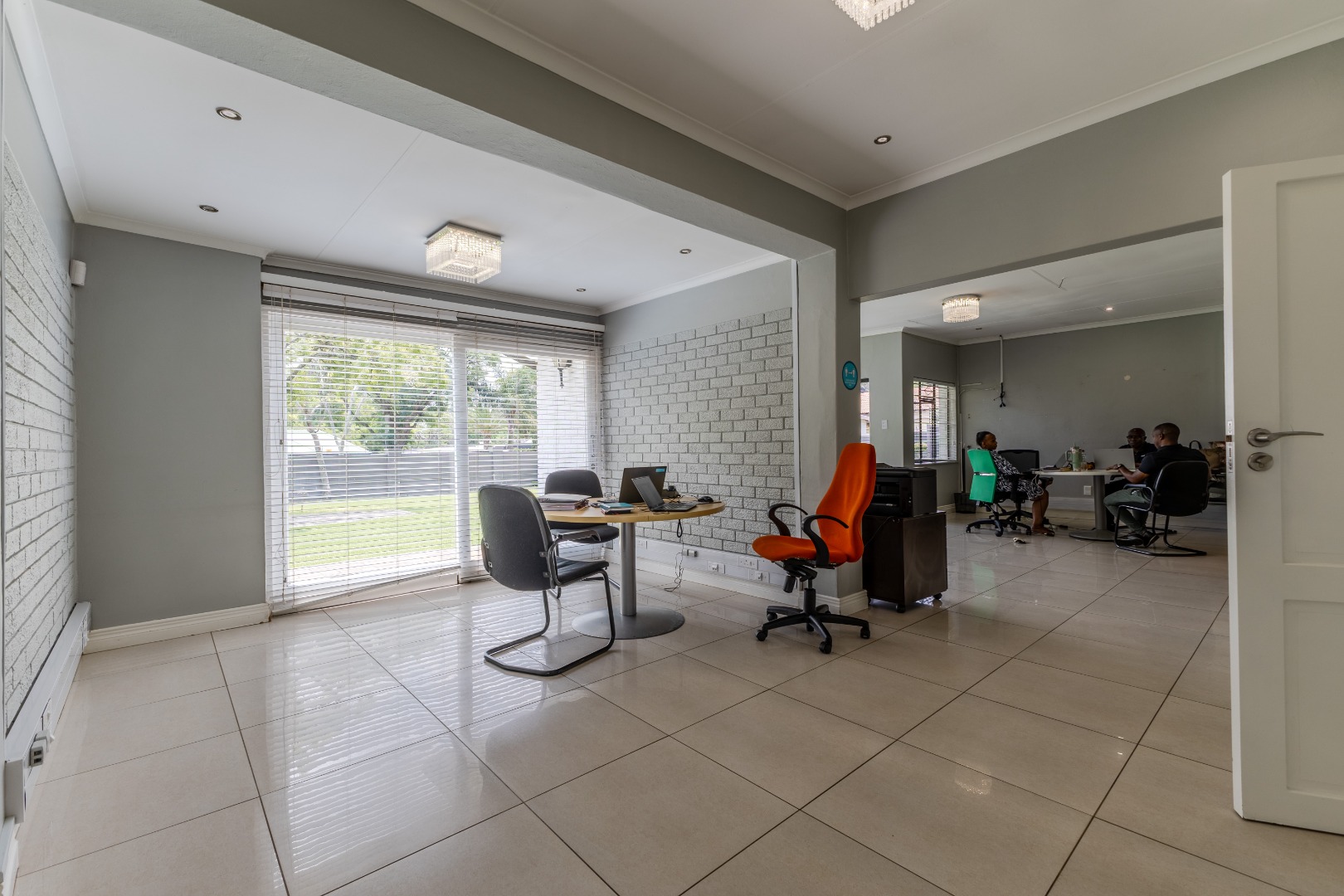 Set on a generous 2 234 sqm erf with 291 sqm under roof, the property boasts an abundance of space both inside and out. The interior is thoughtfully configured to accommodate a range of business operations, featuring a large boardroom, an open-plan office area, three private offices, and a spacious double-volume executive office. A notable advantage is the double garage that has been converted into additional office space, further enhancing the property's flexibility. Additional features include a secure vault, storage room, three restrooms, and a well-appointed kitchen with granite countertops and a separate scullery.