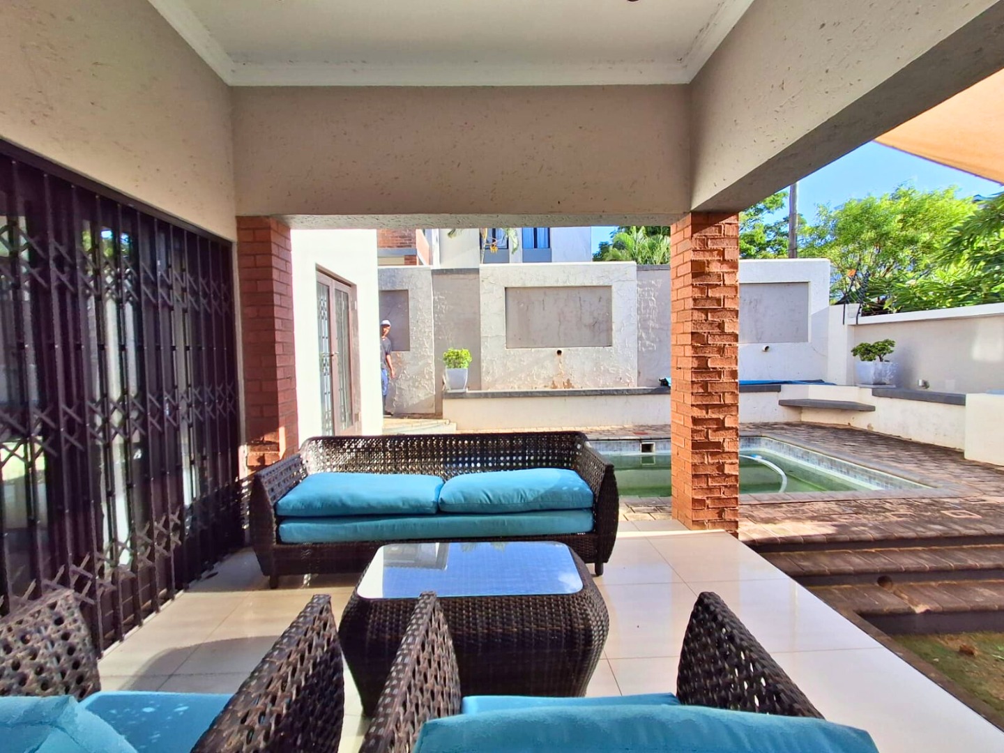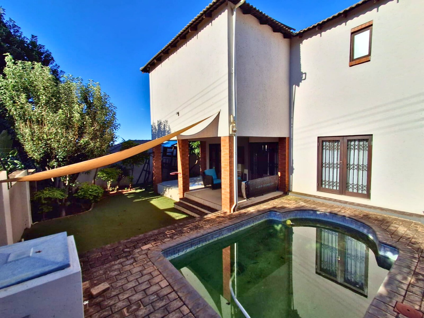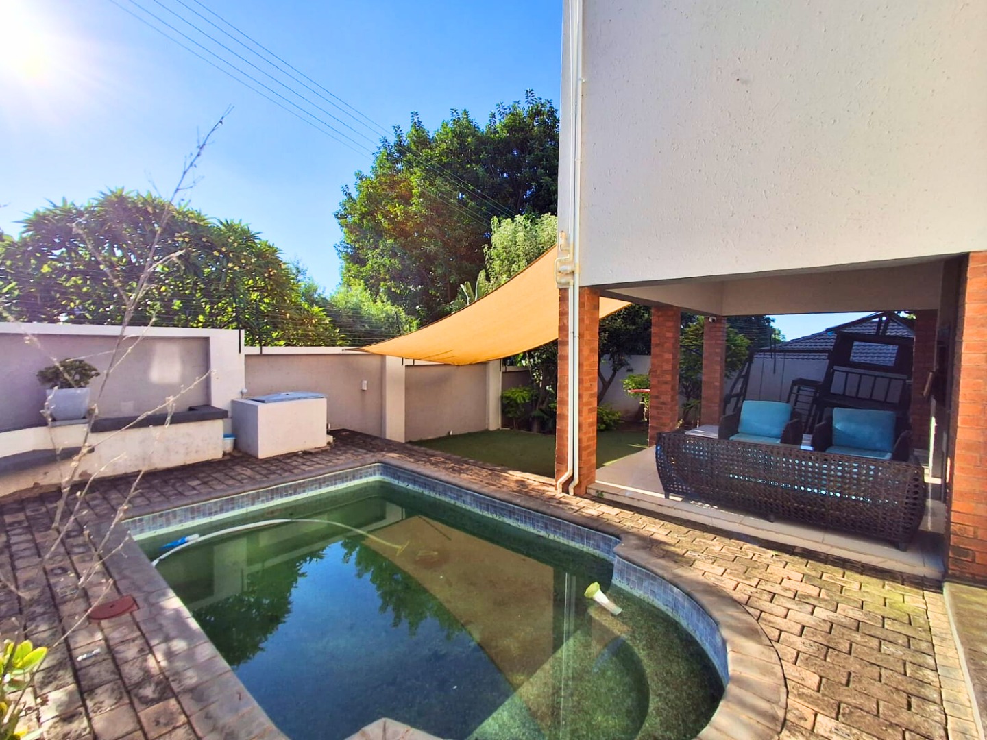 Step outside and enjoy your private garden with a small swimming pool, perfect for cooling off on warm days or enjoying outdoor relaxation.