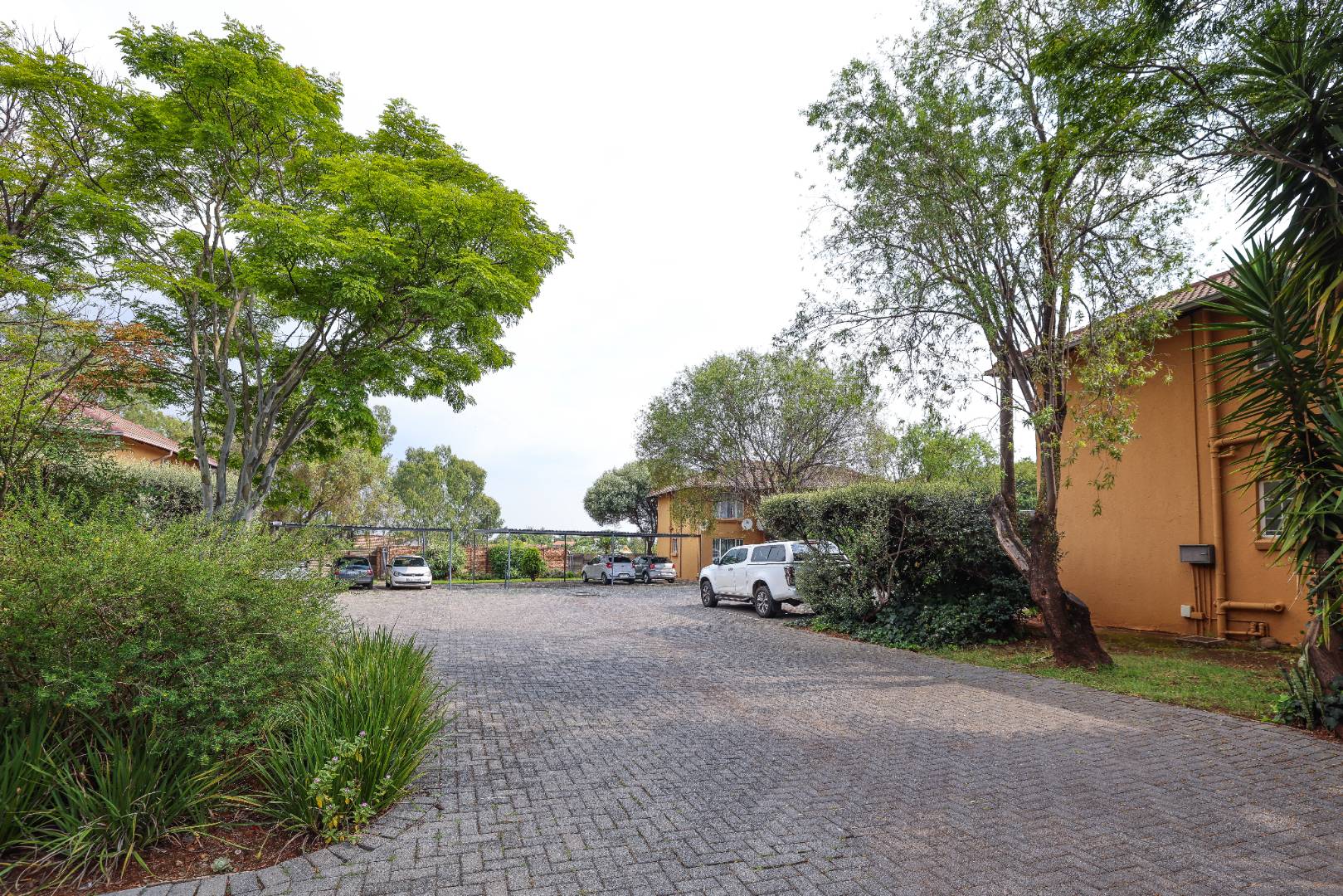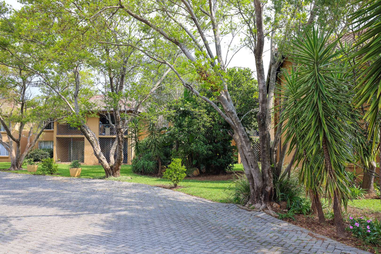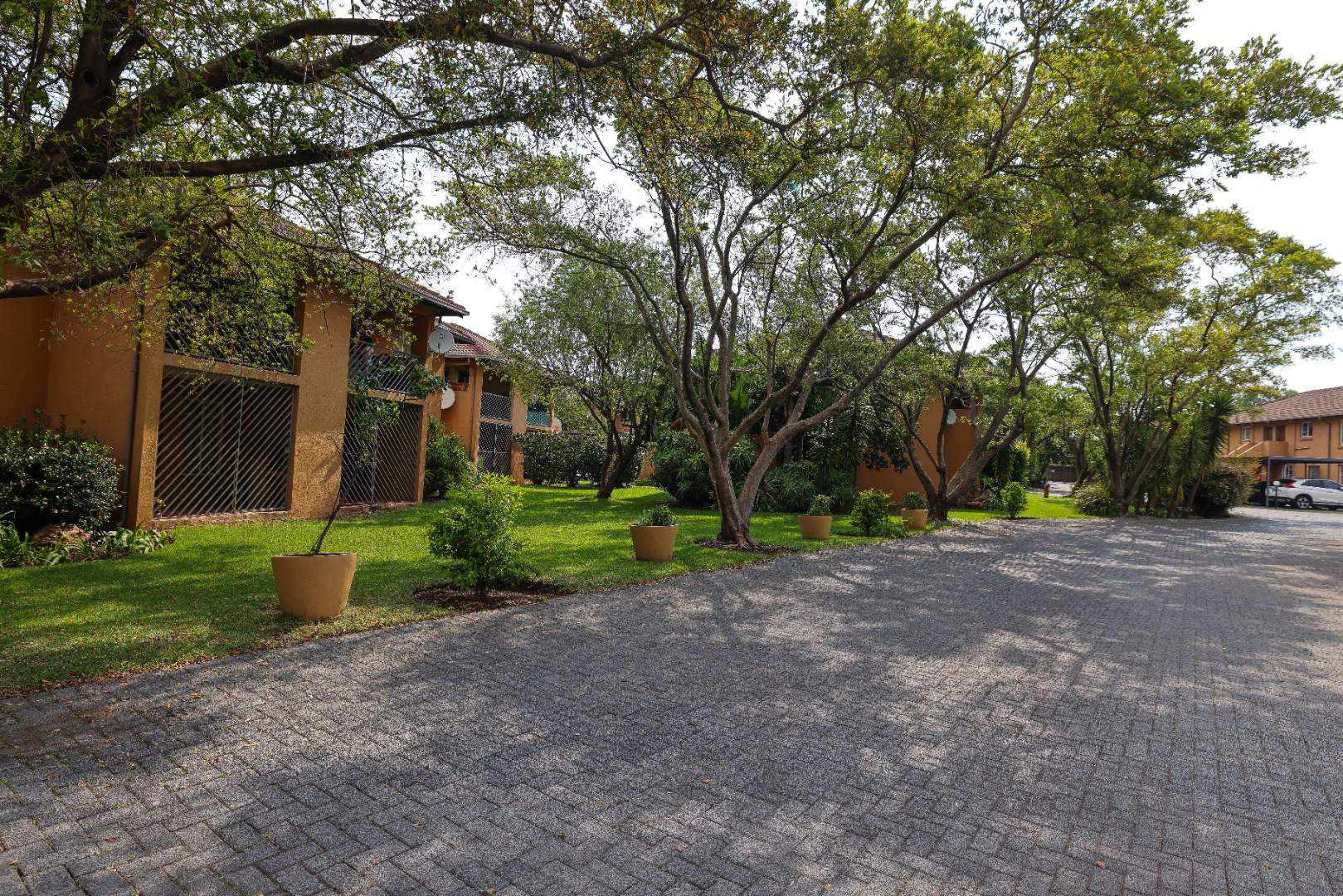 Friendly complex with trees and green areas.