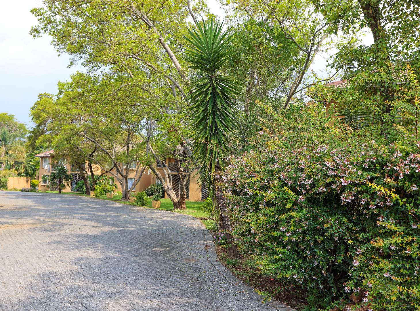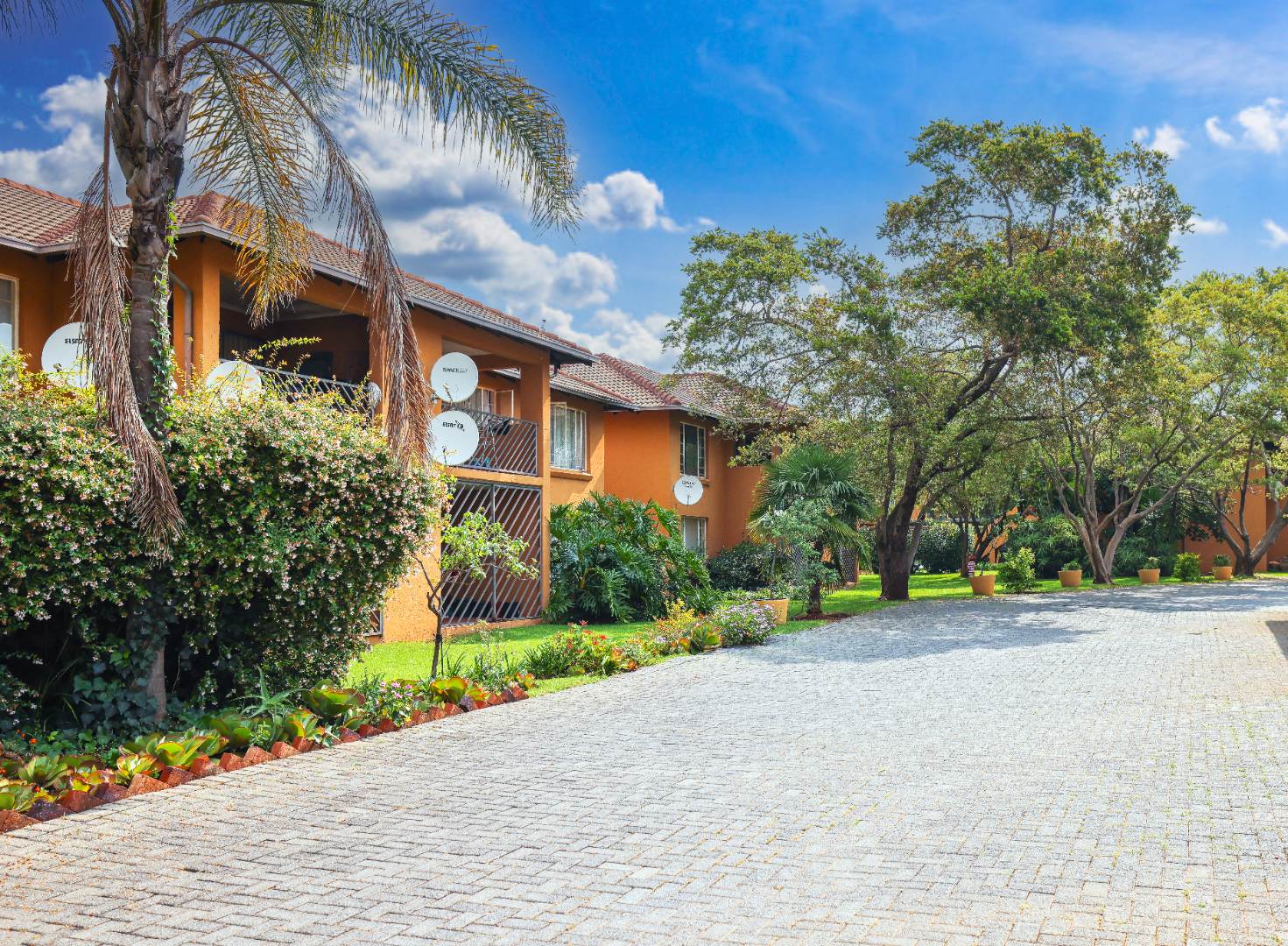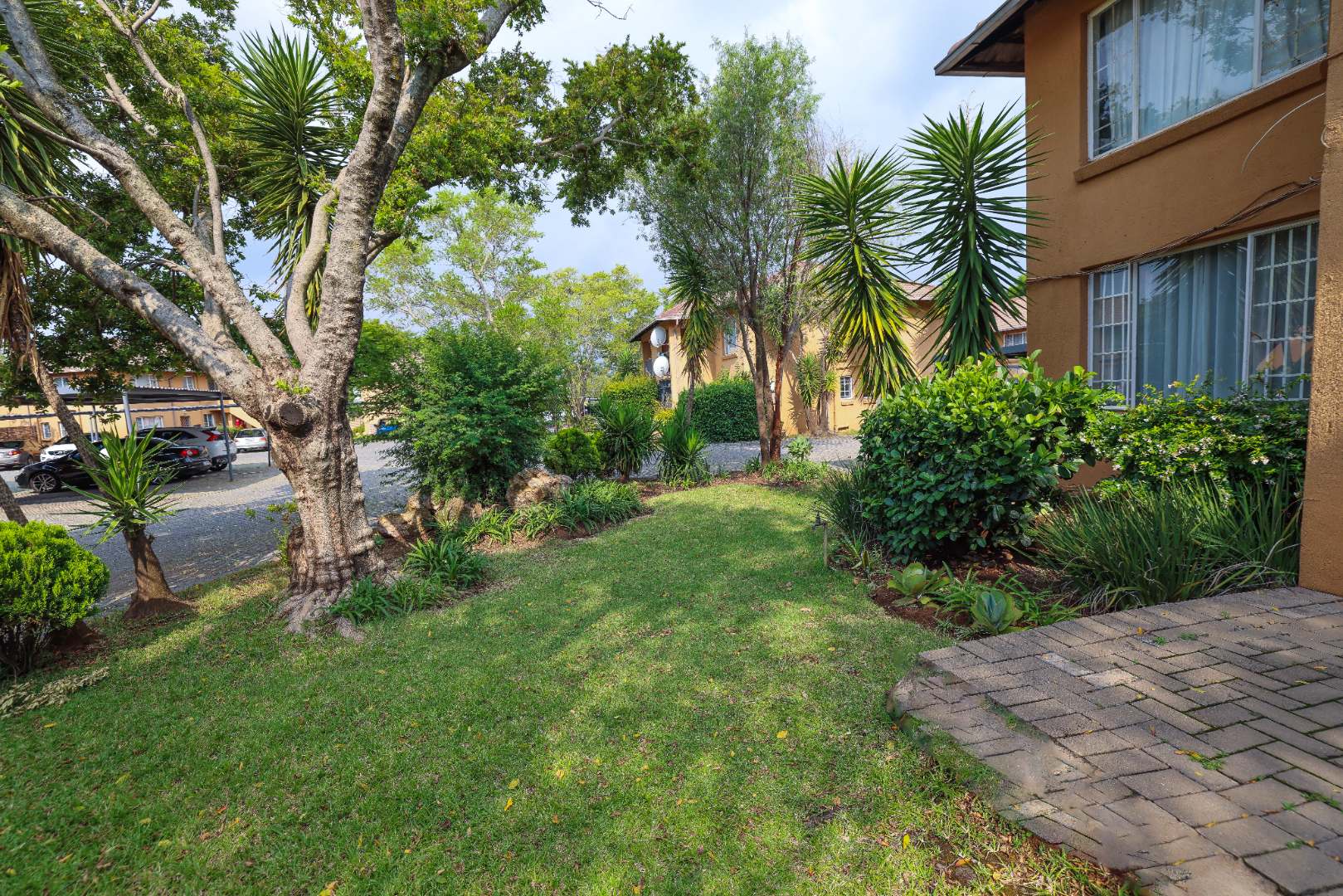 Friendly complex with trees and green areas.