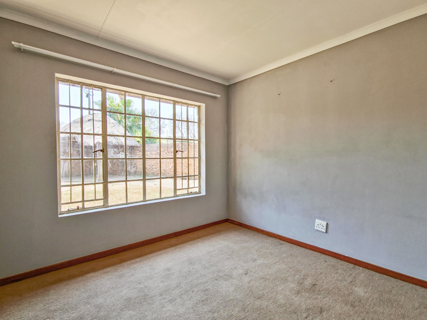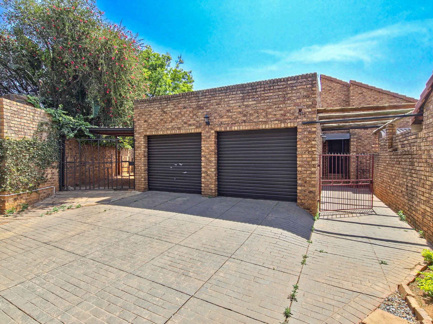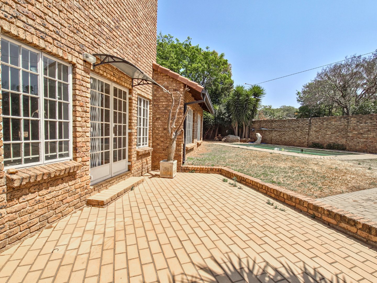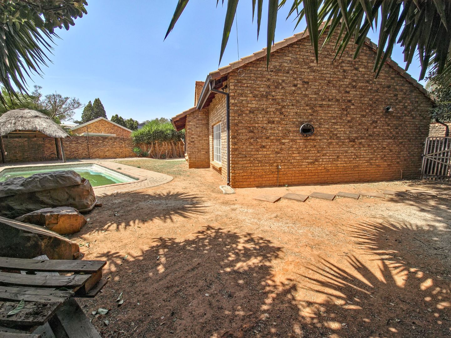 The property is offered in its current condition and requires general maintenance. The garden and pool are present but will need attention, and the property is situated next to a busy road. Double garages, a carport, prepaid electricity and fibre ready
