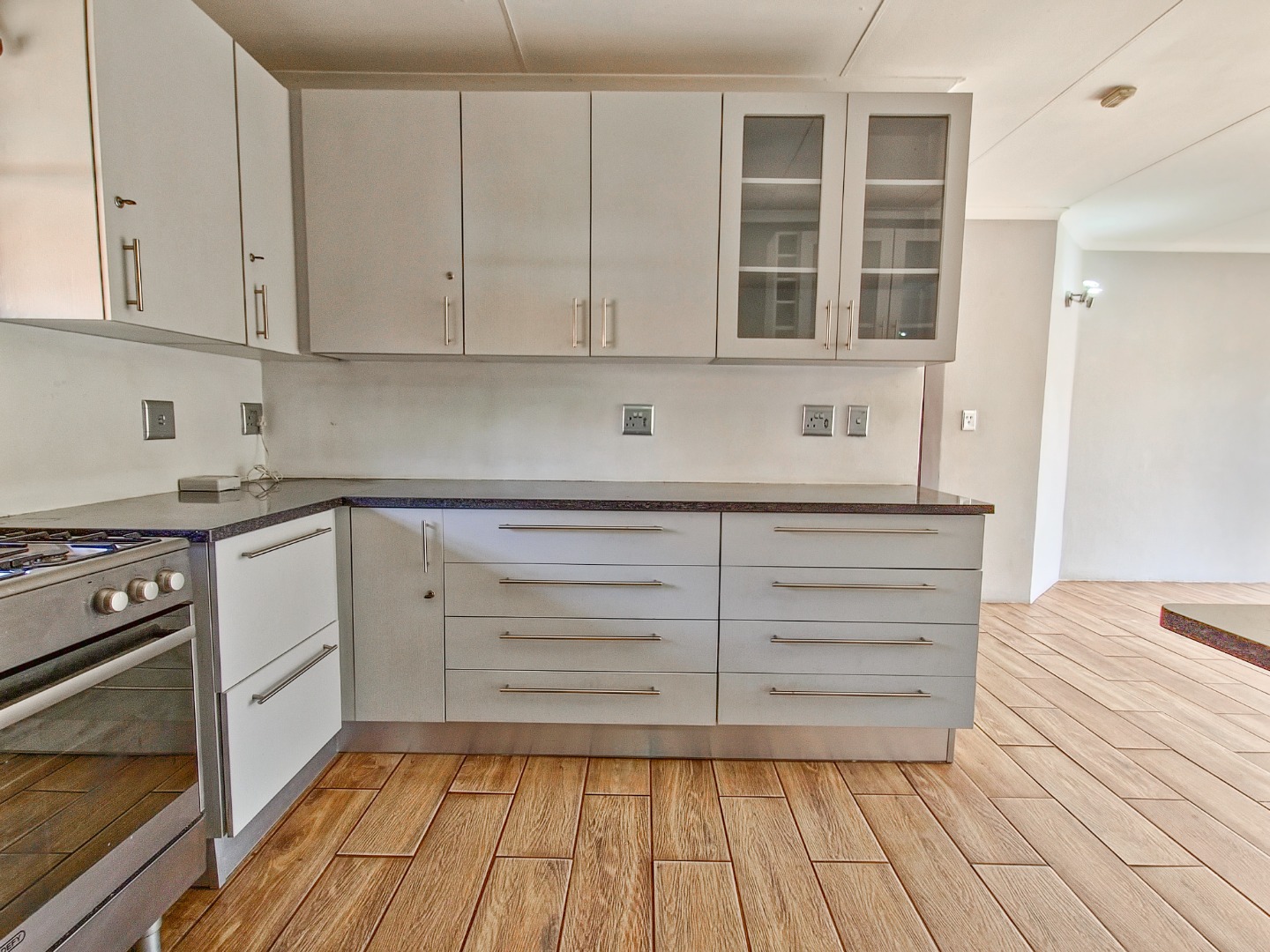 All three bedrooms include built-in cupboards. The main bedroom features a walk-in closet and an en-suite bathroom, while a second bathroom services the remaining bedrooms. The home offers a separate dining room and lounge, providing ample indoor living space. The kitchen includes a gas stove and a separate scullery.