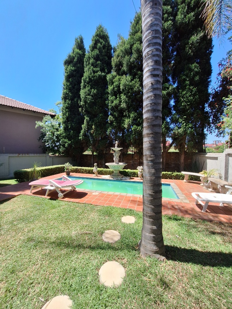 Step outside to a private oasis designed for relaxation and entertainment. The property includes a delightful patio with a built-in braai, perfect for outdoor dining. A private swimming pool with a decorative fountain is set within a lush, well-maintained garden, offering a serene escape. Mature trees and structured hedges enhance privacy, creating an ideal environment for families and pet owners, as pets are allowed. The estate also provides access to a clubhouse, further enhancing the lifestyle offerings.