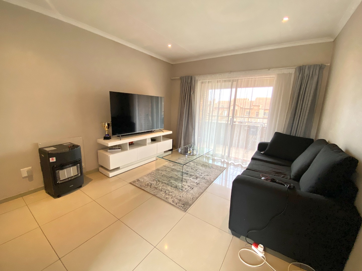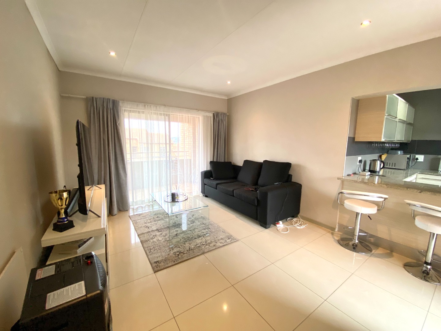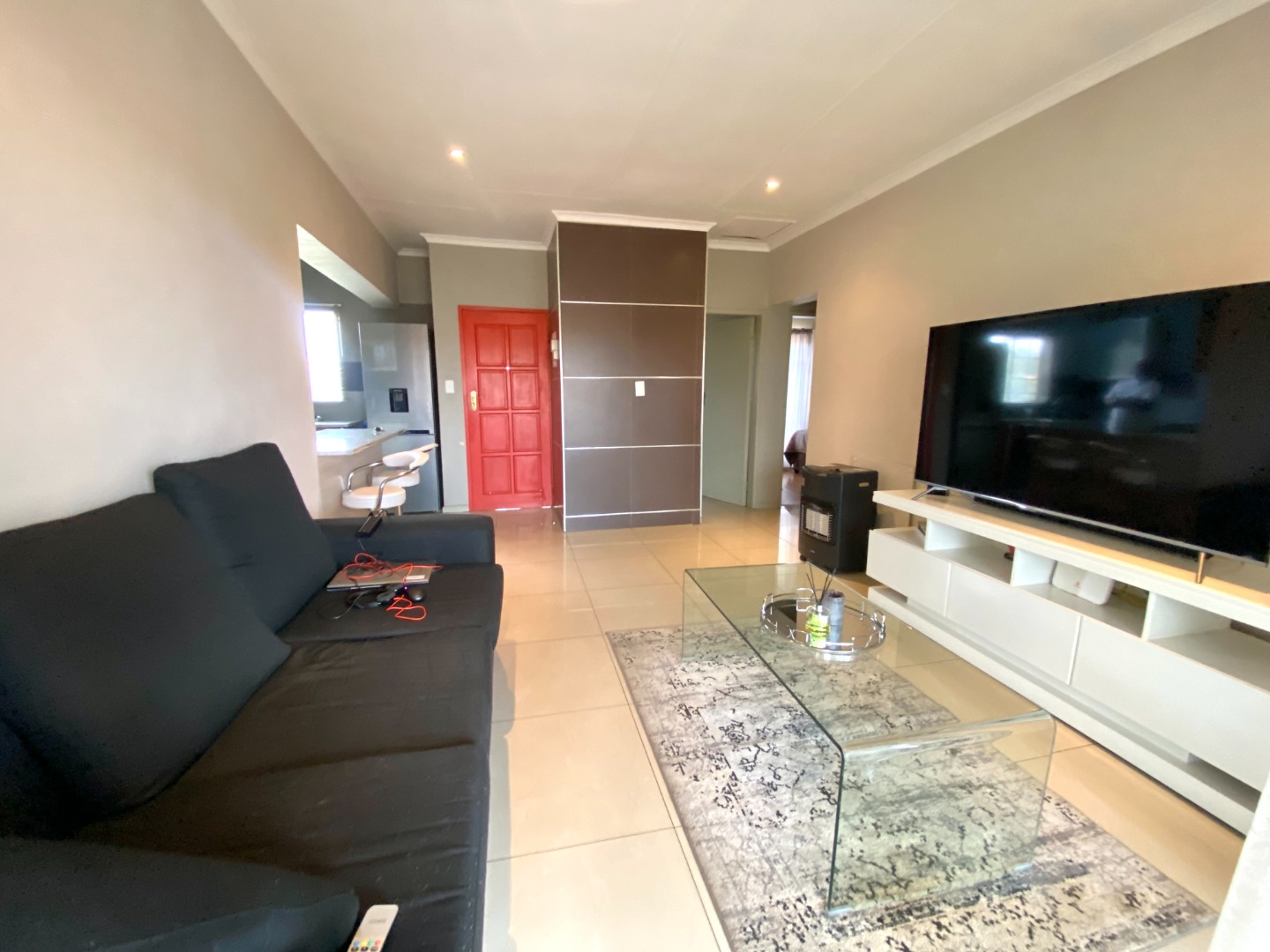 The spacious lounge is the heart of this home, featuring soft dimmable lighting to set the perfect mood and panel heaters to keep things cozy. It opens out onto a lovely balcony where you can enjoy some quiet time or morning sunshine. The kitchen flows seamlessly into the lounge, creating a modern open-plan layout that feels bright and welcoming.
