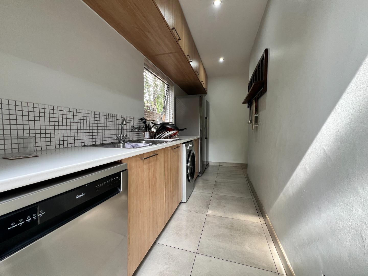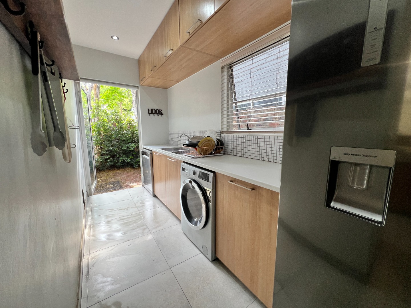 This home features three bedrooms, with the main bedroom en suite, and a light-filled open-plan living area that flows into a modern kitchen. The kitchen is fitted with a fridge/freezer, dishwasher, and dual washing machine, making everyday living effortless.